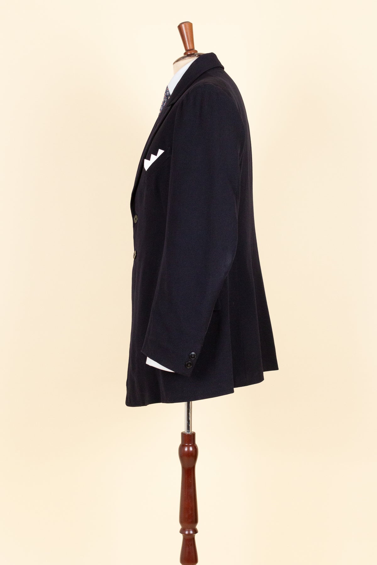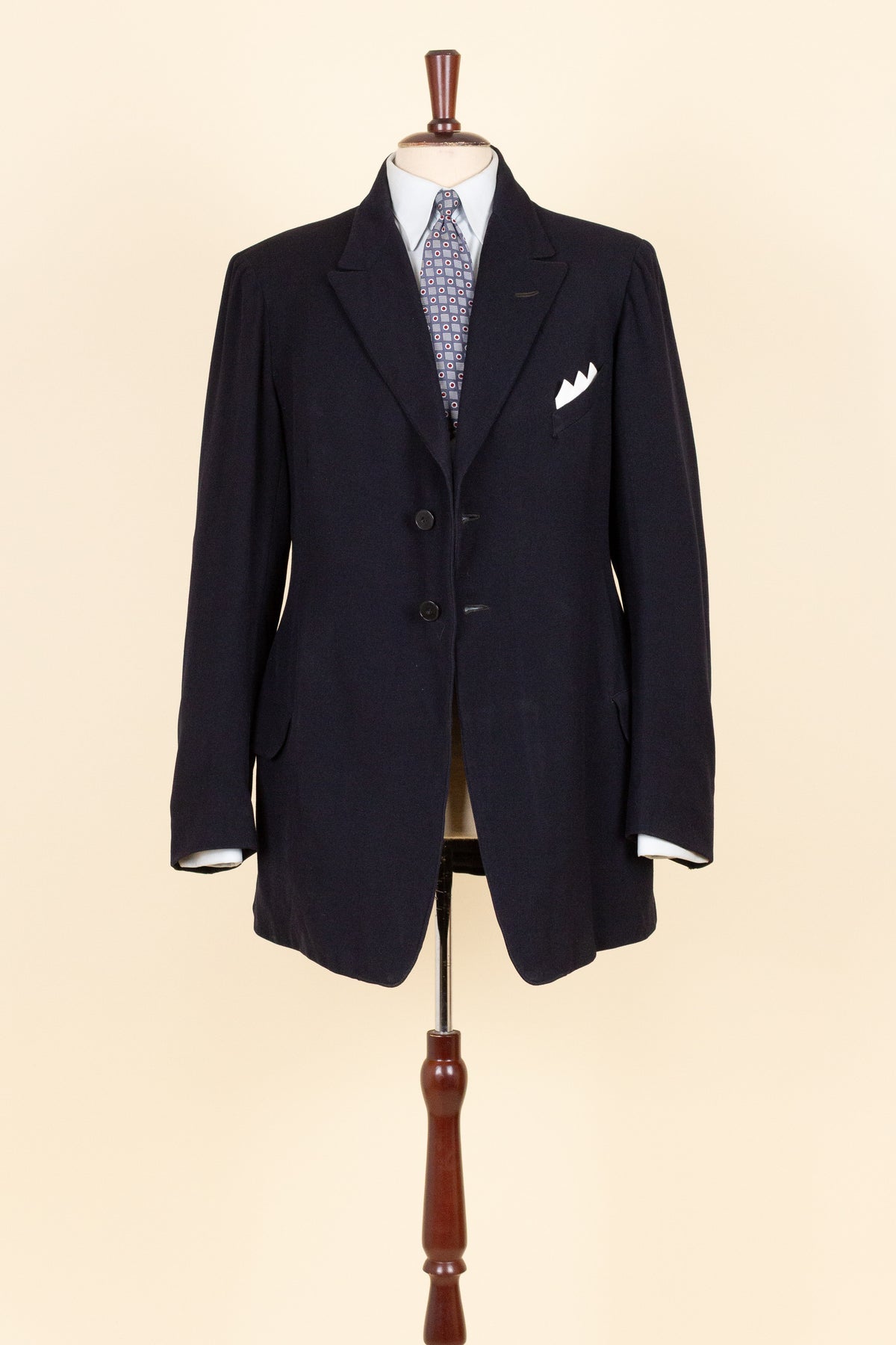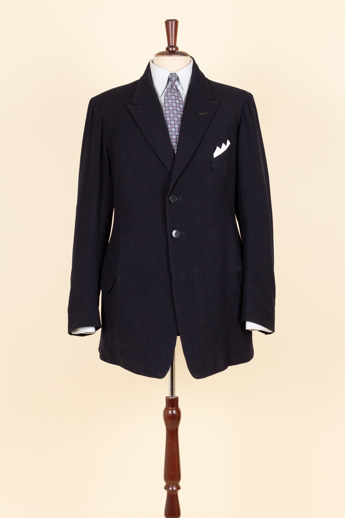 The jacket is single-breasted and fastens with two buttons. It has horizontal front pockets with flaps and a breast pocket — characteristically slanted for the period. There is a buttonhole in the left lapel. The cuffs feature two relatively large buttons. At the back it is straight and has a vent. Internally, the jacket is fully lined and has an inner pocket on the right-hand side.