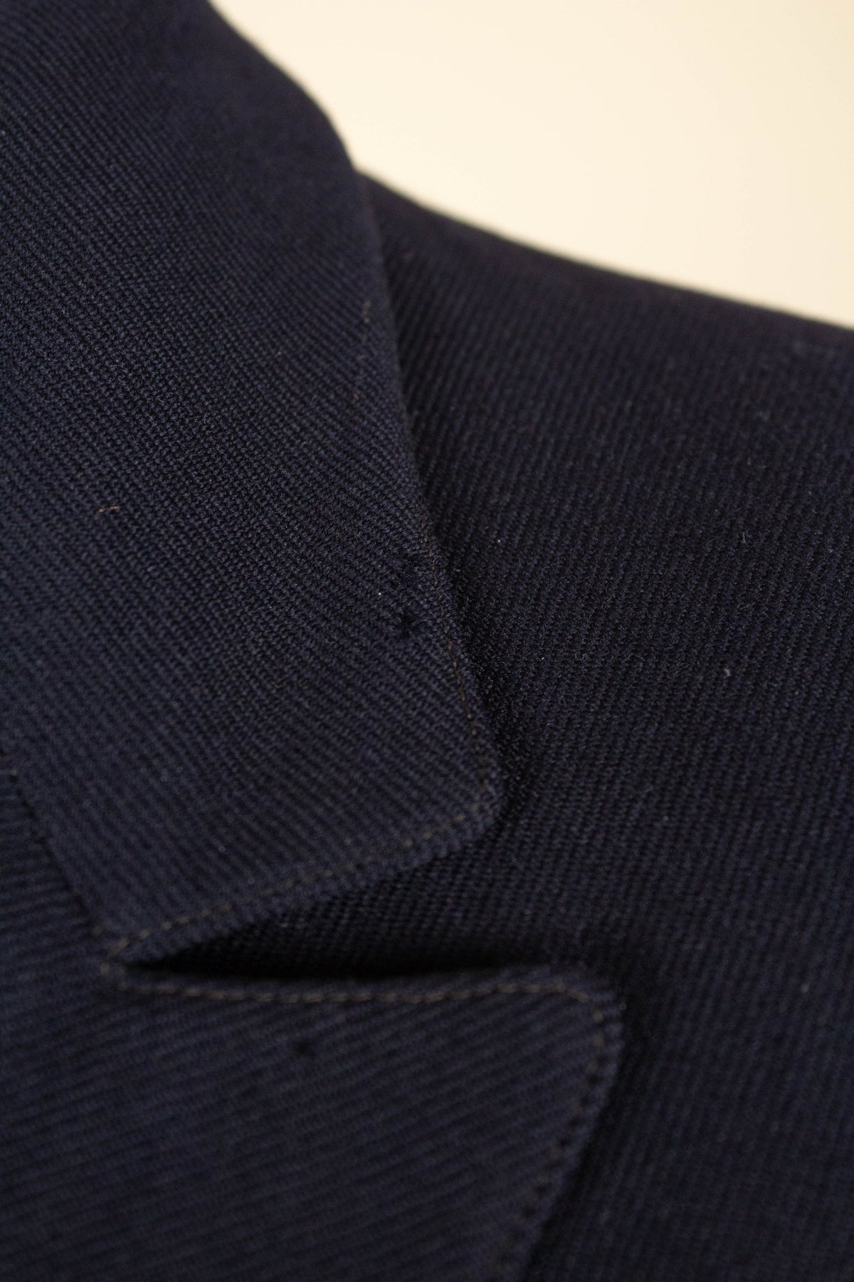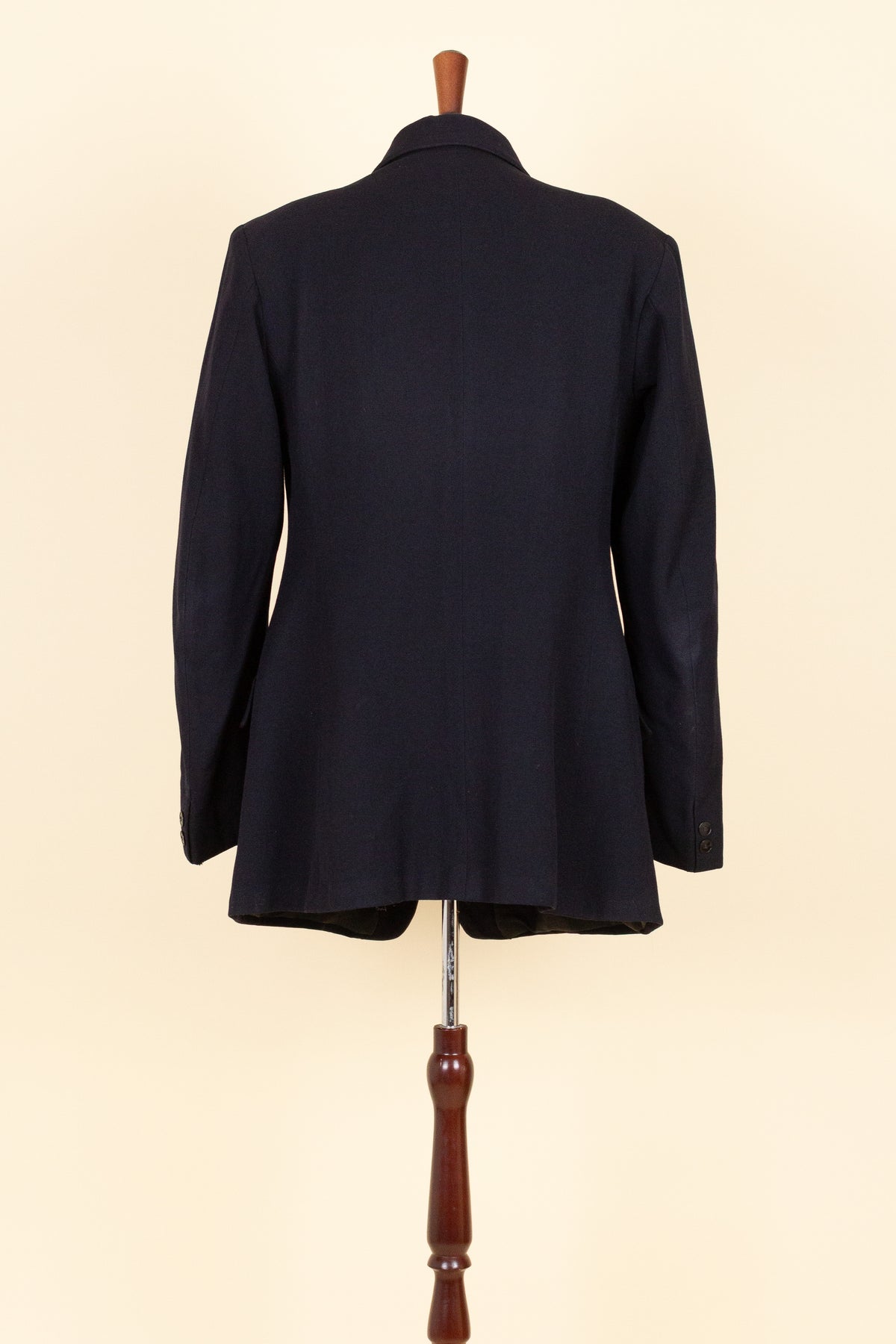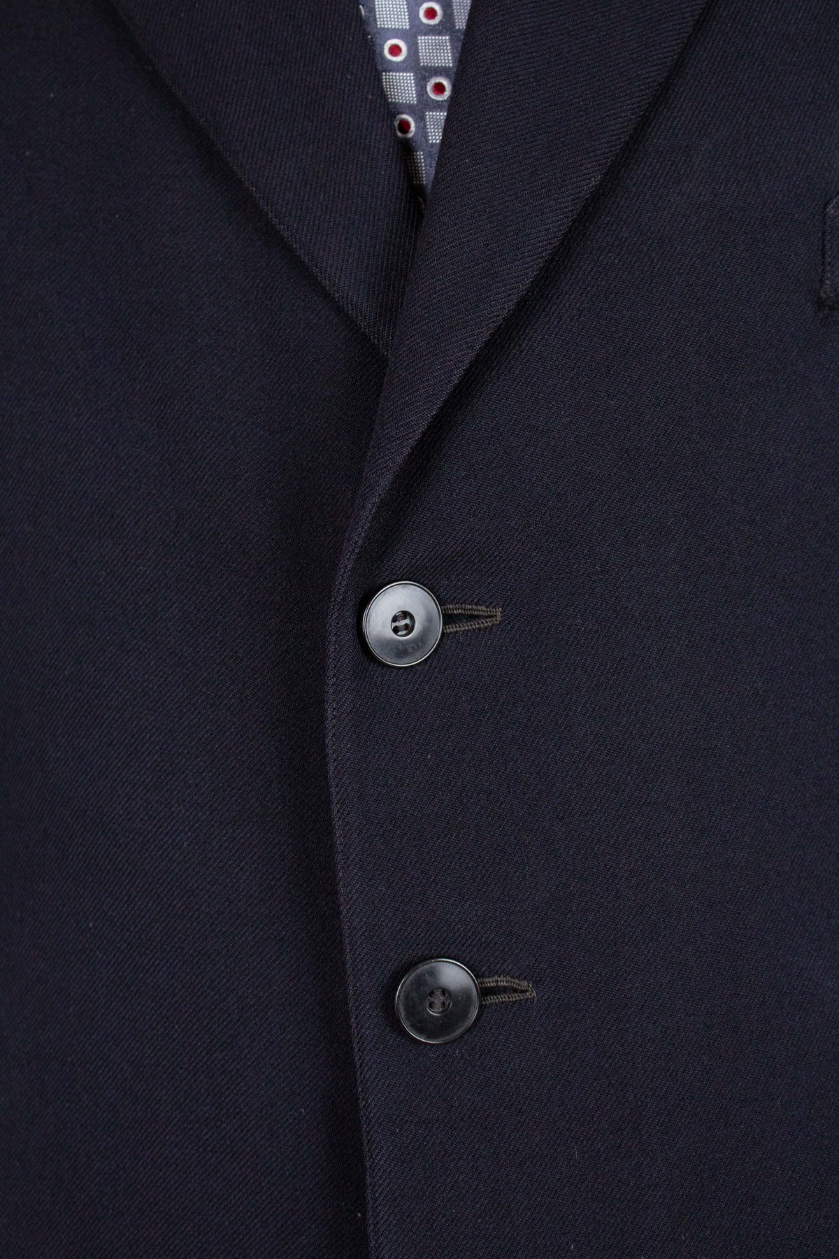 The jacket is single-breasted and fastens with two buttons. It has horizontal front pockets with flaps and a breast pocket — characteristically slanted for the period. There is a buttonhole in the left lapel. The cuffs feature two relatively large buttons. At the back it is straight and has a vent. Internally, the jacket is fully lined and has an inner pocket on the right-hand side.