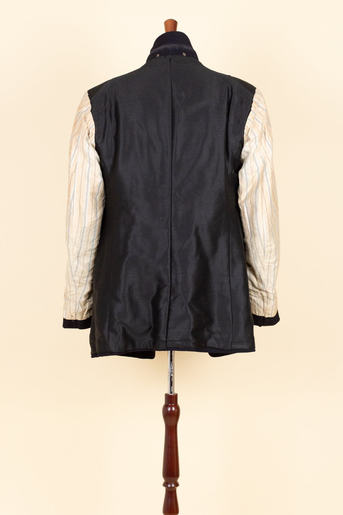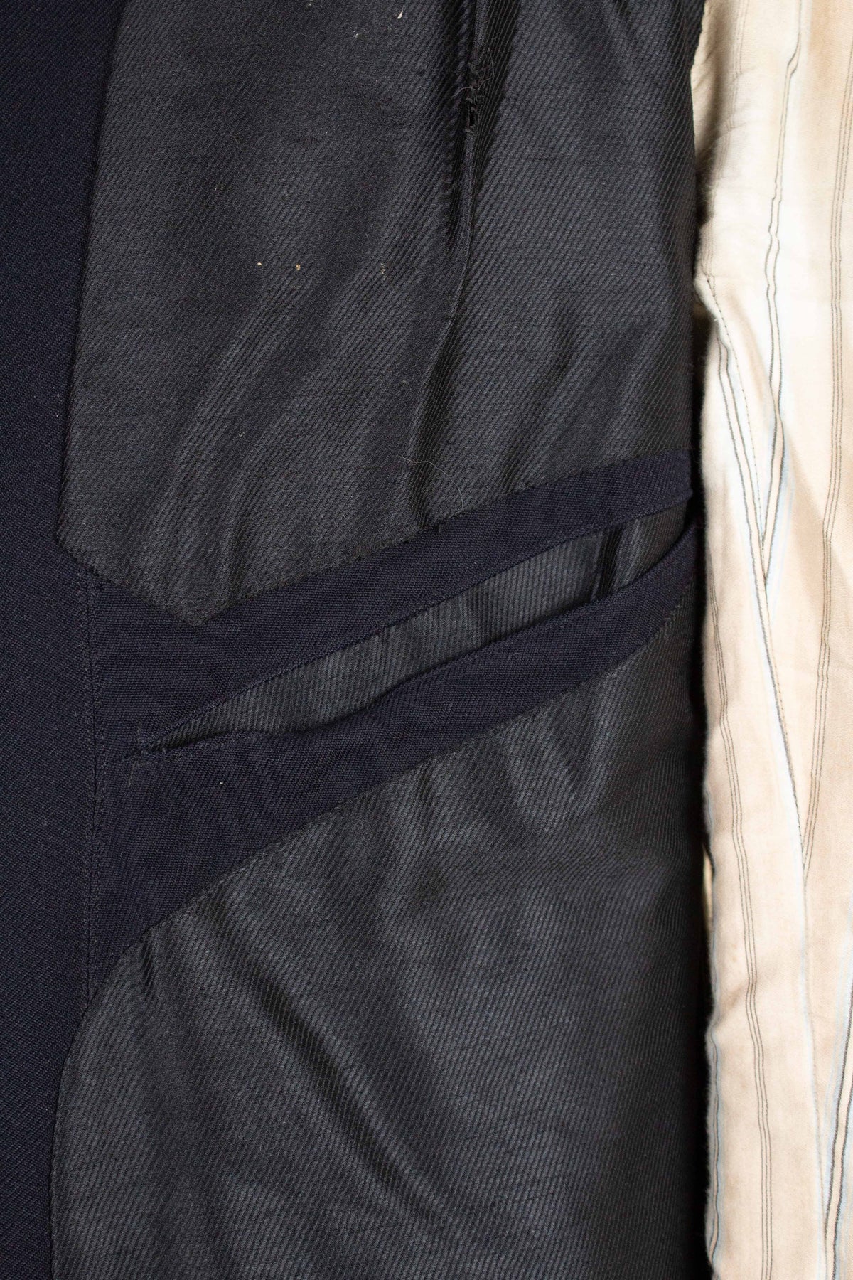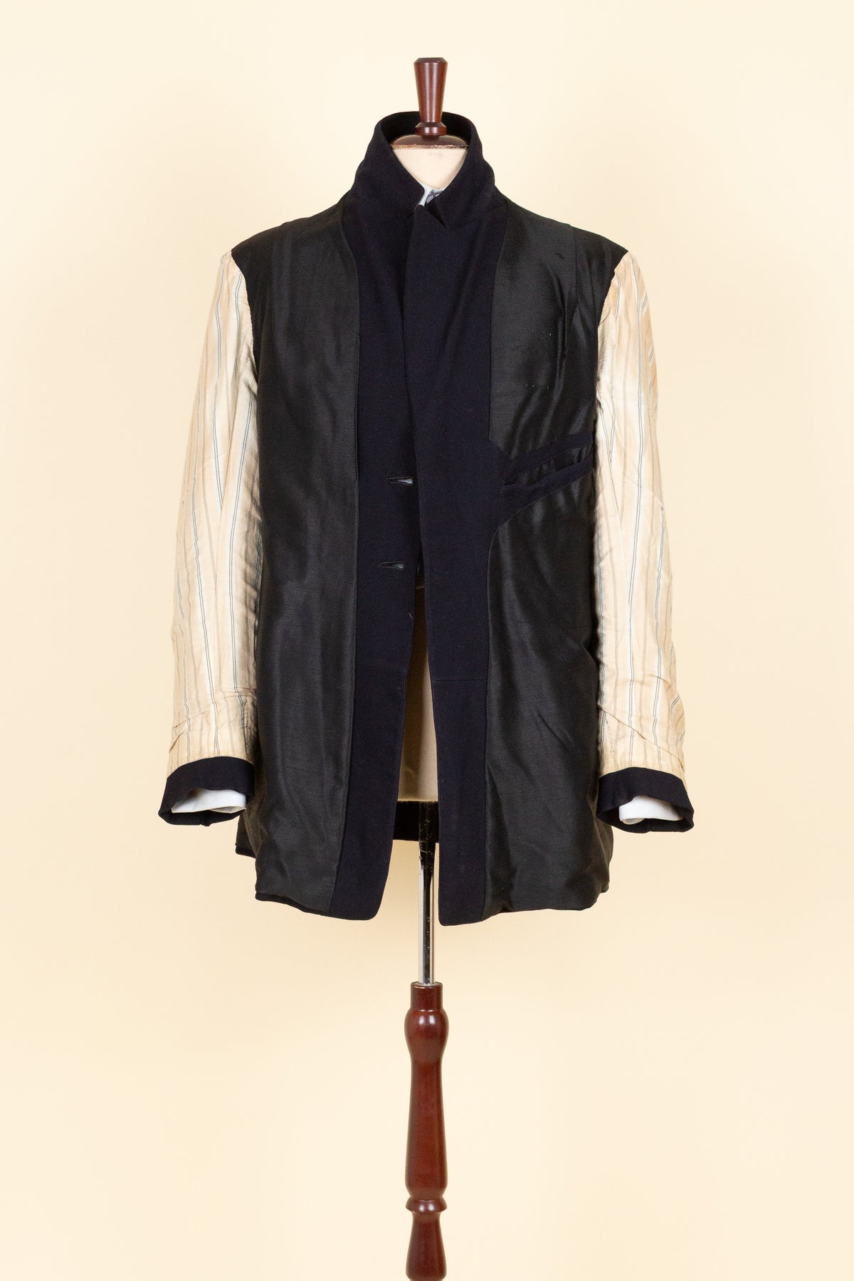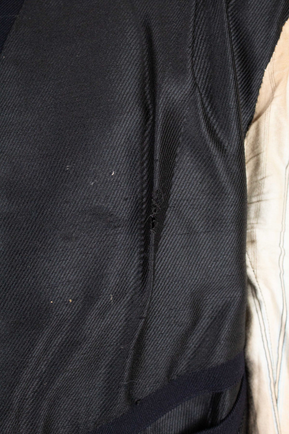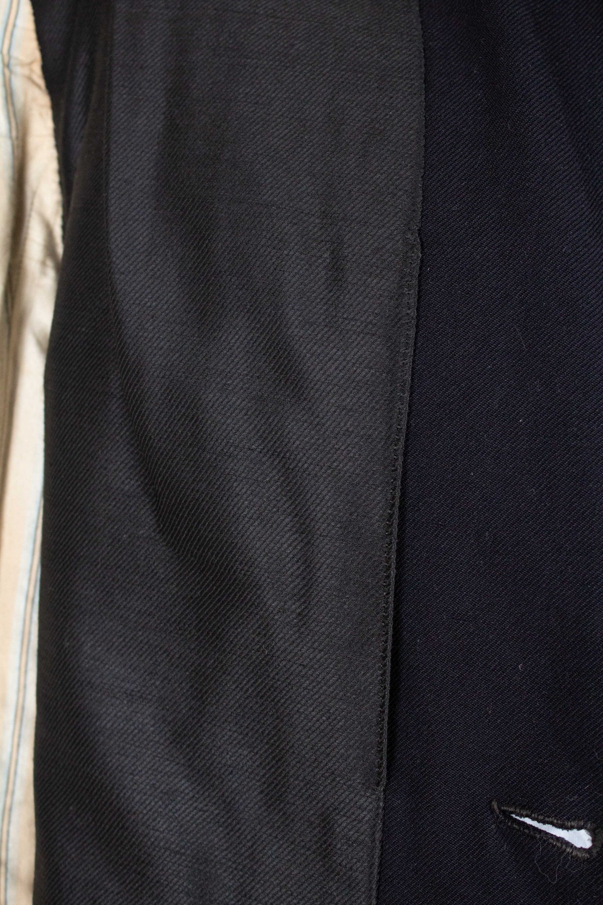 This odd jacket is of Swedish origin. It appears to be bespoke, although there are no labels present, so its exact origin cannot be determined. It was made sometime during the 1910s or 1920s. The jacket is made from a black cloth with a fairly pronounced twill structure.