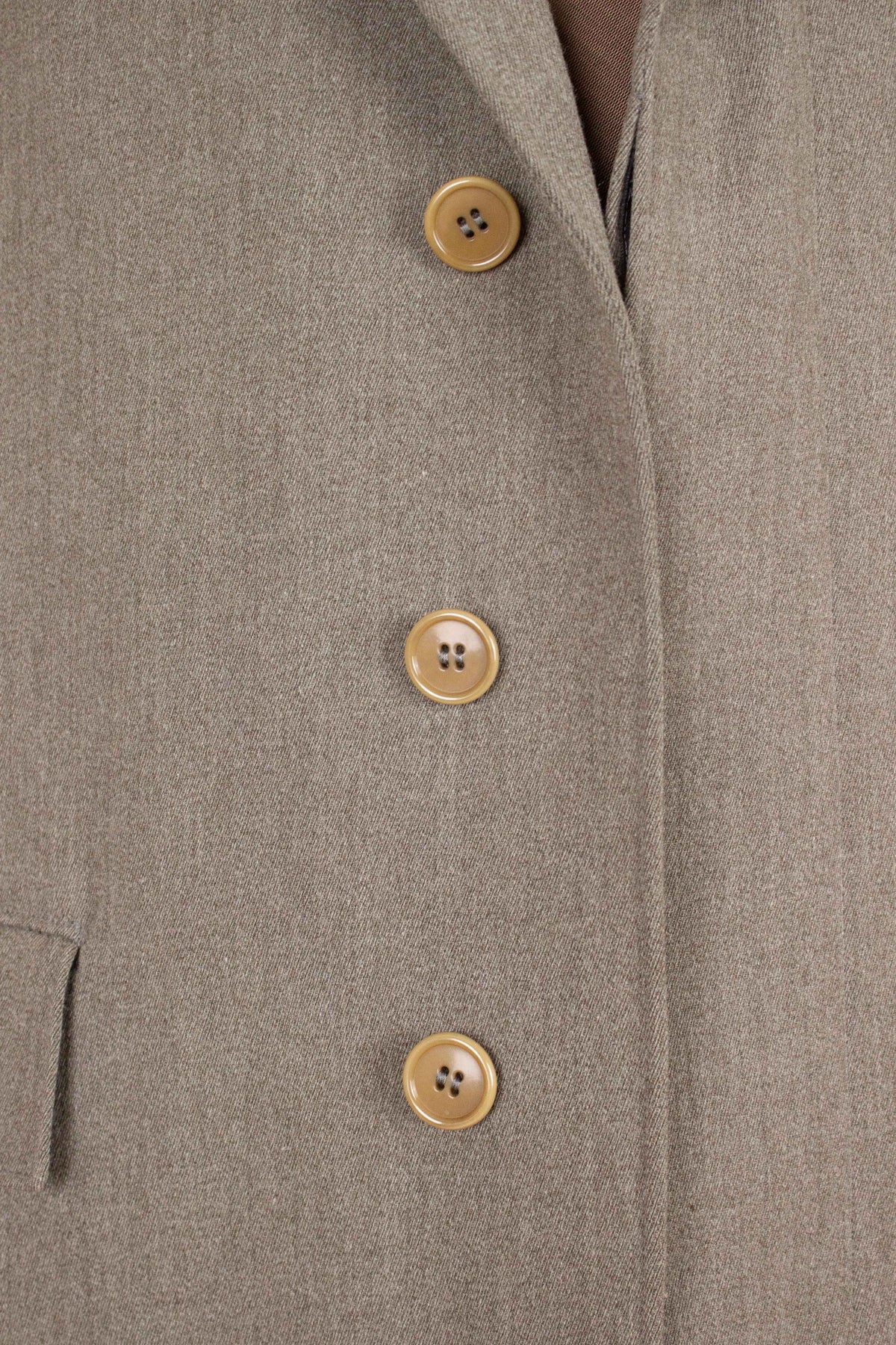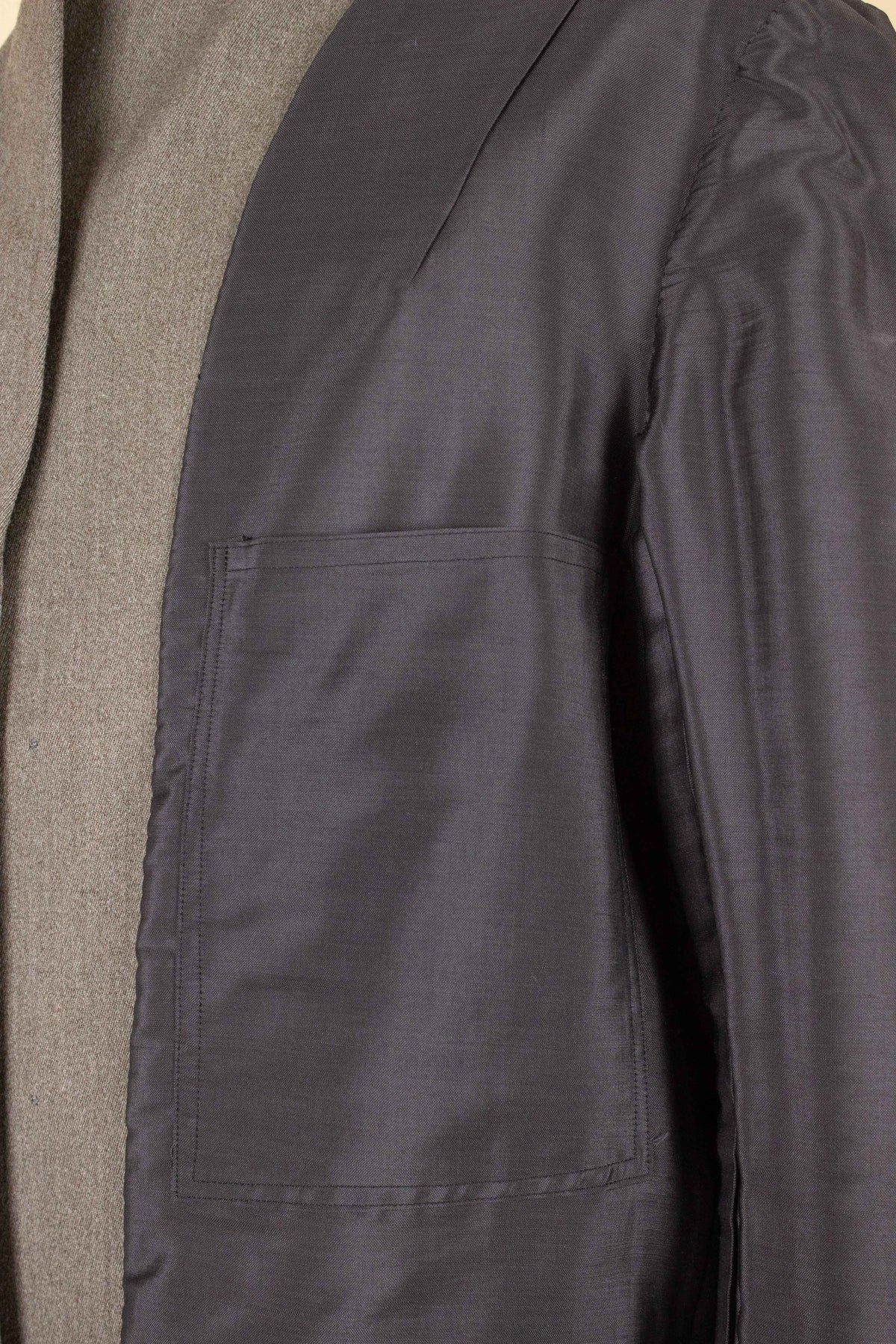 The coat features a number of details that are very characteristic of the period. Notably, it has relatively narrow, sloping shoulders, with low-set shoulder seams. The fabric is also typical of the 1920s: a heavy brown-grey cloth with a subtle twill weave.