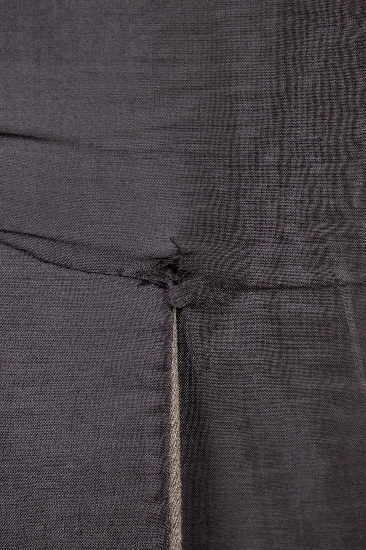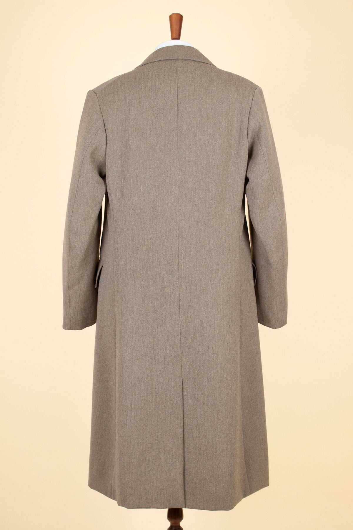 The coat is single-breasted and fastens with four buttons in a concealed placket. It has horizontal front pockets with substantial flaps. The lapels are relatively wide and do not have buttonholes. The back is straight with a centre vent. It is fully lined on the inside with the aforementioned newer lining, and has an interior pocket on the left-hand side.