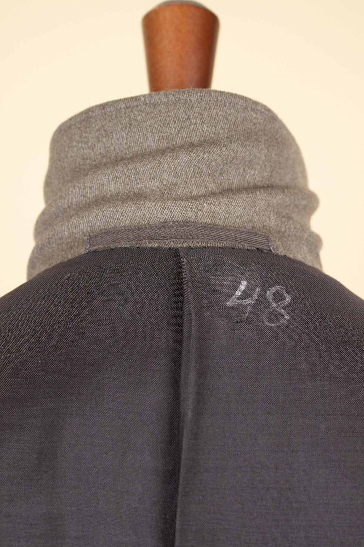 Someone has handwritten "48" on the lining just below the collar. However, this does not quite match the actual size. Converted to modern sizing, it corresponds to a EU 46 (UK/US 36). Please scroll down for precise measurements.