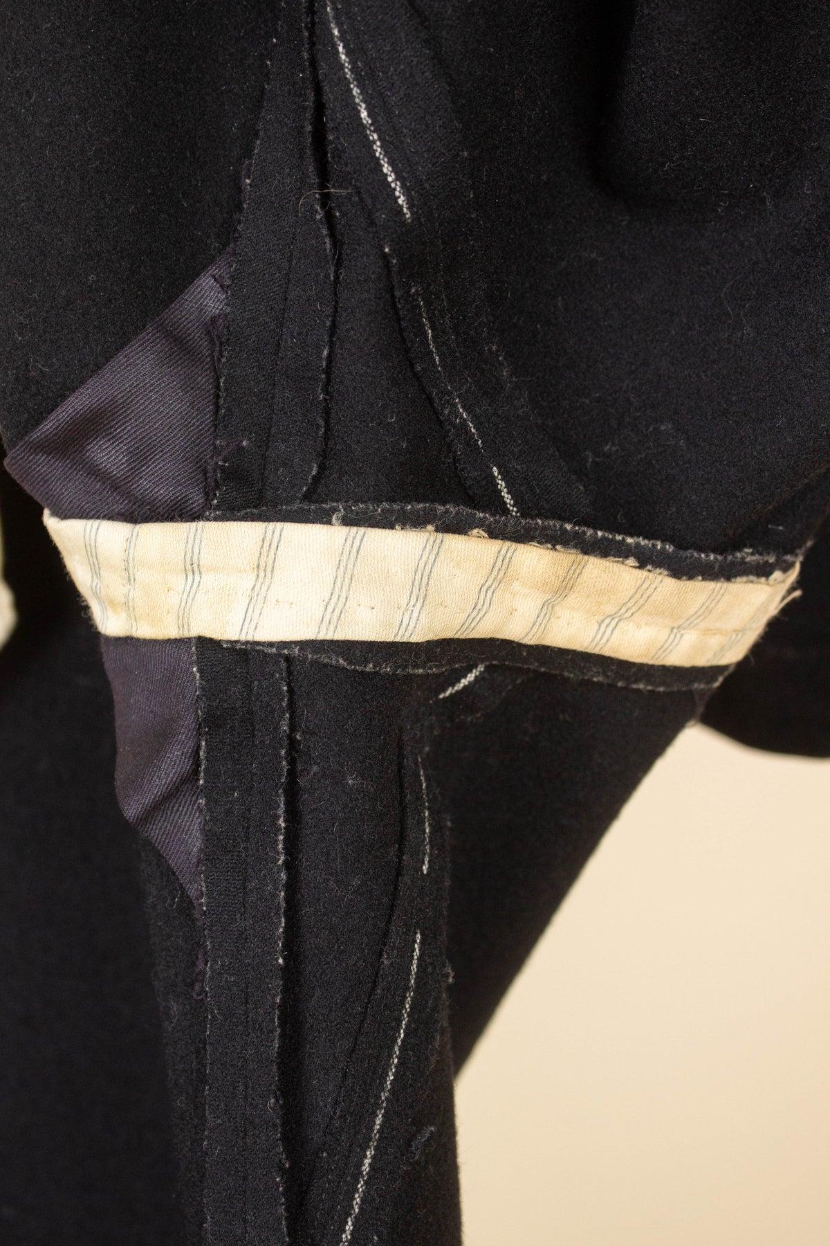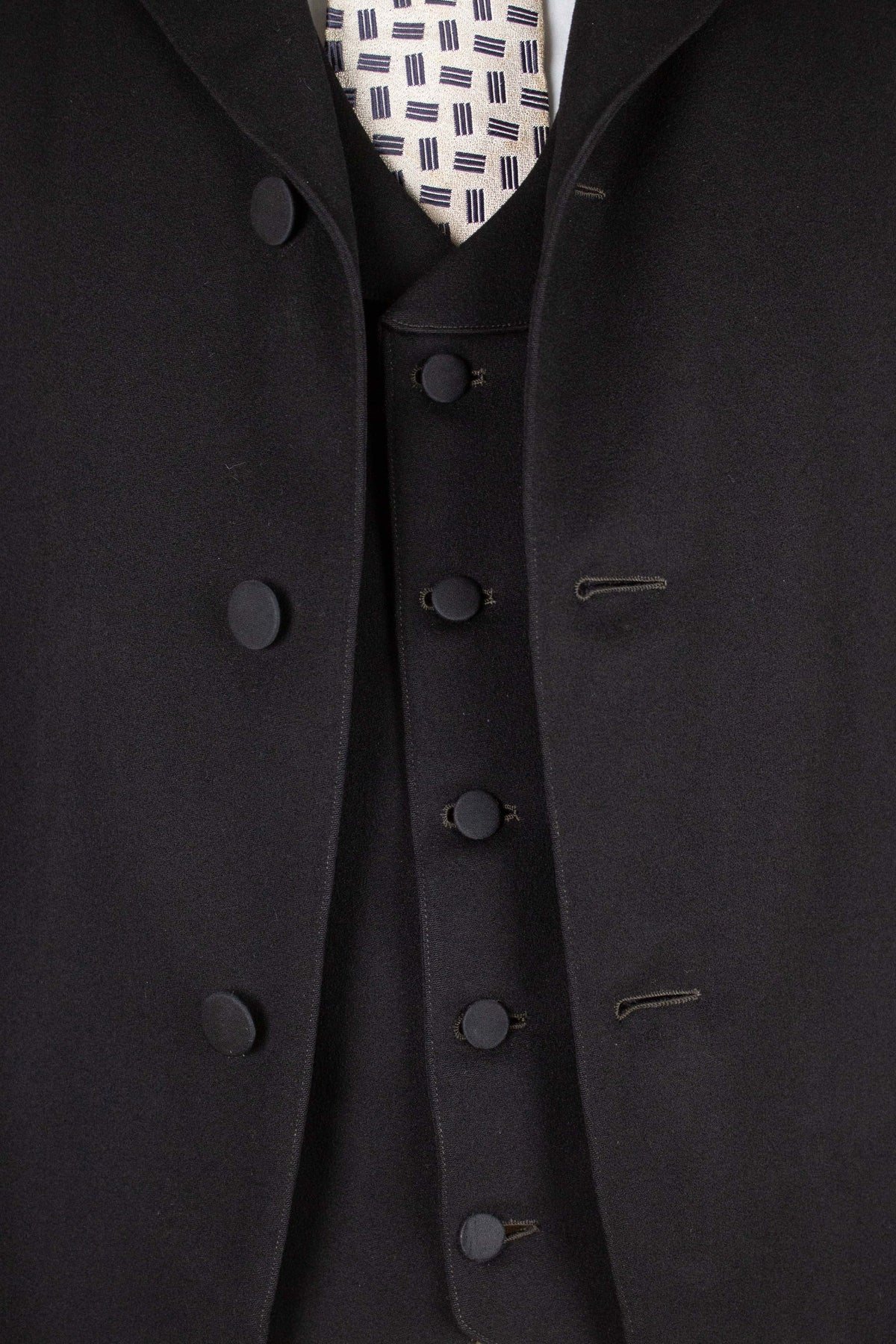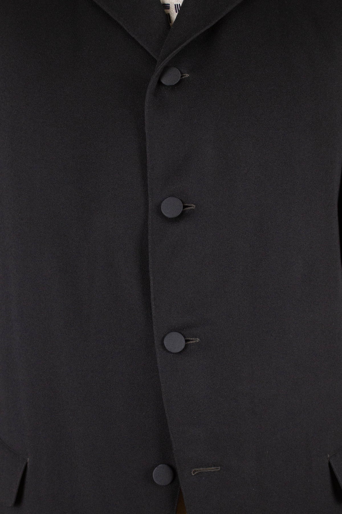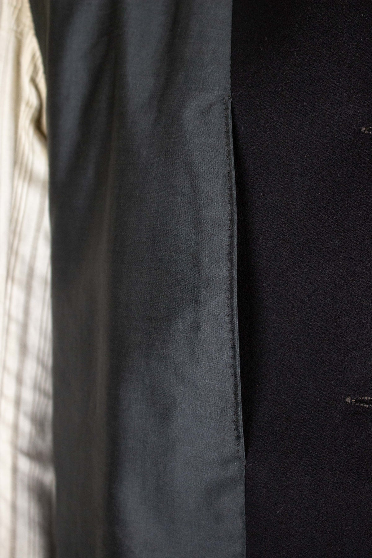 The jacket is single-breasted and fastens with four fabric-covered buttons, giving it the characteristically high front closure of the time. It's worth noting that these jackets were often worn fastened only at the top button, or left completely open. This is not a jacket intended to accentuate the waist. The jacket has horizontal flap pockets but no breast pocket. A buttonhole is stitched into the left lapel and stands out slightly due to a subtly contrasting thread. The cuffs also reflect the period style, with two fabric-covered buttons spaced wider apart than is typical today. There is also a decorative seam running partway up the sleeve. The back is straight and unvented. Inside, the jacket is fully lined and features a single interior pocket on the right side.