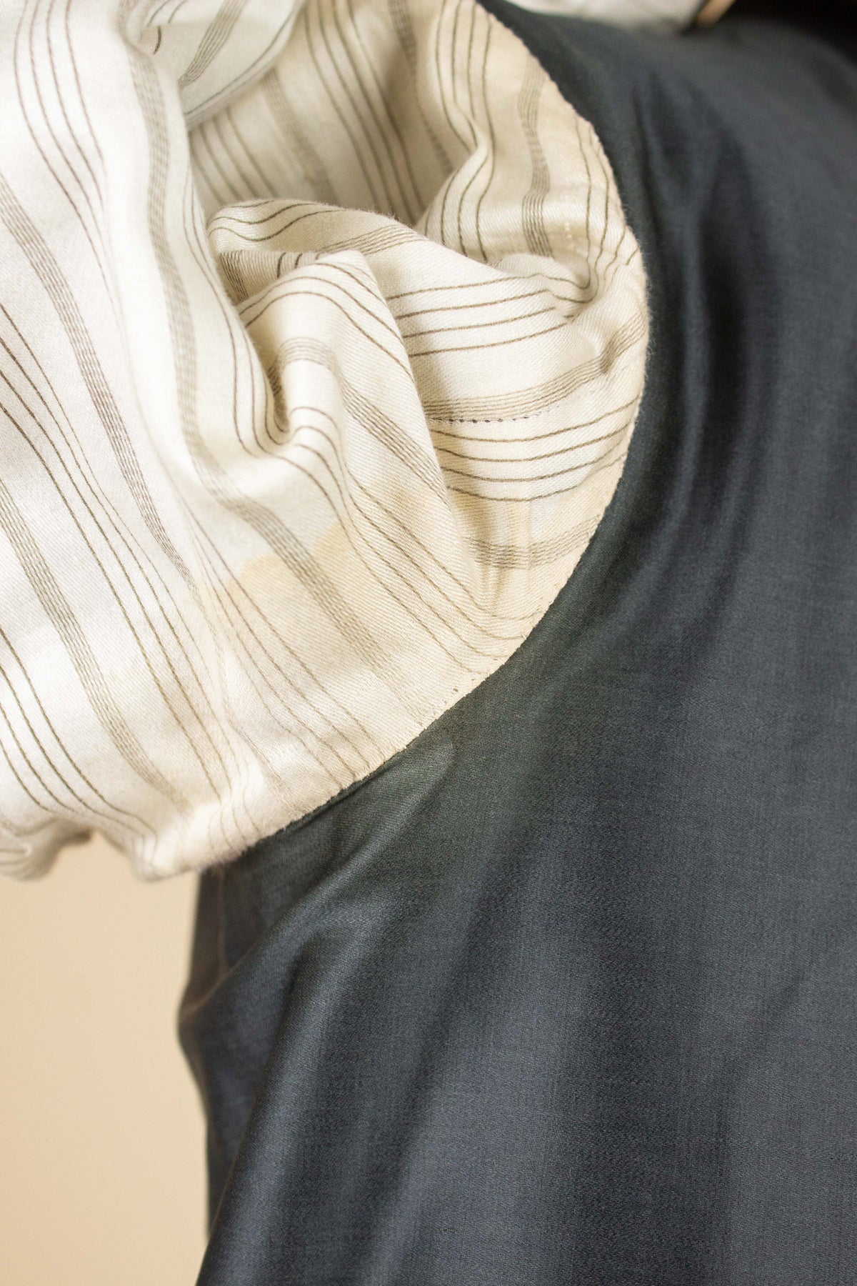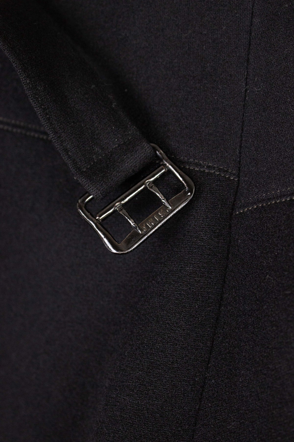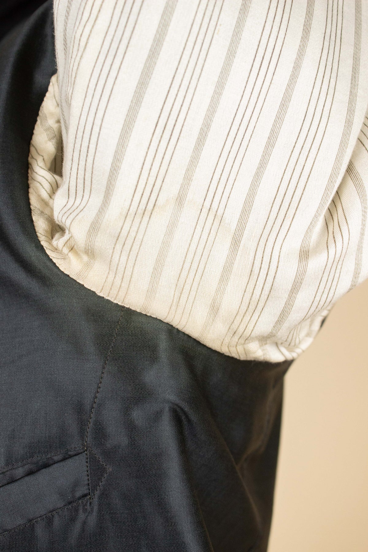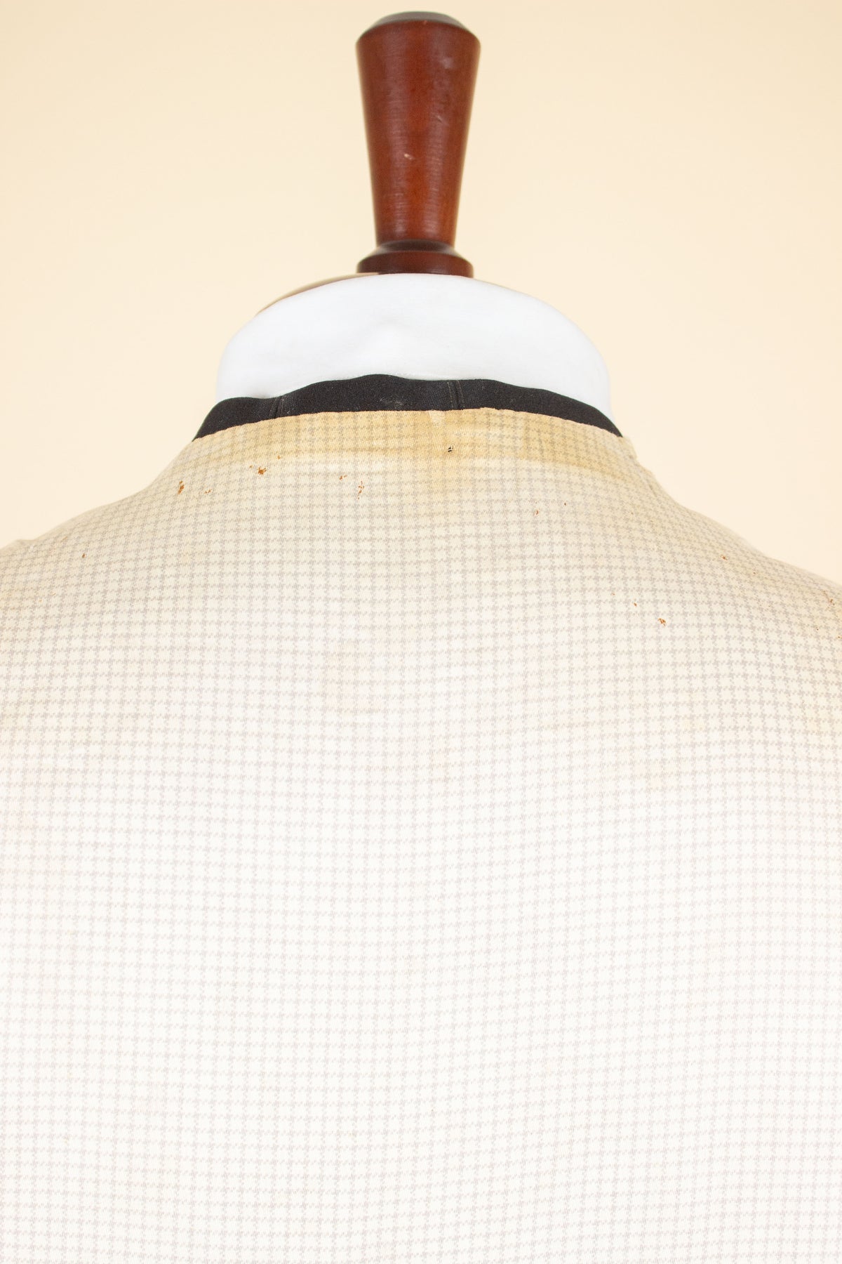 The jacket is single-breasted and fastens with four fabric-covered buttons, giving it the characteristically high front closure of the time. It's worth noting that these jackets were often worn fastened only at the top button, or left completely open. This is not a jacket intended to accentuate the waist. The jacket has horizontal flap pockets but no breast pocket. A buttonhole is stitched into the left lapel and stands out slightly due to a subtly contrasting thread. The cuffs also reflect the period style, with two fabric-covered buttons spaced wider apart than is typical today. There is also a decorative seam running partway up the sleeve. The back is straight and unvented. Inside, the jacket is fully lined and features a single interior pocket on the right side.