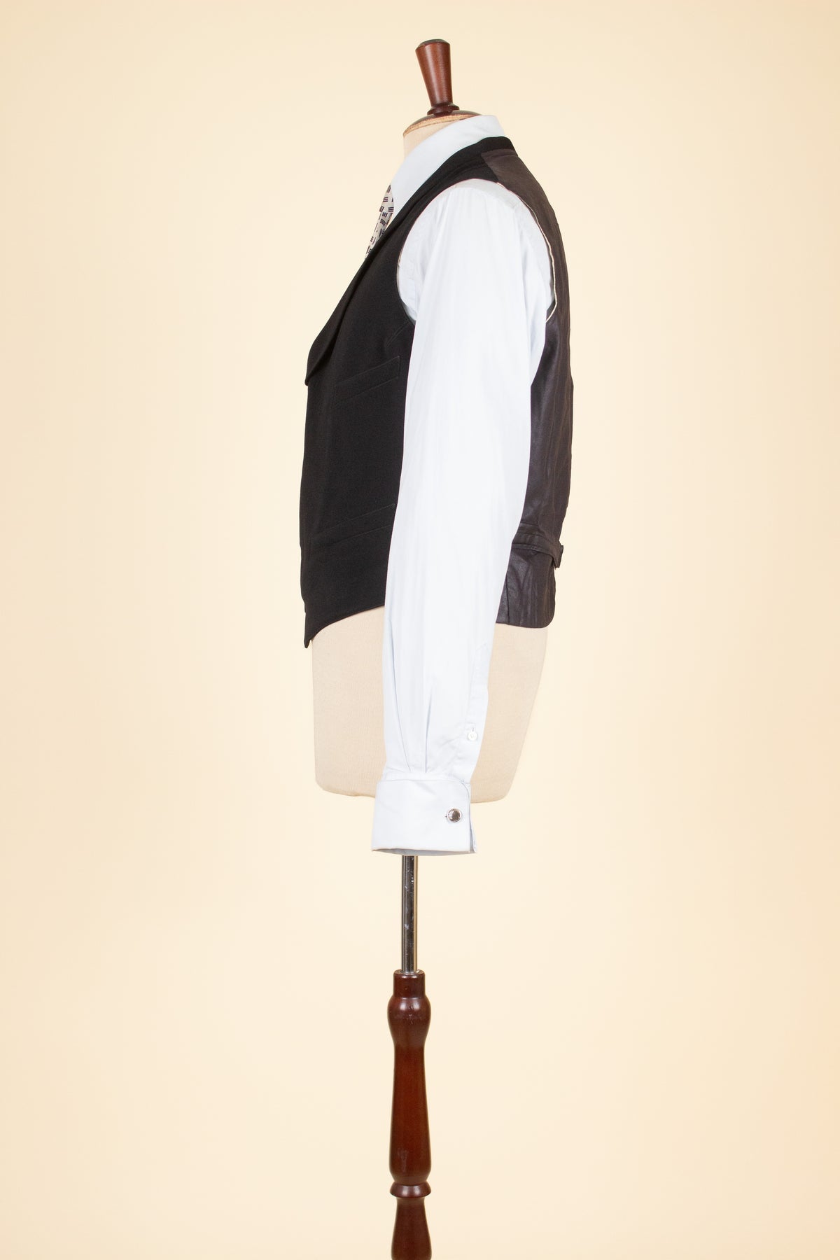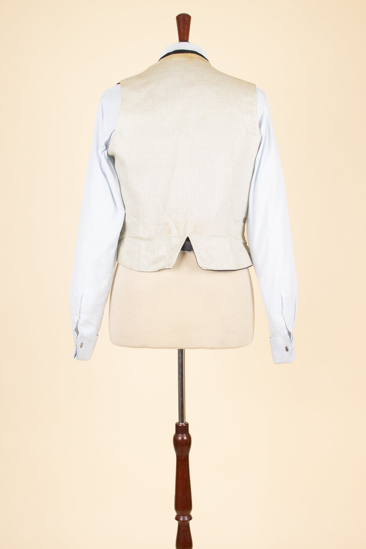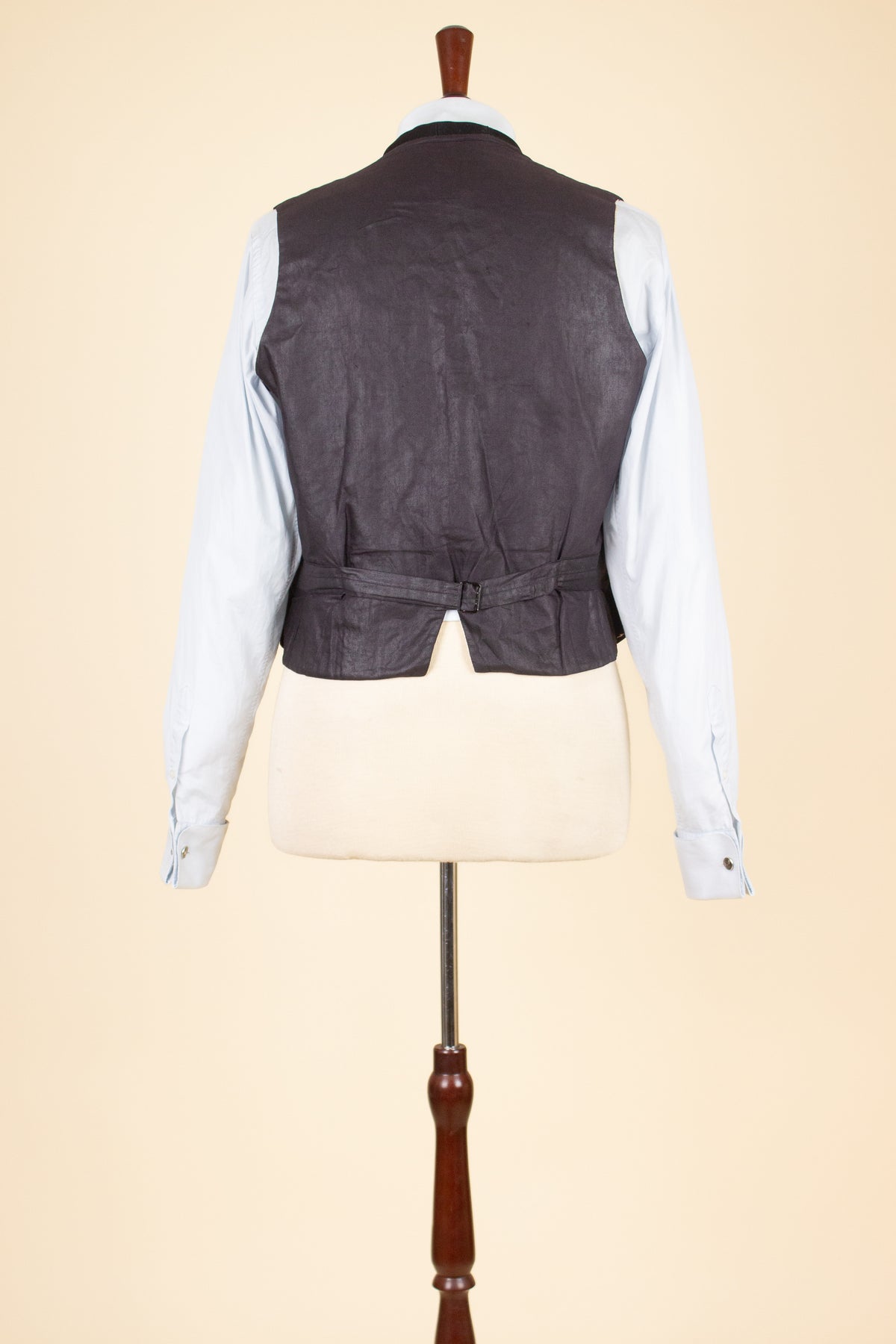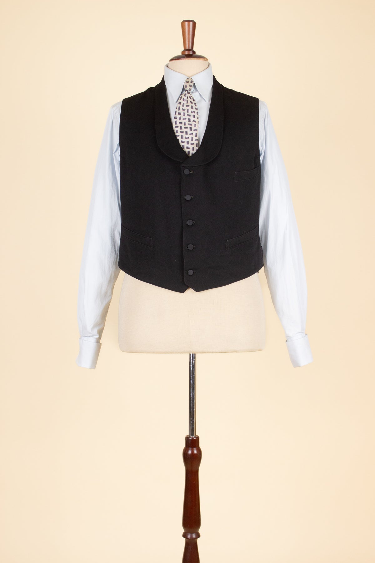 The waistcoat is single-breasted with a shawl collar and fastens with five fabric-covered buttons. It has three front pockets – one breast pocket on the left and two lower pockets. The back has an adjustable strap for size adjustment. The interior is lined with a fine checked cotton fabric.