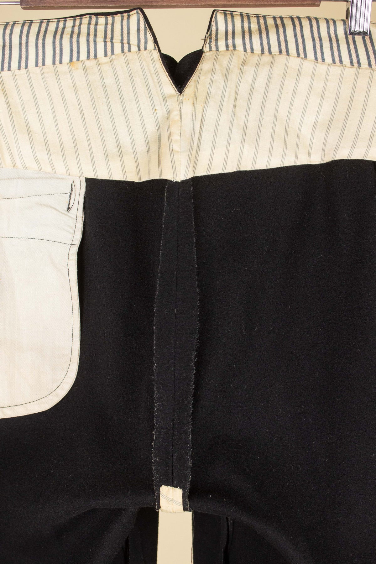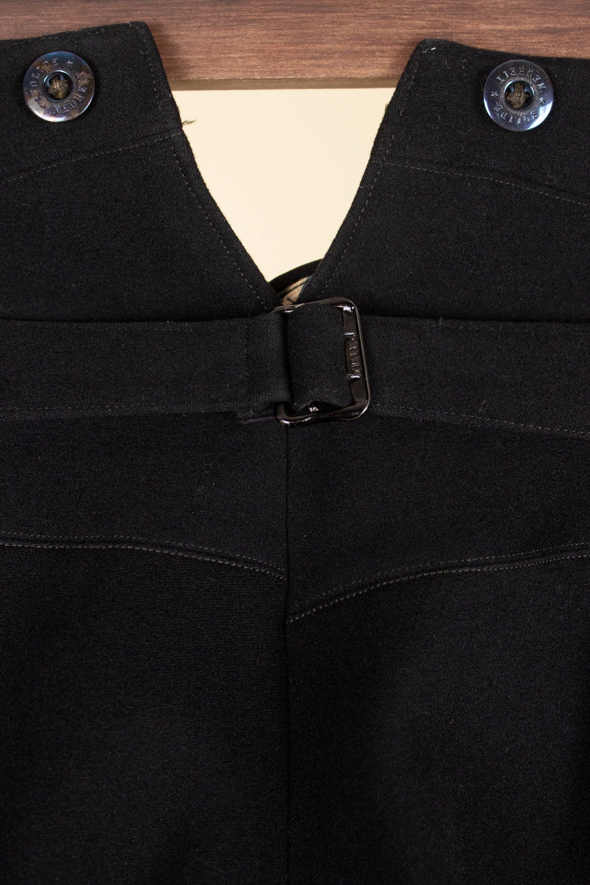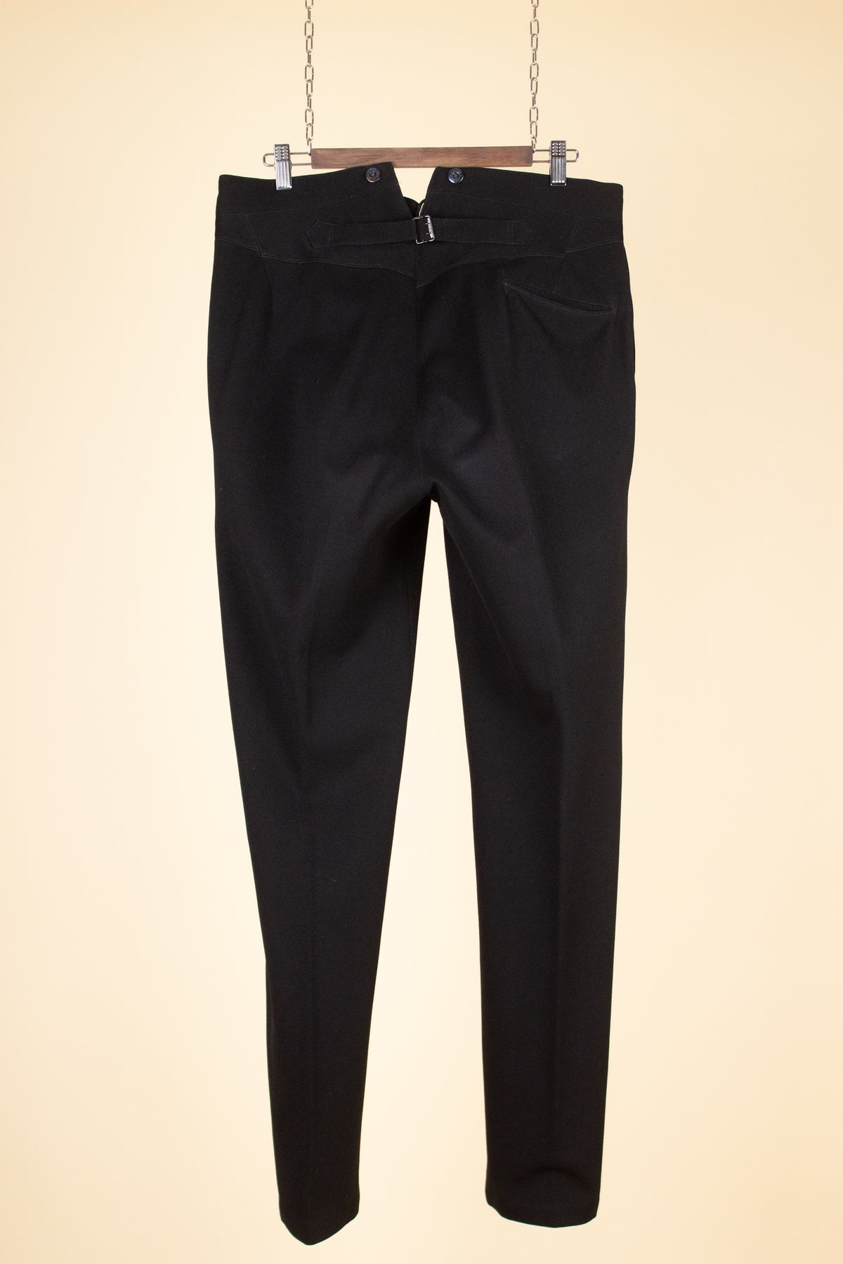 The trousers reflect many of the stylistic norms of the era. They are high-waisted with a flat front (i.e. no pleats). They have vertical front pockets, and brace buttons are positioned along the outside of the waistband. The fly is buttoned. On the back, there is a single piped pocket on the right-hand side. The trousers also feature a fishtail back – a split waistband with an adjustable strap and buckle located just below the split.