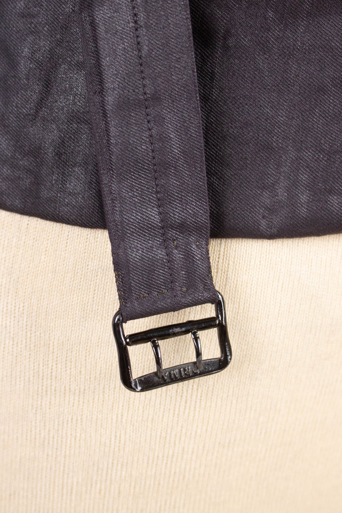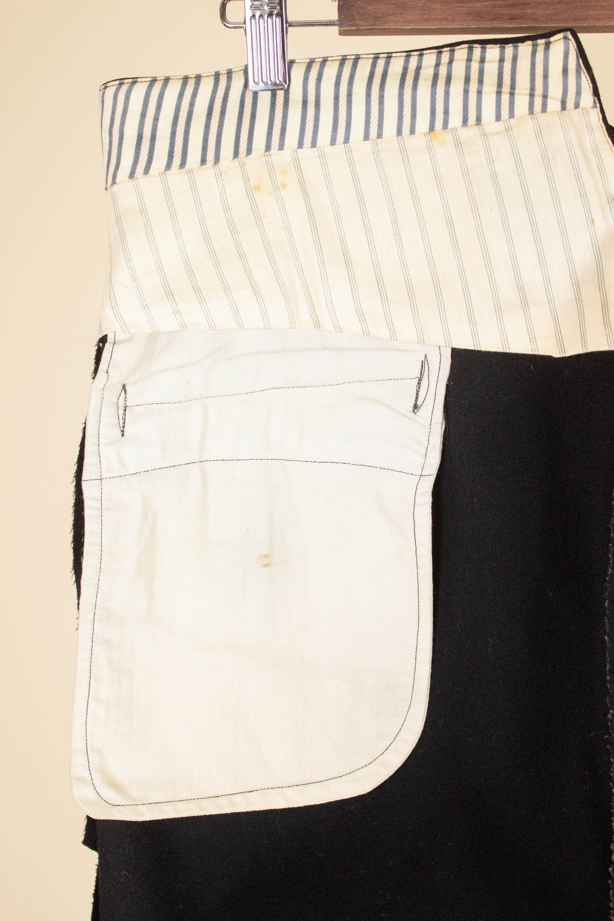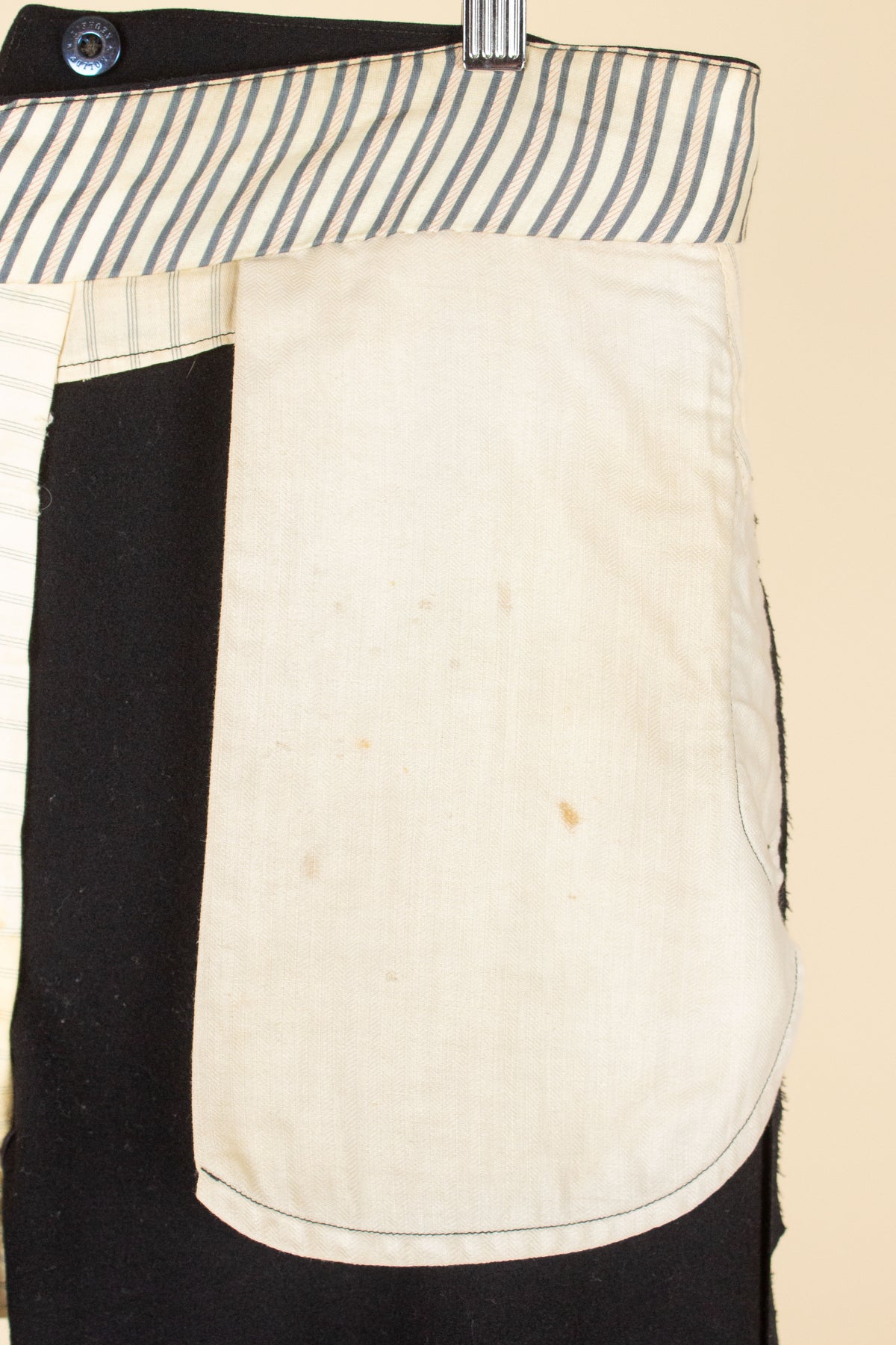 The trousers reflect many of the stylistic norms of the era. They are high-waisted with a flat front (i.e. no pleats). They have vertical front pockets, and brace buttons are positioned along the outside of the waistband. The fly is buttoned. On the back, there is a single piped pocket on the right-hand side. The trousers also feature a fishtail back – a split waistband with an adjustable strap and buckle located just below the split.