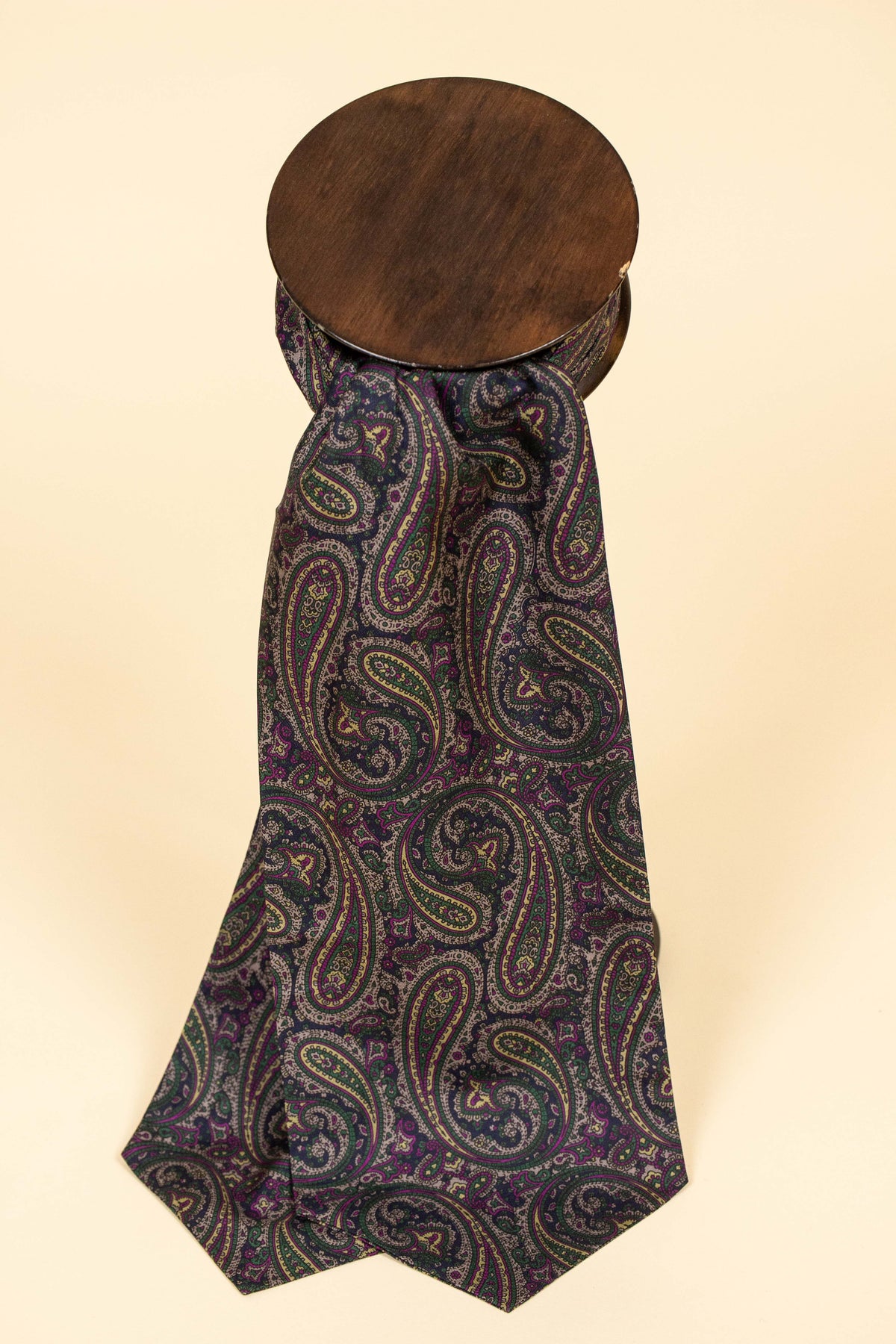 This ascot tie is of British origin, by Mc Donald London. It features a large paisley pattern consisting of the colours pink, green and cream on a dark blue background. The condition is excellent, with no signs of wear. Please review the photos to form your own impression.