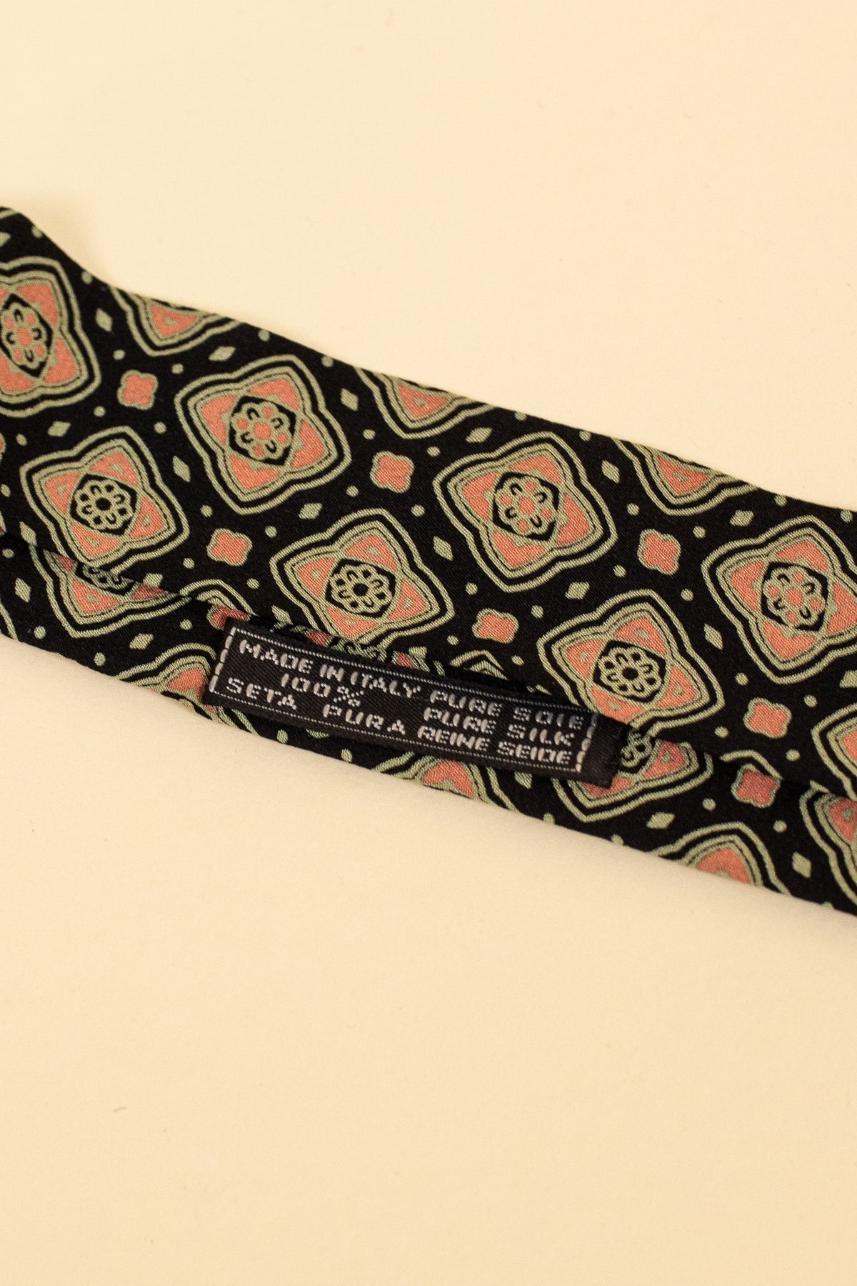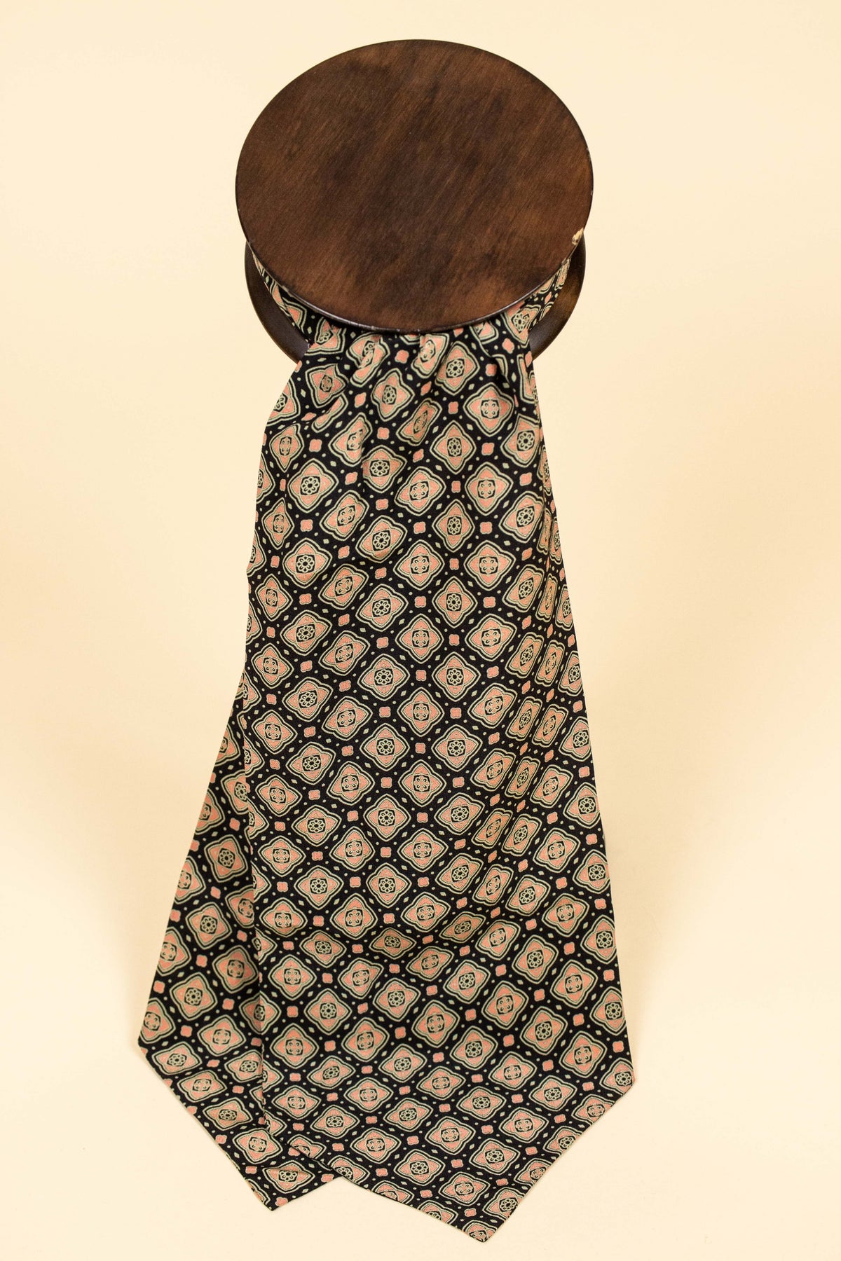 This ascot tie is of Italian origin. It features a pink and beige pattern on a black background. The condition is excellent, with no signs of wear. Please review the photos to form your own impression.