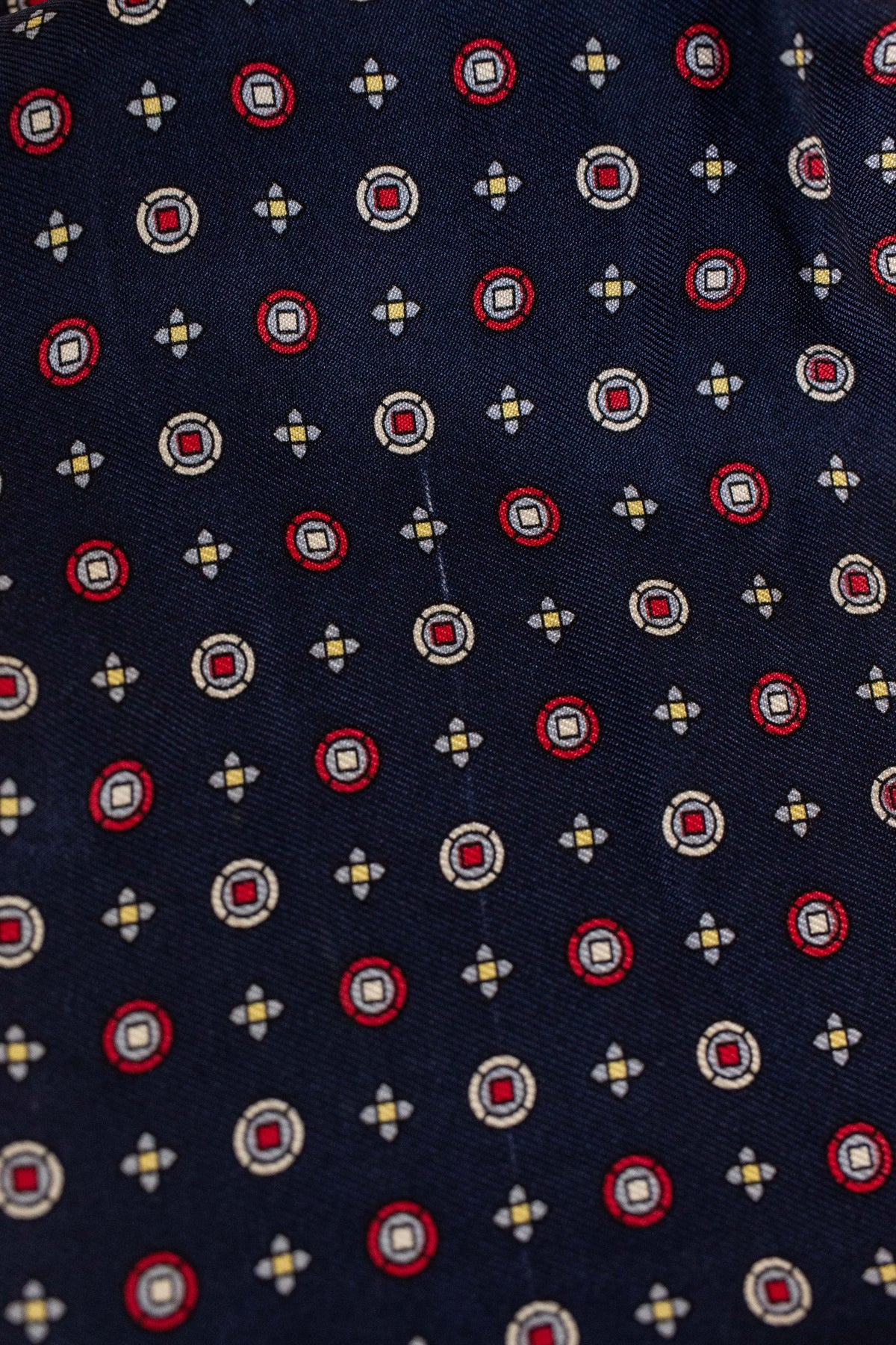 This ascot tie is of Italian origin. It features a small pattern consisting of the colours red, yellow, light blue and white on a dark blue background. The condition is almost perfect, but there is a small tear to the fabric. However the ascot tie can easily be tied so that this tear doesn't show. Please review the photos to form your own impression.