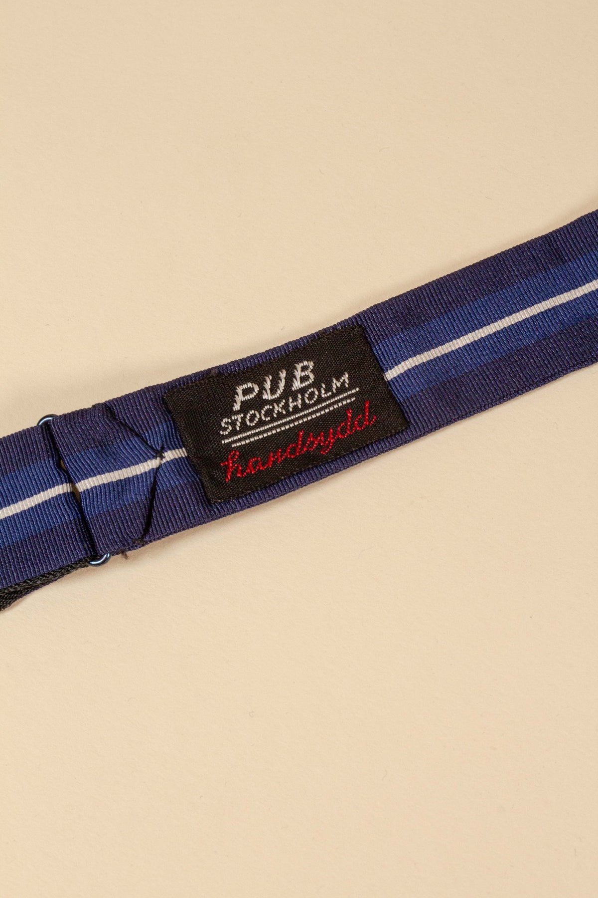 Den här knutflugan är av svenskt ursprung, den är ursprungligen såld på varuhuset PUB i Stockholm. Till färgen är den mörkblå i grunden och har ett ljusare blått längsgående fält i mitten samt en vit rand centralt. Vad gäller skicket så är det utmärkt, det finns inga tecken på användning. Vänligen studera bilderna och skapa er en egen uppfattning om skicket.