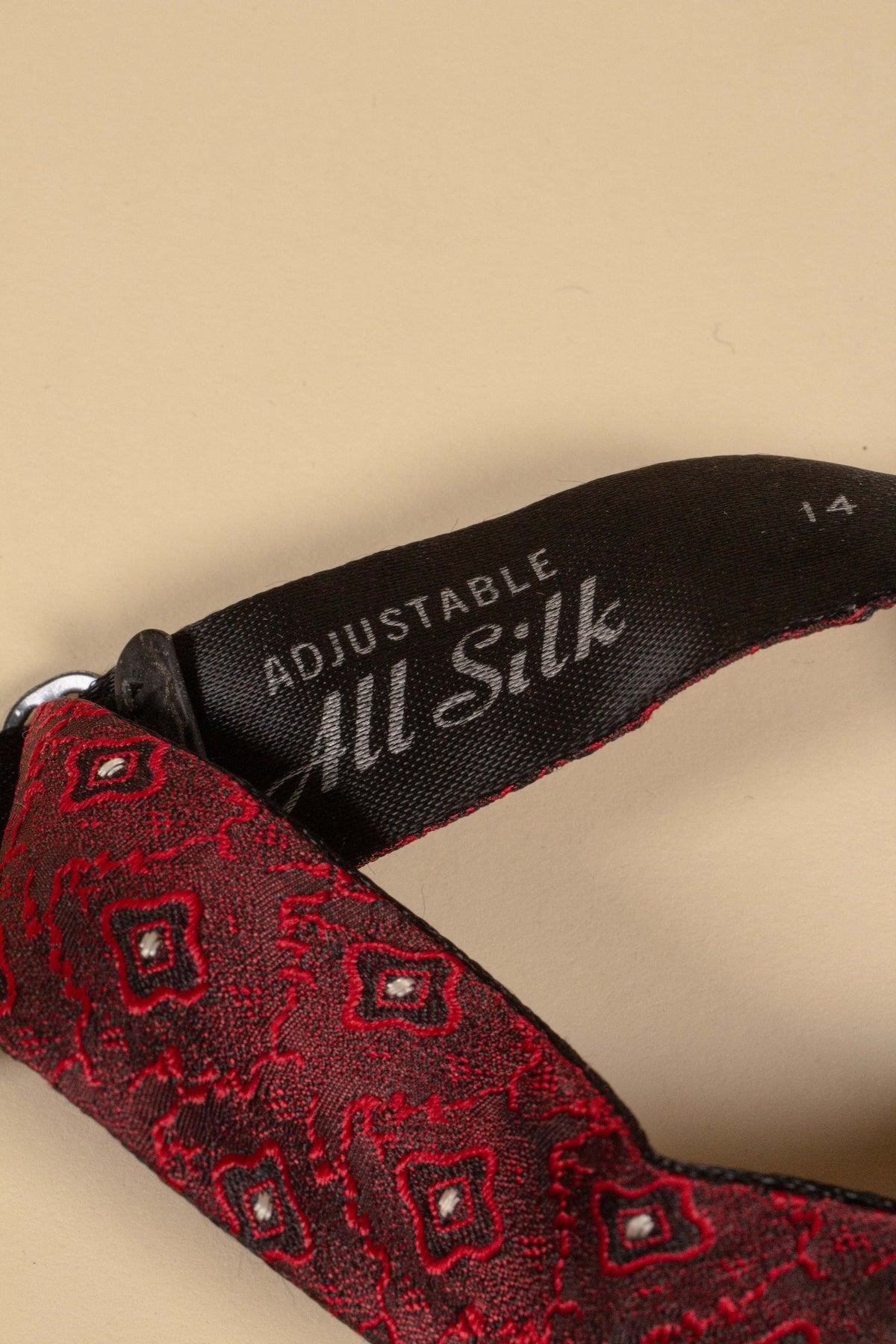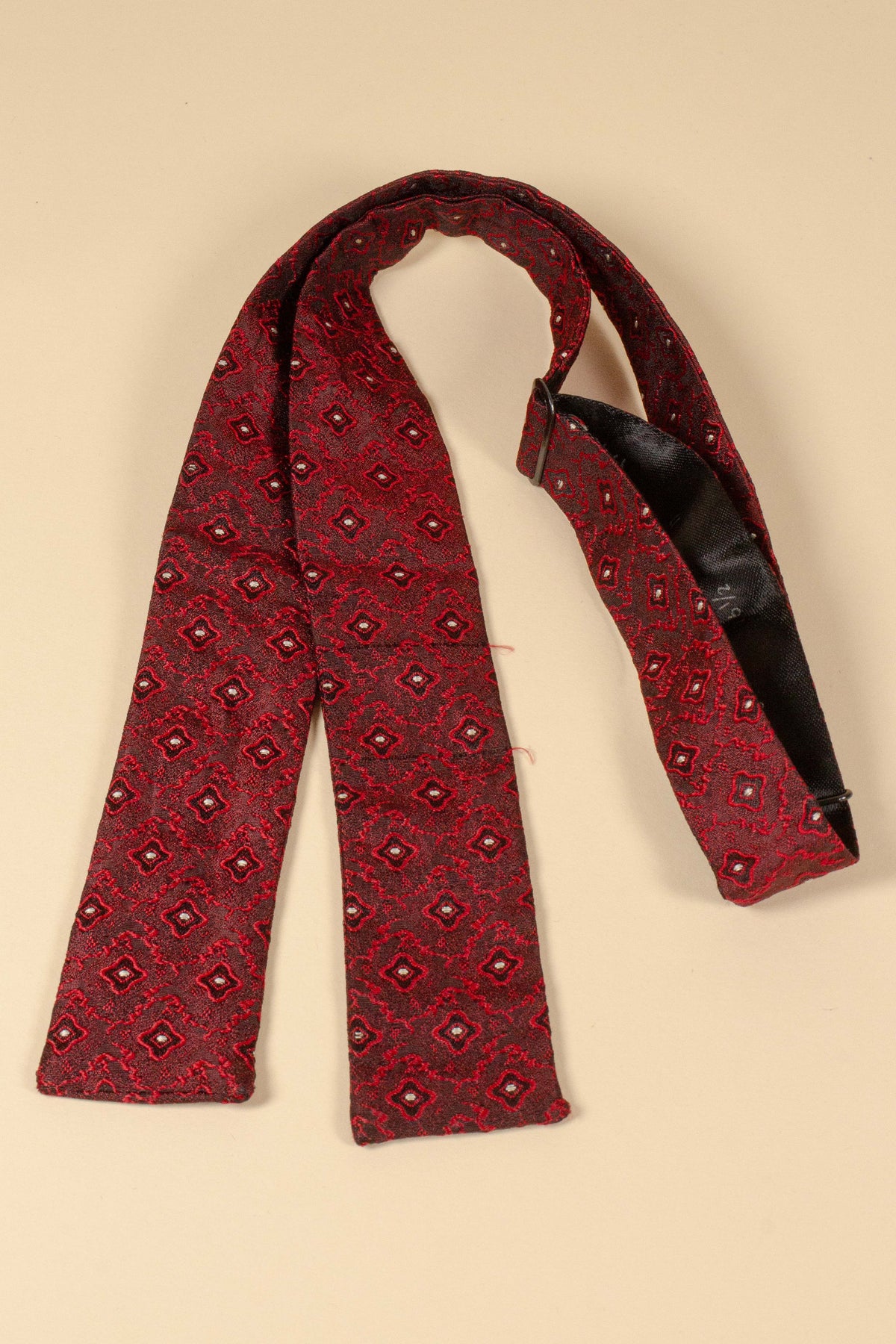 This bow tie is likely of American origin, or possibly British. It has no labels, but it does have American/British size markings at the neck. The colour is burgundy and it features a pattern in bright red and white. The condition is excellent, with no signs of use. Please study the photographs carefully and form your own opinion regarding the condition.