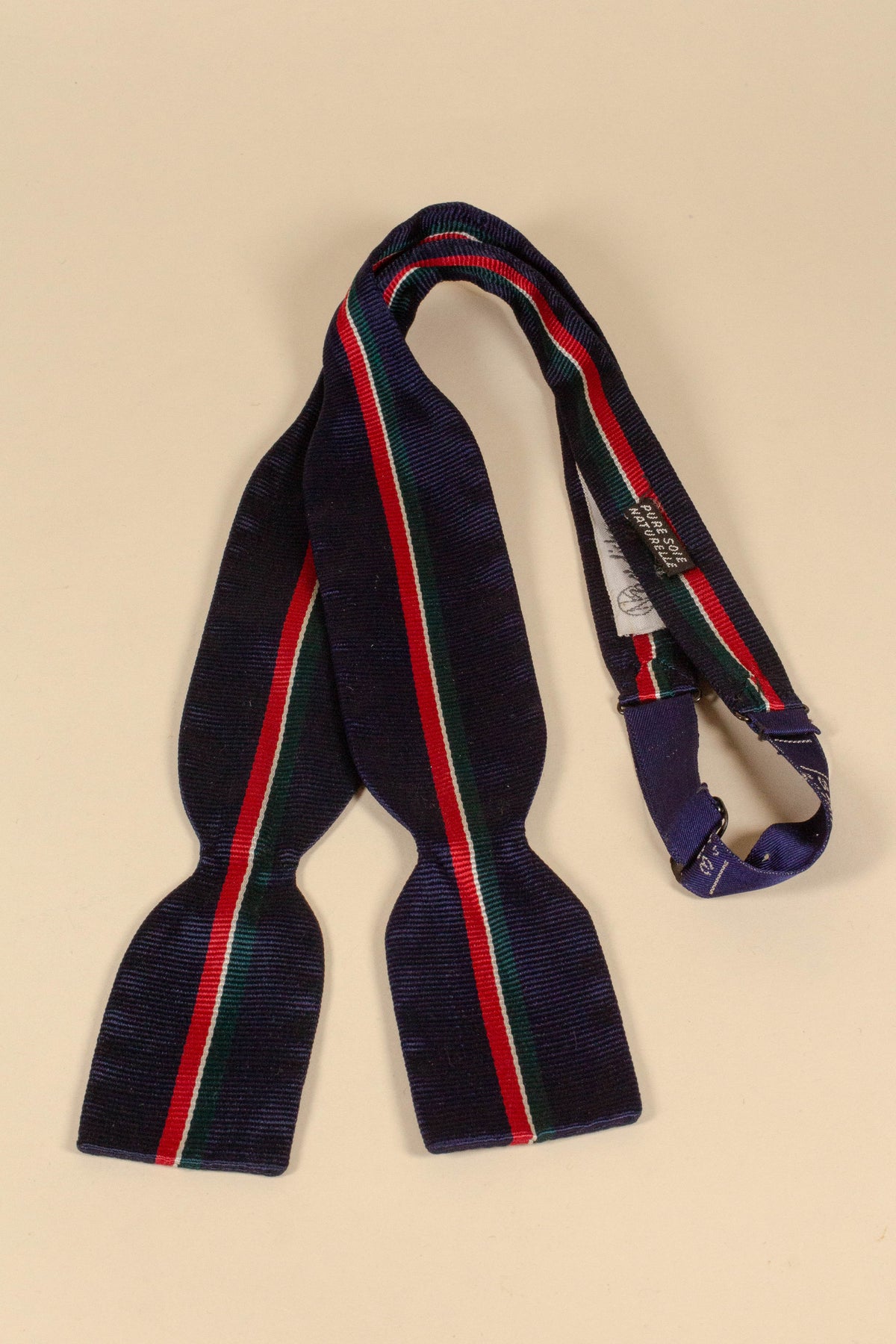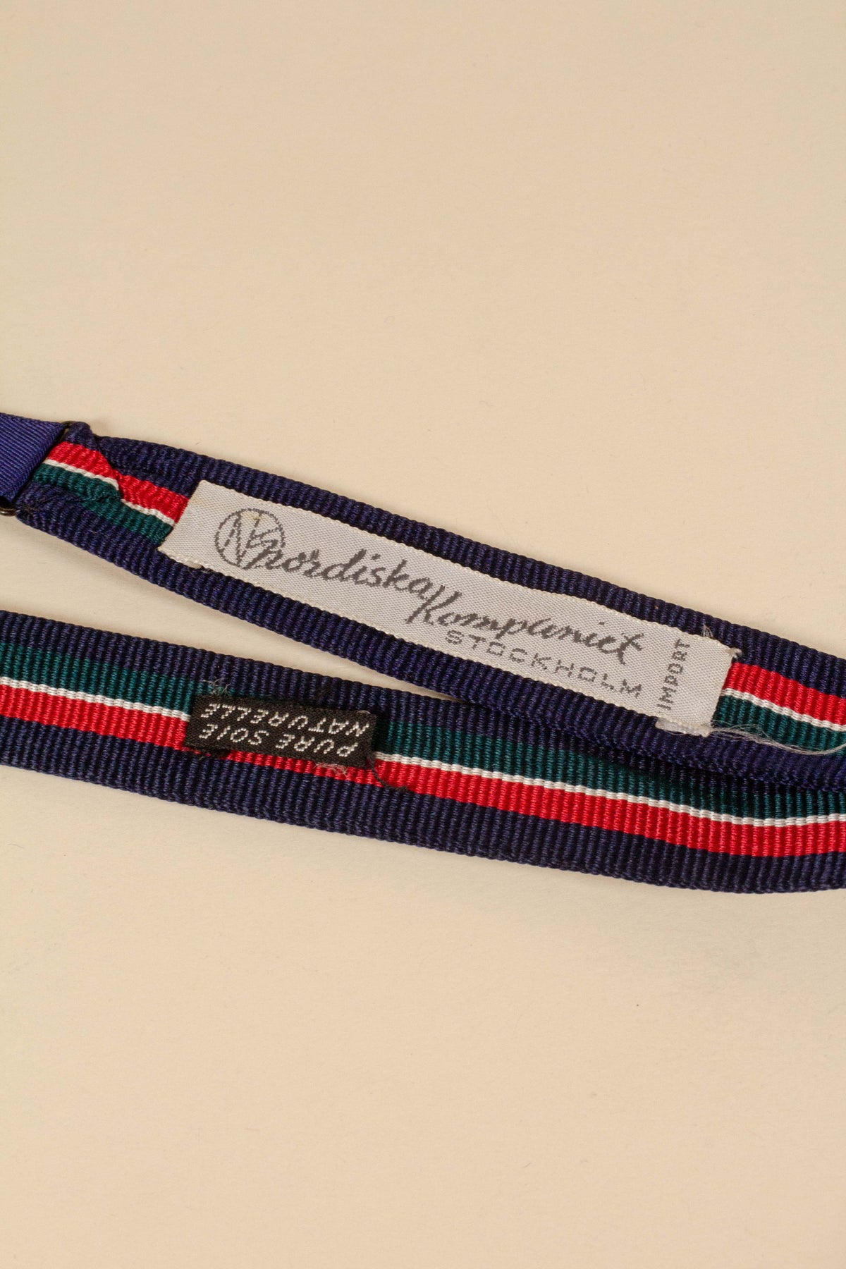 This bow tie is most likely of French origin and was sold as new at the department store Nordiska Kompaniet in Stockholm. It is dark blue in colour and features a central longitudinal field of green, red and white.