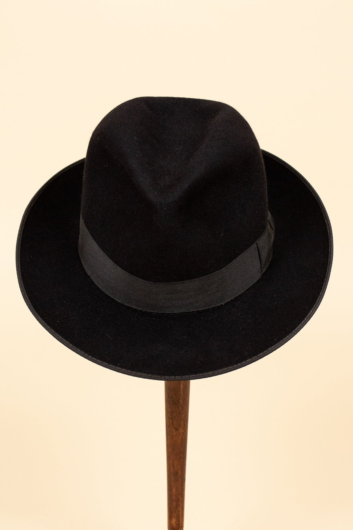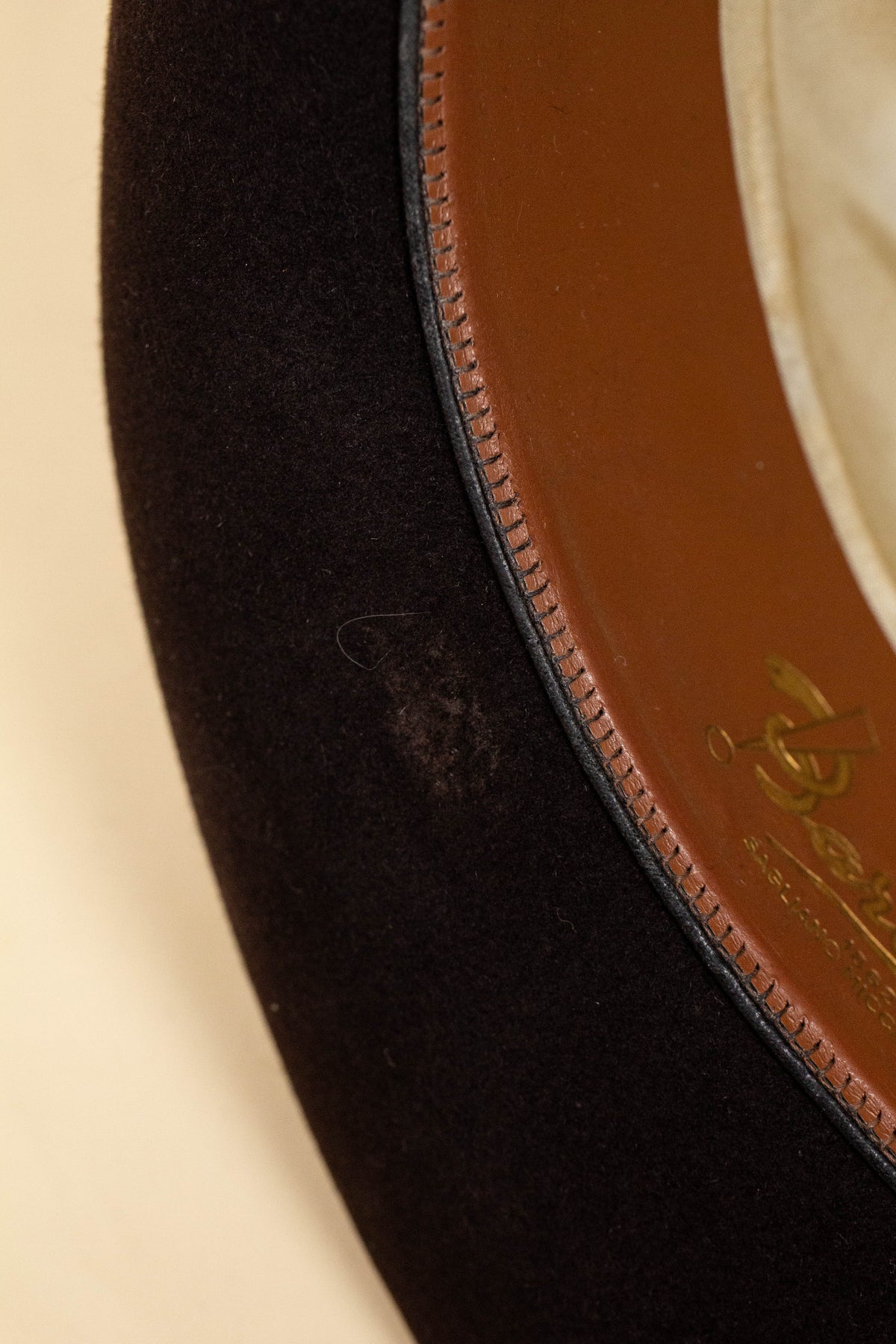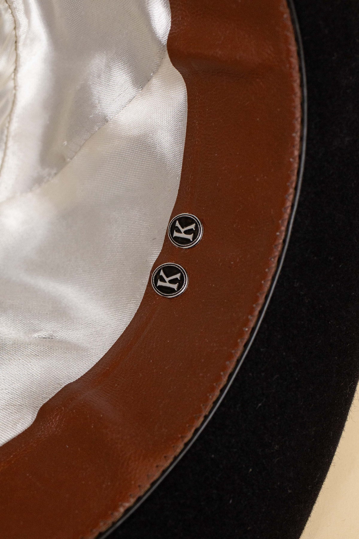 The hat is black in colour and features a matching hatband and edge binding. The interior is lined with light-coloured silk, bearing a logo with the maker’s name. The light brown leather sweatband is stamped with the manufacturer’s name as well as the original owner’s initials, adding a sense of character and history.