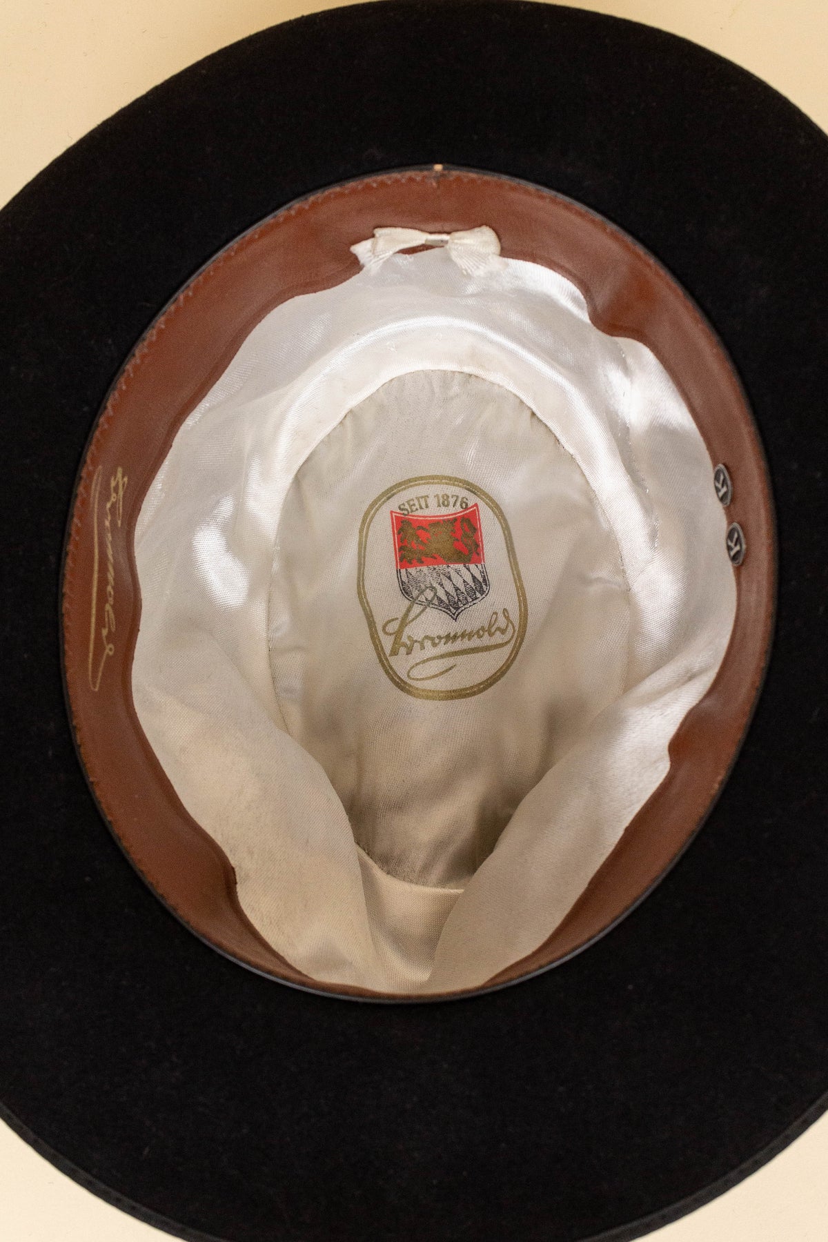 The hat’s country of origin is unknown, but several details suggest that it may have been produced in Austria or Germany. The logo on the inside is difficult to fully decipher, yet it clearly indicates an older, German-speaking craft tradition.