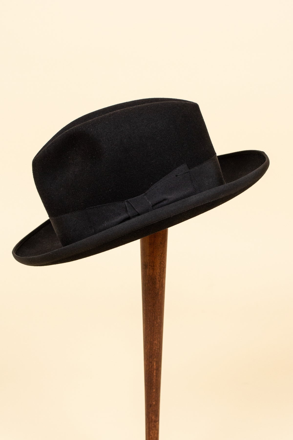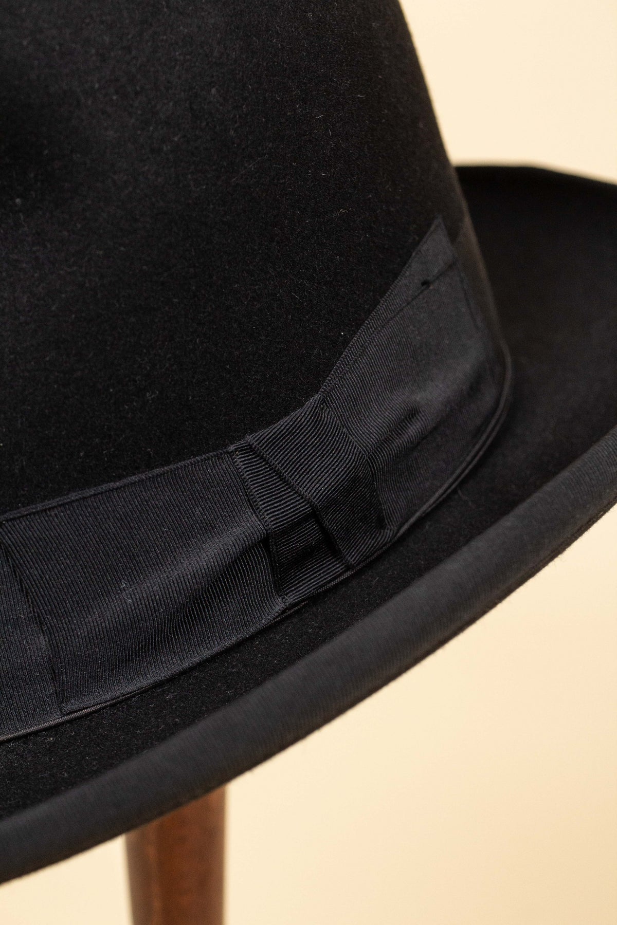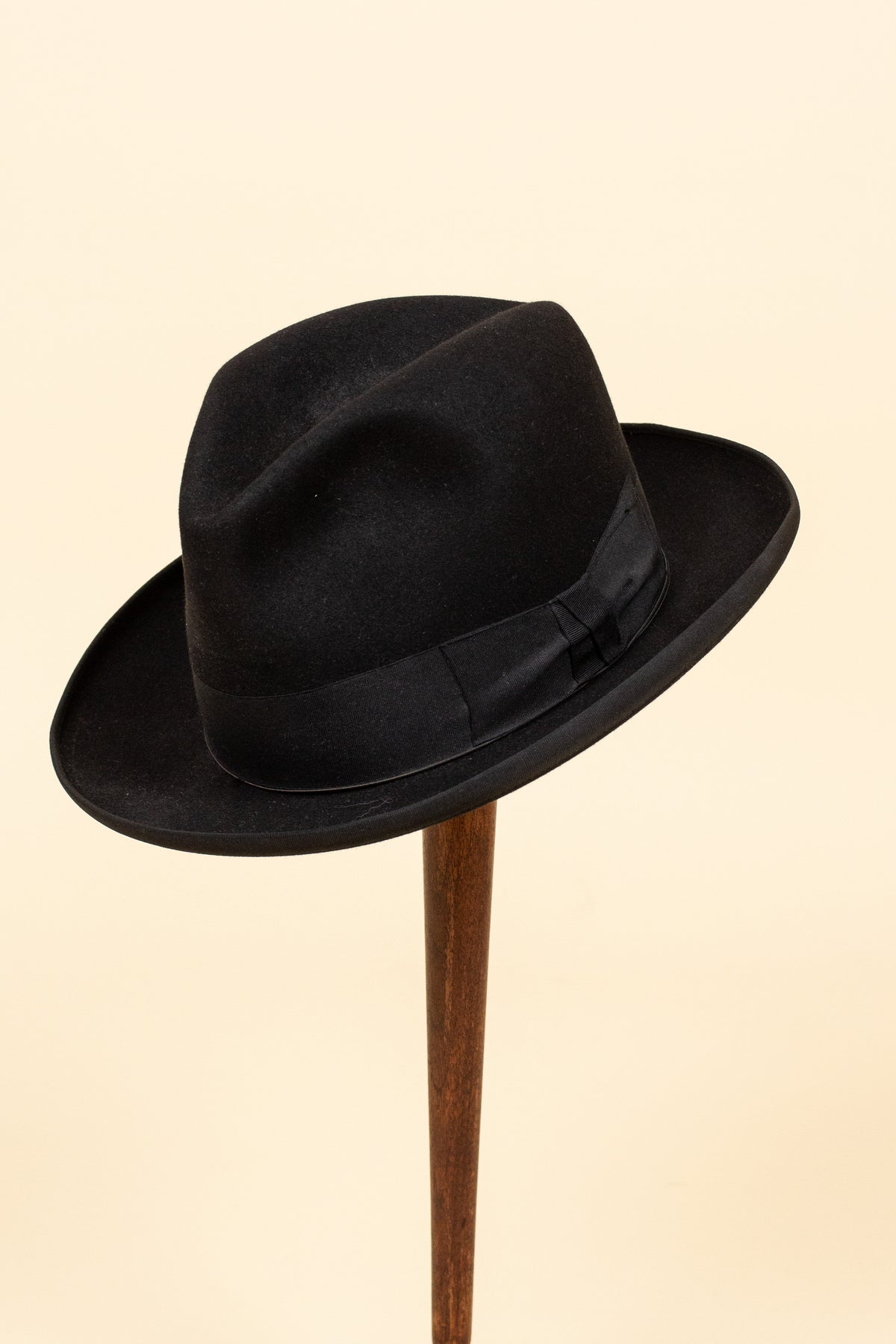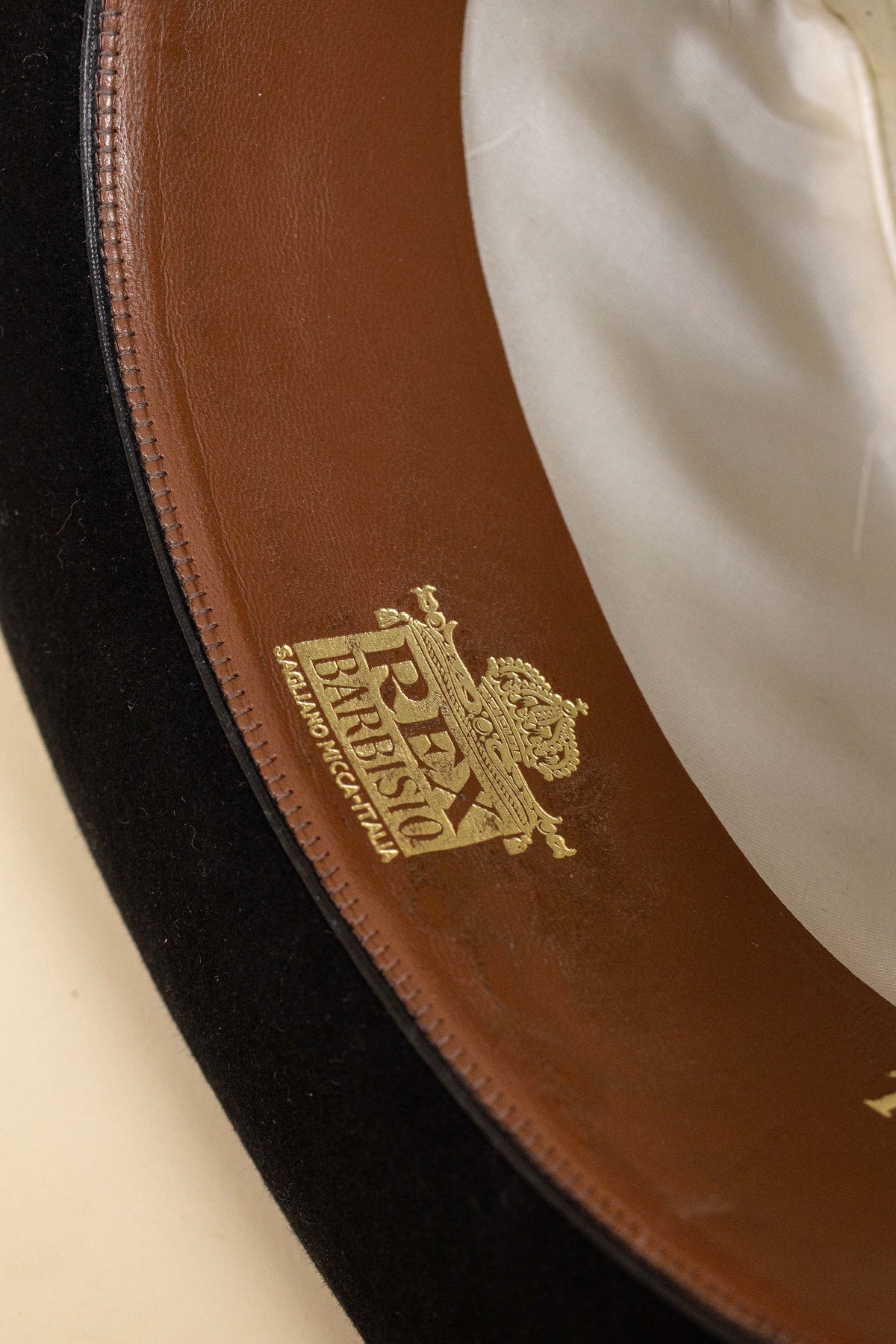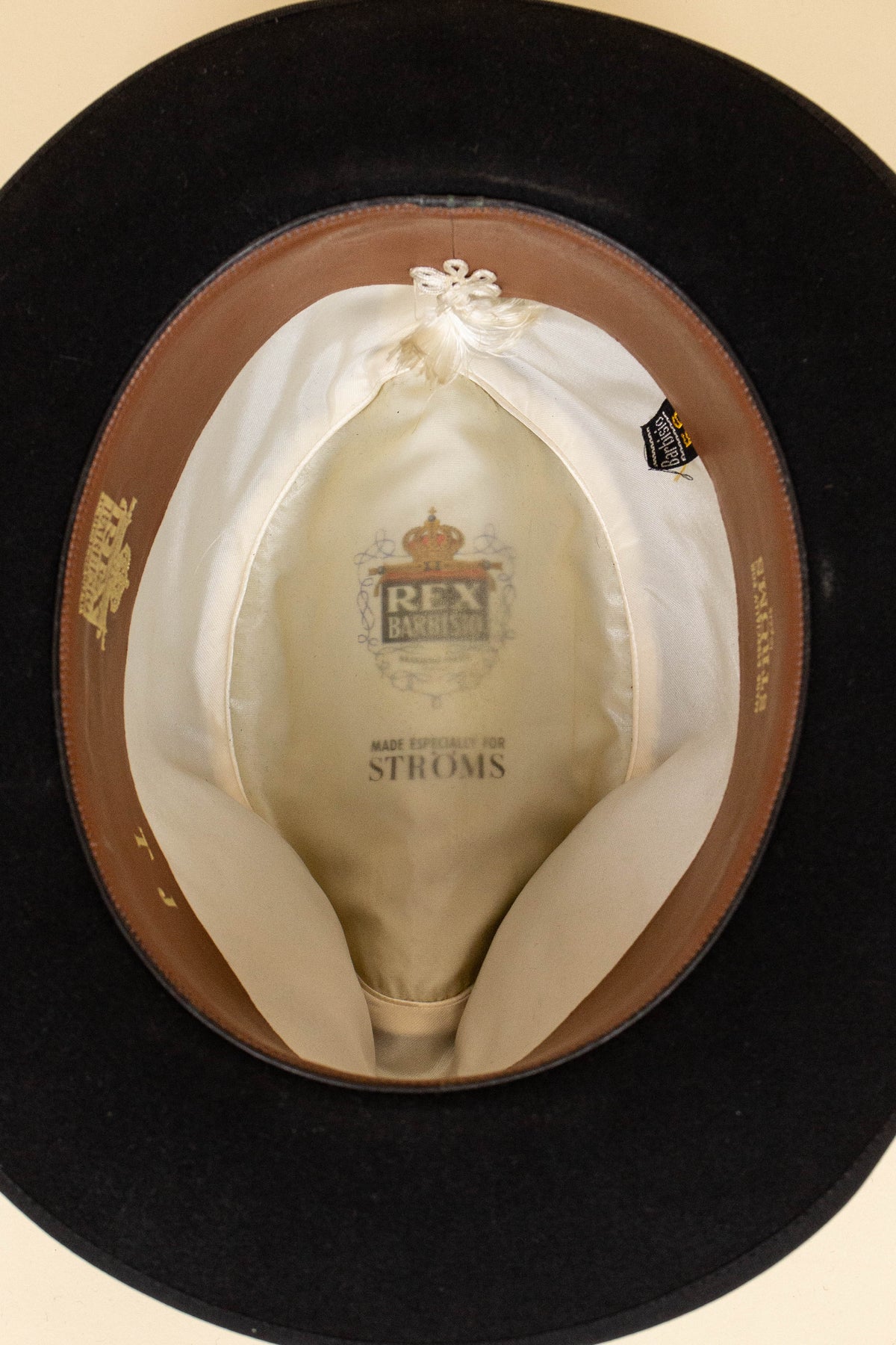 The hat is black in colour and features a matching black hatband and edge binding. Inside, it is lined with light-coloured silk bearing both the maker’s logo and the importer’s name. It has a light-brown leather sweatband, which is also stamped in gold lettering with both logos, as well as the original owner’s initials.
