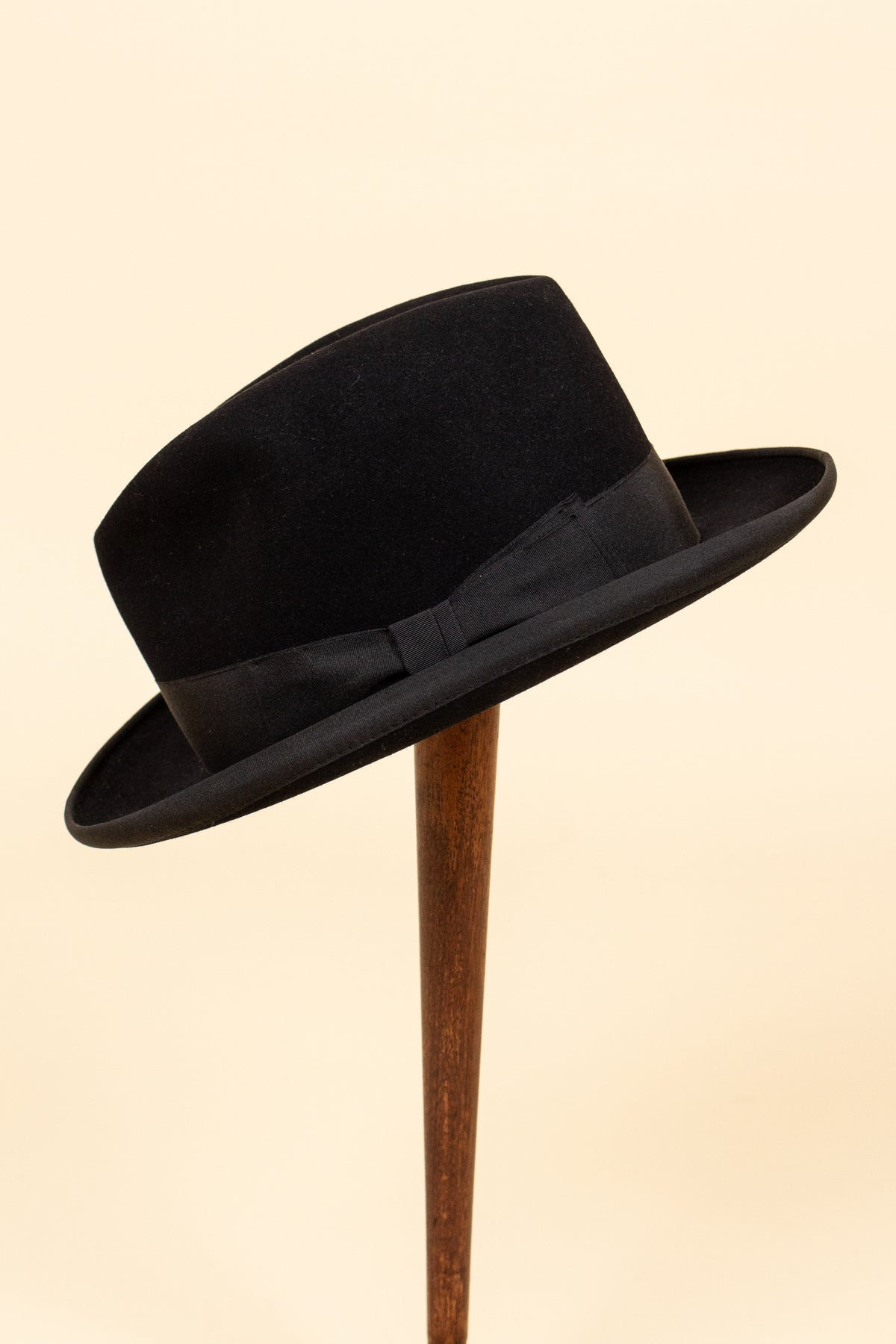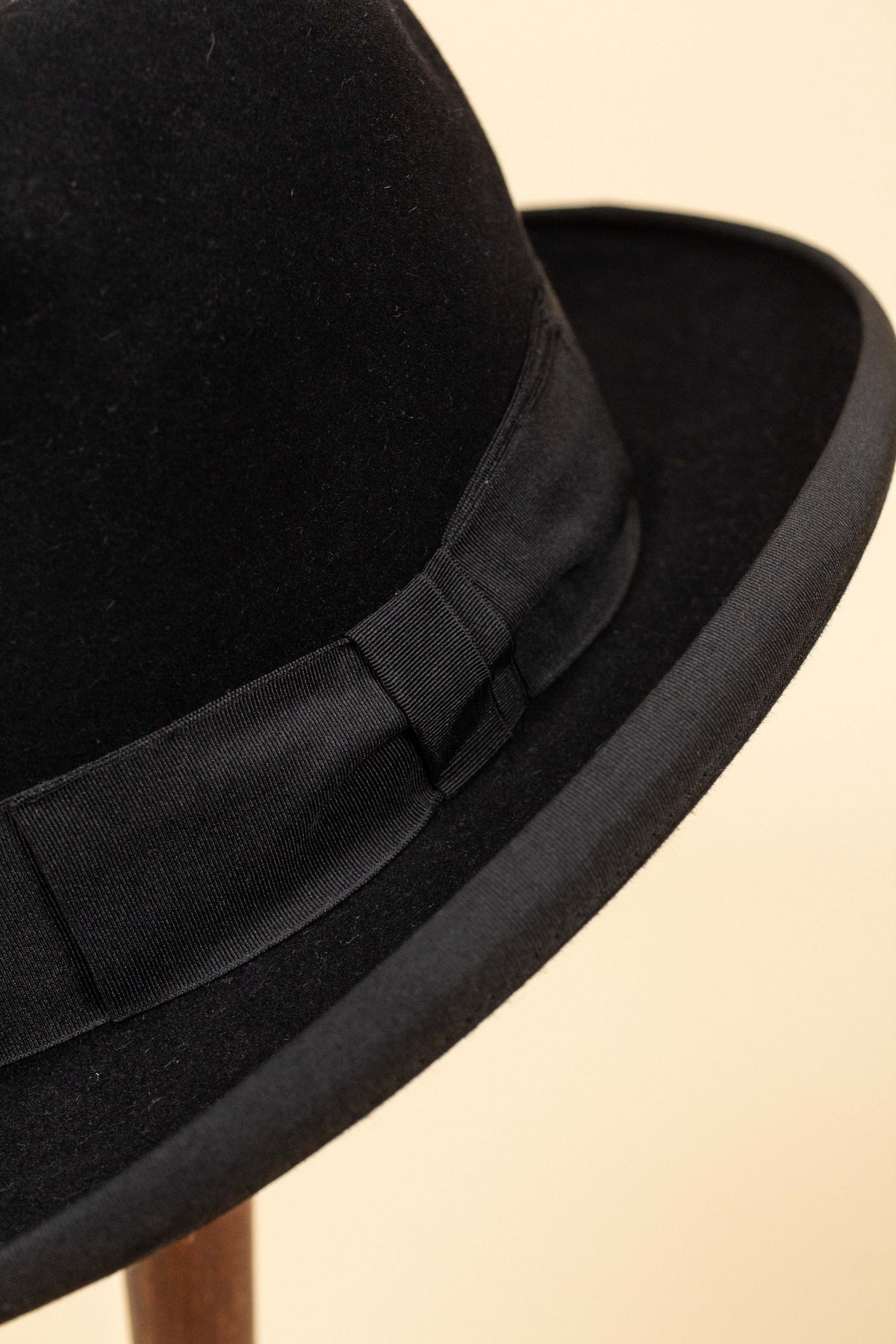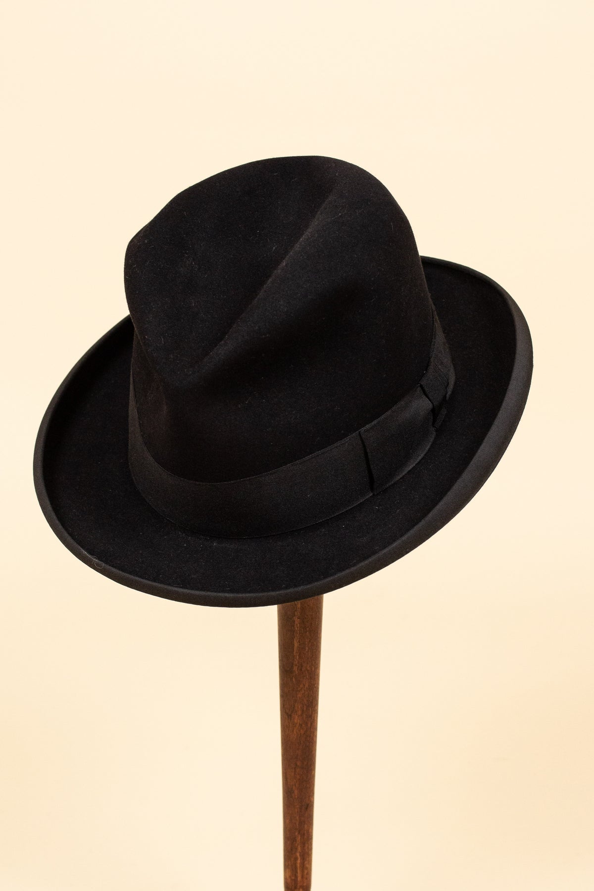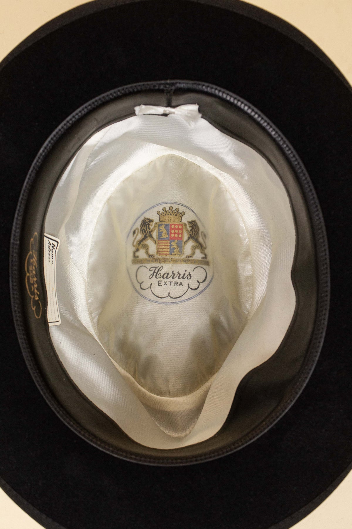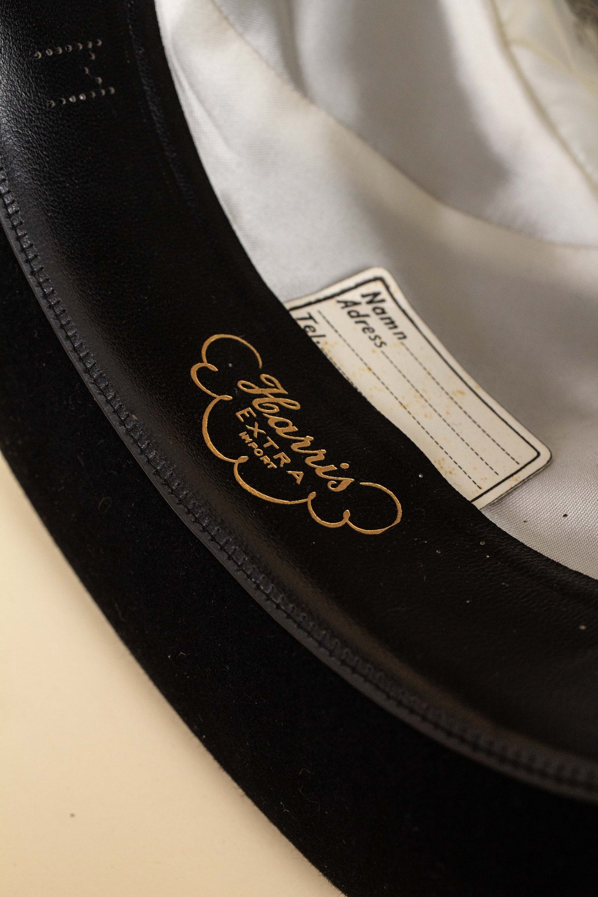 This black homburg hat appears to have been produced in England by Harris. Our uncertainty regarding the country of origin is simply due to our lack of detailed knowledge about the brand; however, it is most likely a British firm. It was originally imported and sold as new in Sweden, most likely in the 1940s or 1950s.