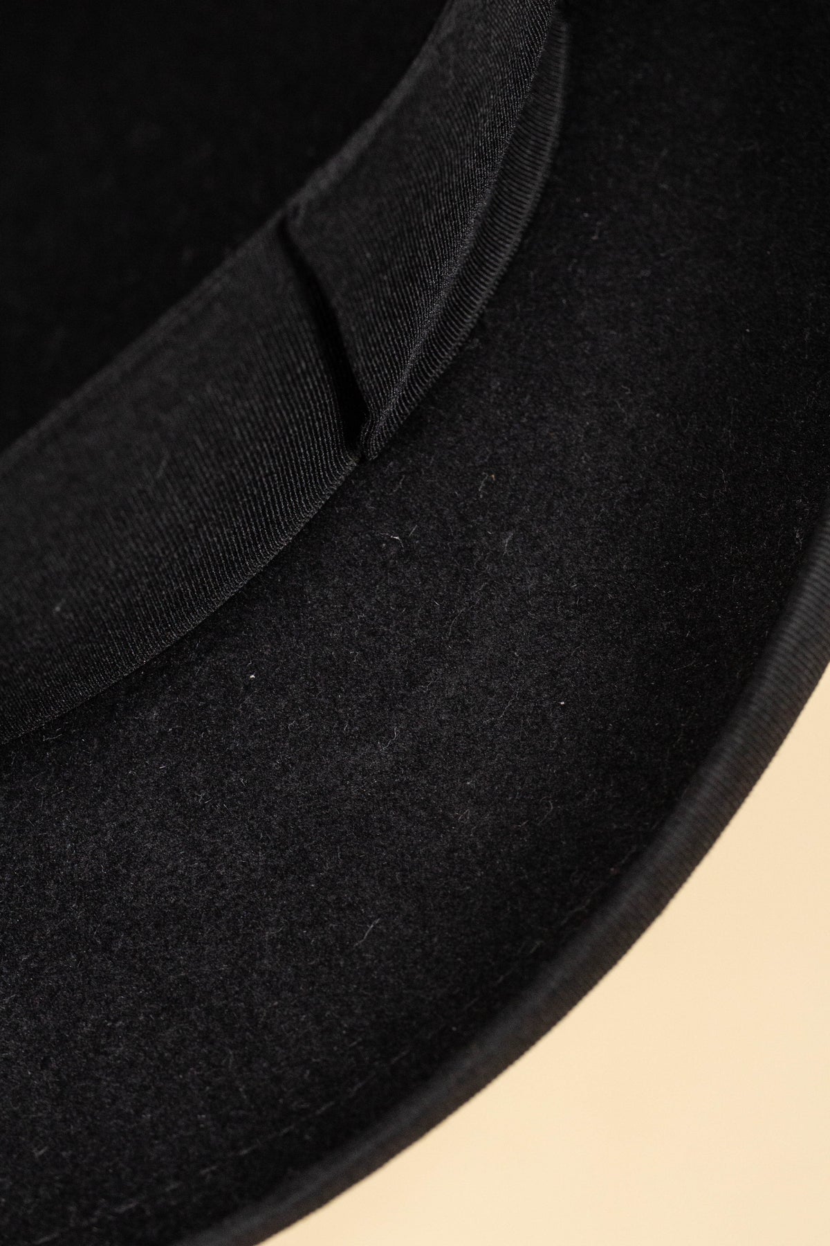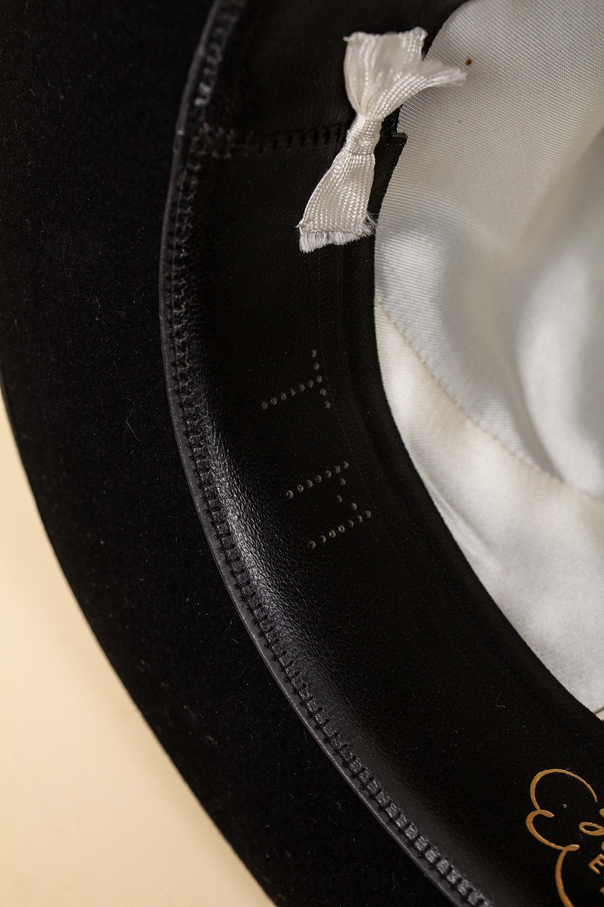 In colour, it is black and features a matching black hatband and edge binding. The interior is lined with a light-coloured silk bearing the maker’s mark at the base. It has a black leather sweatband. The original owner’s initials are present in the sweatband. Behind the sweatband is a label intended for the owner’s contact details. The overall condition is good, with no significant damage to note. Please study the images carefully and form your own assessment of the condition.