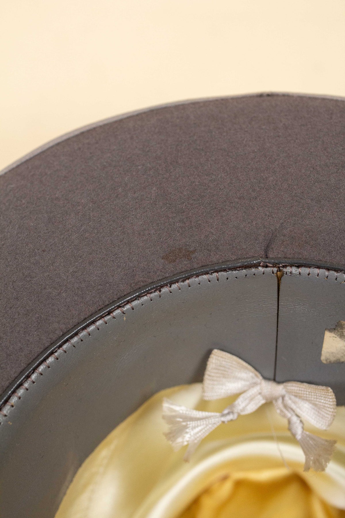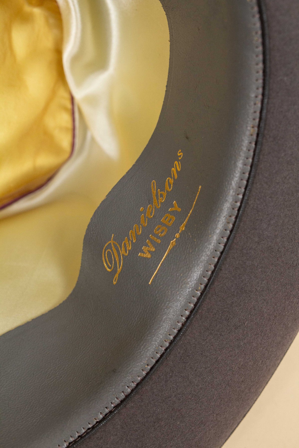 The hat is mid-grey in colour and features a black hatband with a light grey edge binding, slightly lighter than the felt itself. The interior is lined with champagne-coloured silk, bearing both the manufacturer’s and the importer’s logos at the crown. It has a grey leather sweatband that complements the overall colour palette of the hat. Both logos appear once again on the sweatband, this time stamped in gold.