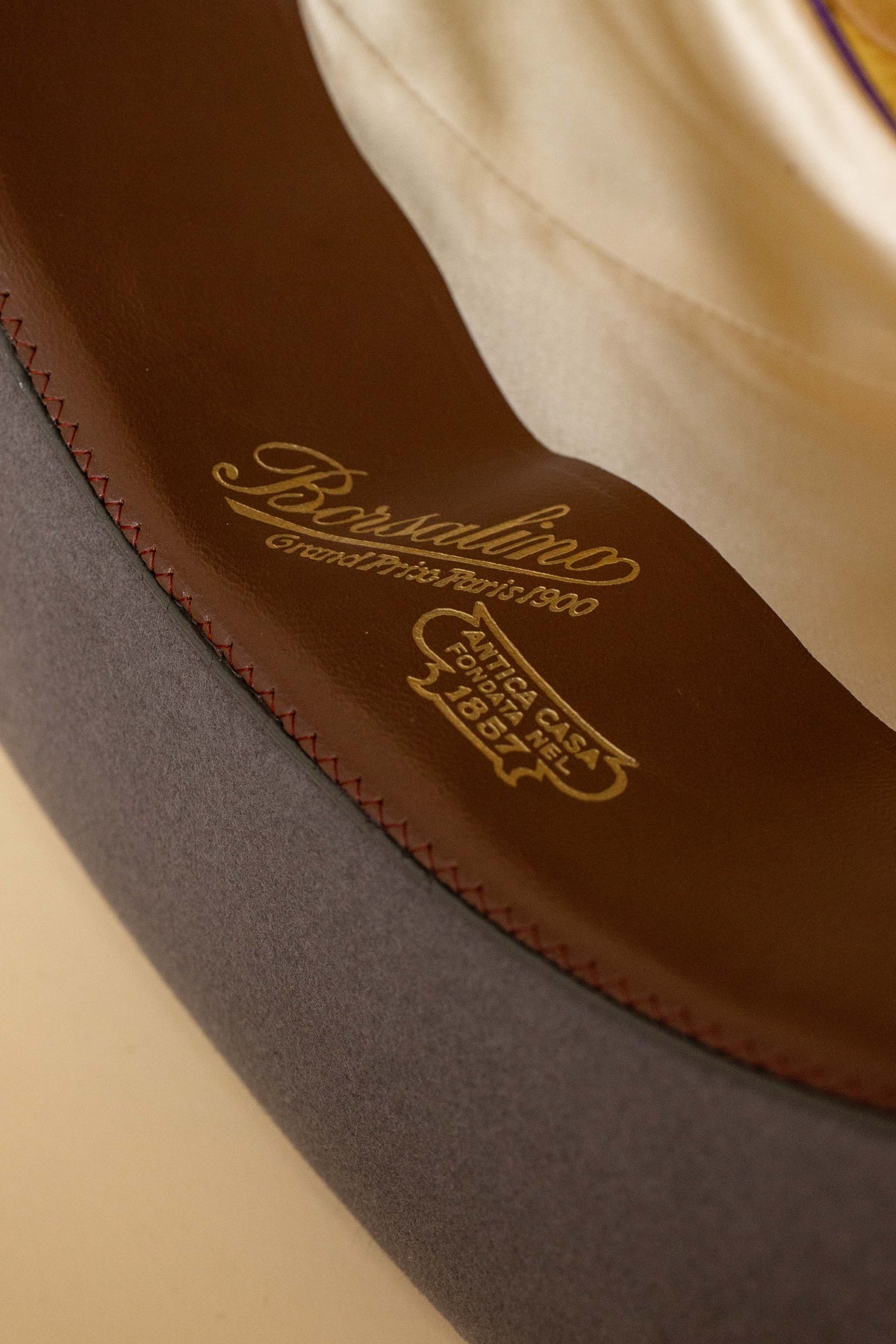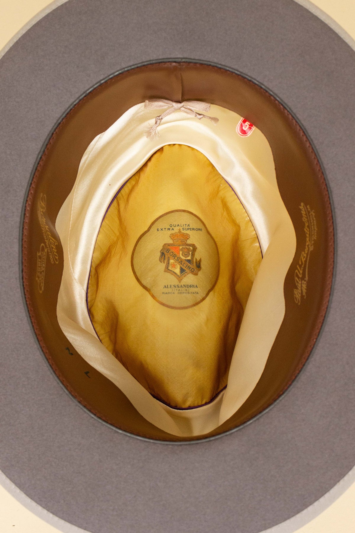 The colour could best be described as steel grey, and it is finished with a black grosgrain ribbon. The interior is lined with silk fabric featuring the Borsalino logo, and it has a brown leather sweatband.