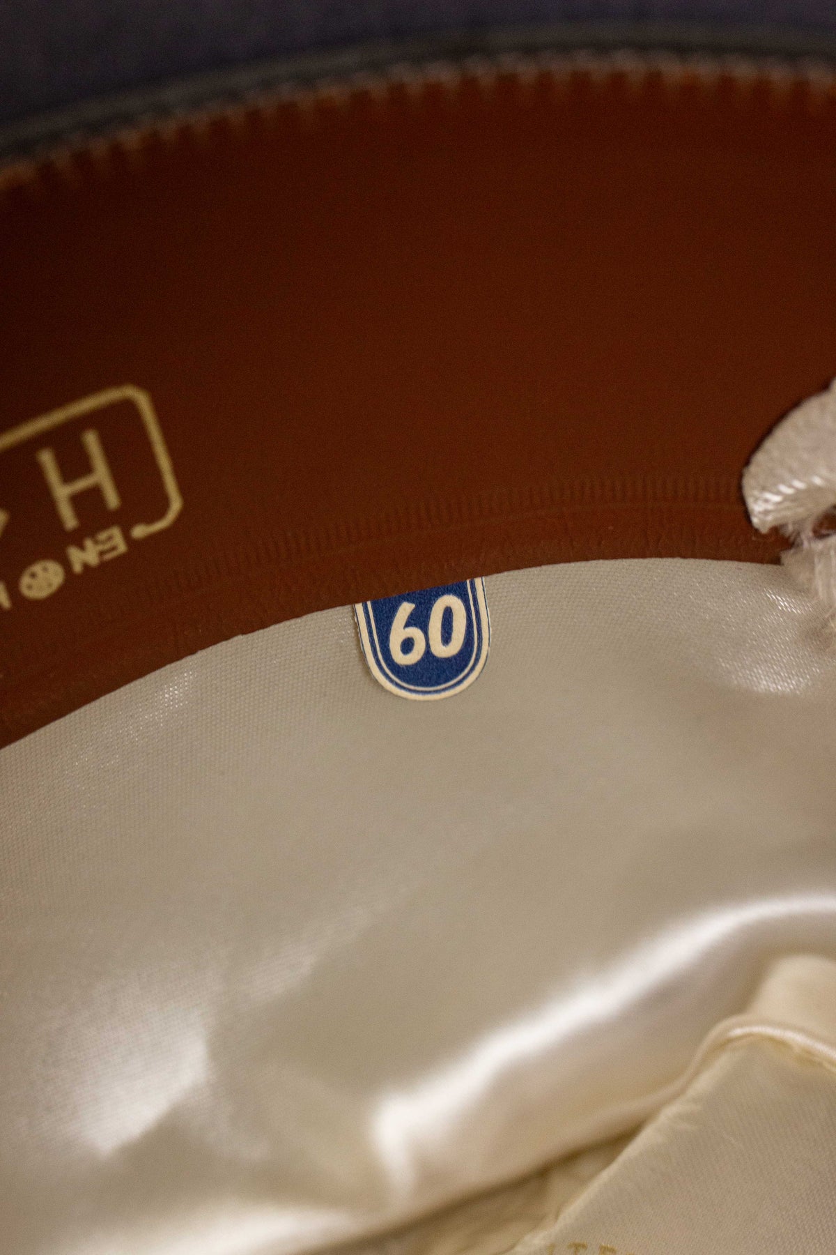 The hat is marked as size "60" inside, but the actual inner circumference measures 59.5 cm. It can be stretched by approximately half a size using a hat stretcher if desired. Please scroll down for additional measurements.
