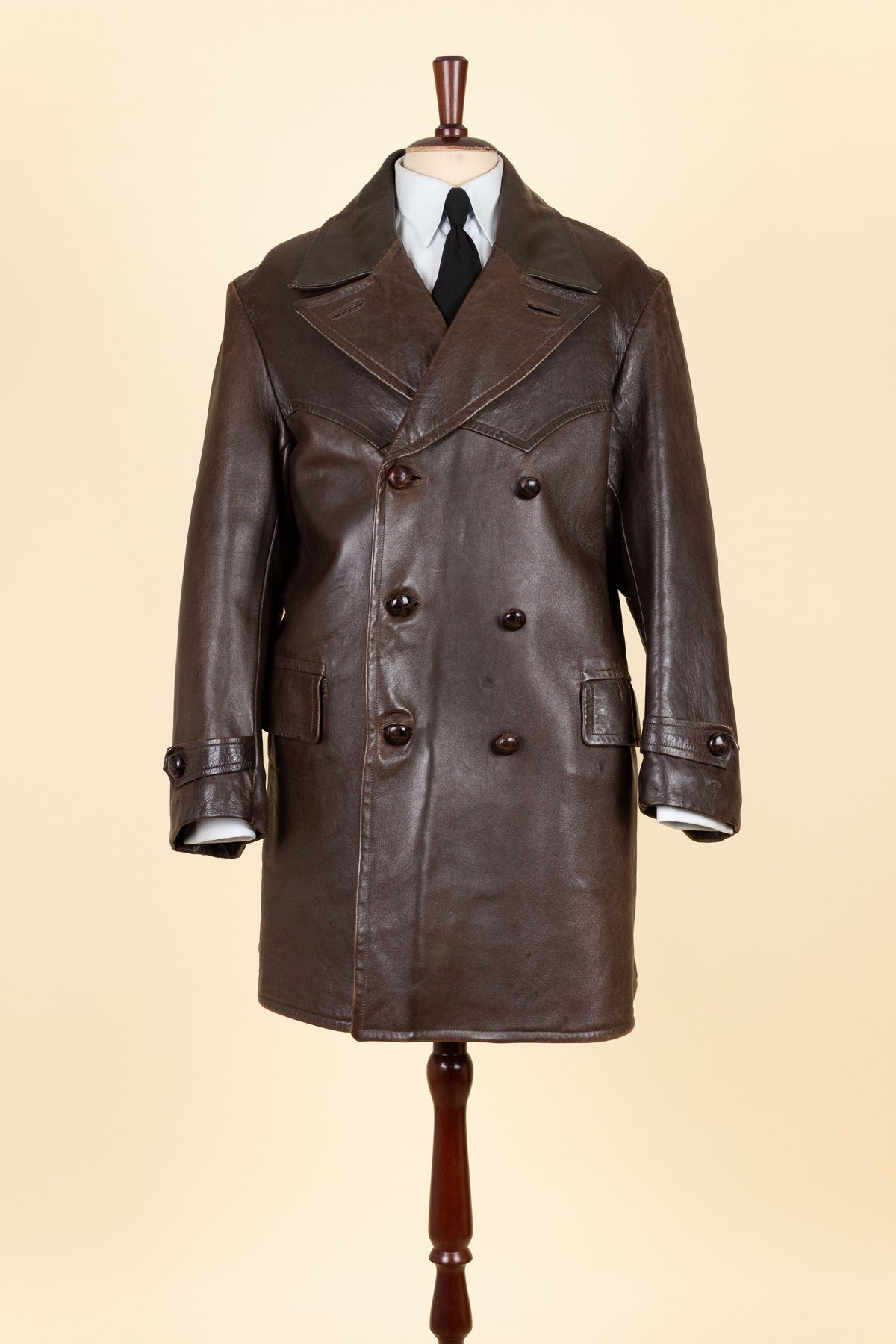 The jacket is double-breasted, fastening with three rows of buttons, plus an additional top button that allows it to be fastened all the way up to the collar. The buttons are covered in leather, and it has horizontal front pockets with flaps. Each lapel features a buttonhole. The back is straight and closed - it lacks a vent. Inside, the jacket is fully lined with a brown herringbone-patterned wool fabric. There is an inner pocket on the right-hand side, and at the sleeve ends of the lining there are elastic cuffs, designed to prevent dirt and moisture from entering the sleeves.