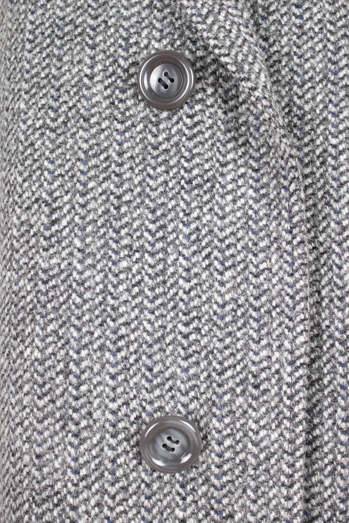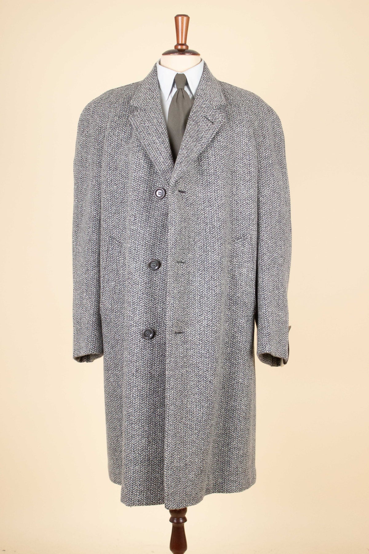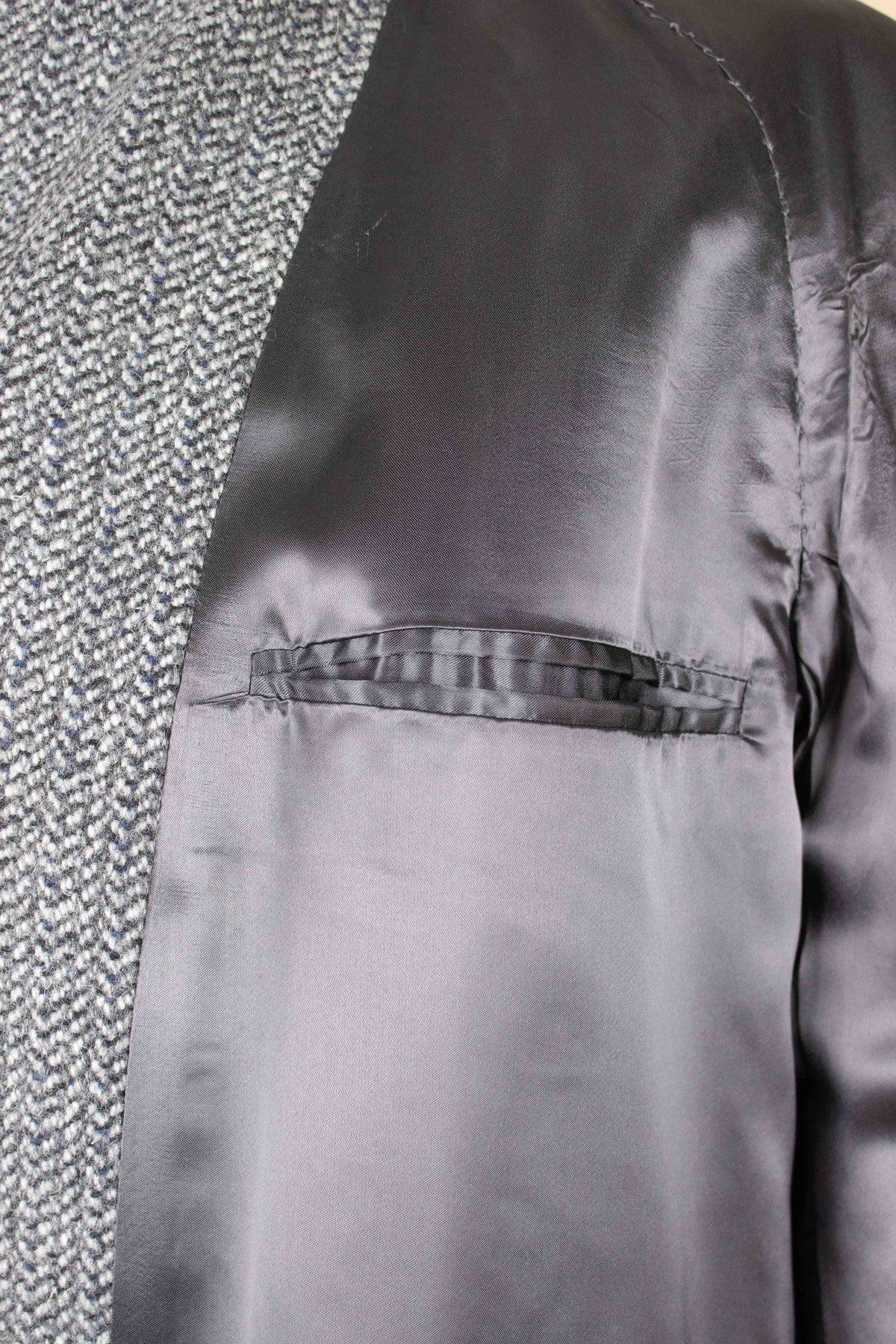 This overcoat most likely dates back to the early 1950s. It has never been used, the original tag is still attached to the left sleeve. It is made in a grey tweed fabric with some blue elements. It has a three button single closure and vertical front pockets. It has a vent in the back. The coat is fully lined and has two inner pockets, one on each side. The condition is perfect, there are no visible damages. Please have a look at the images and evaluate the condition.