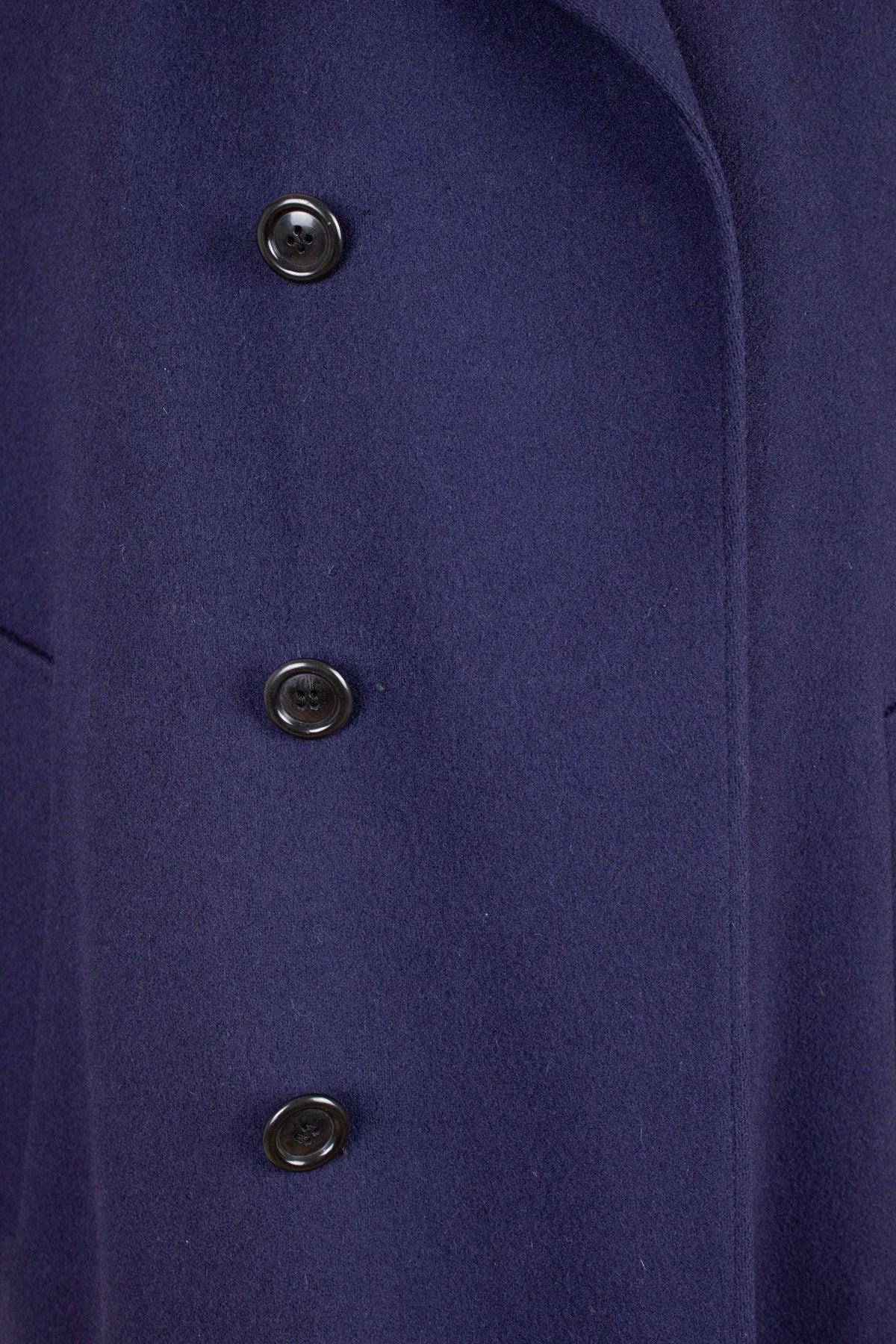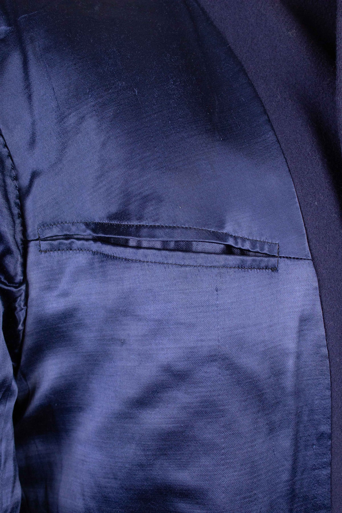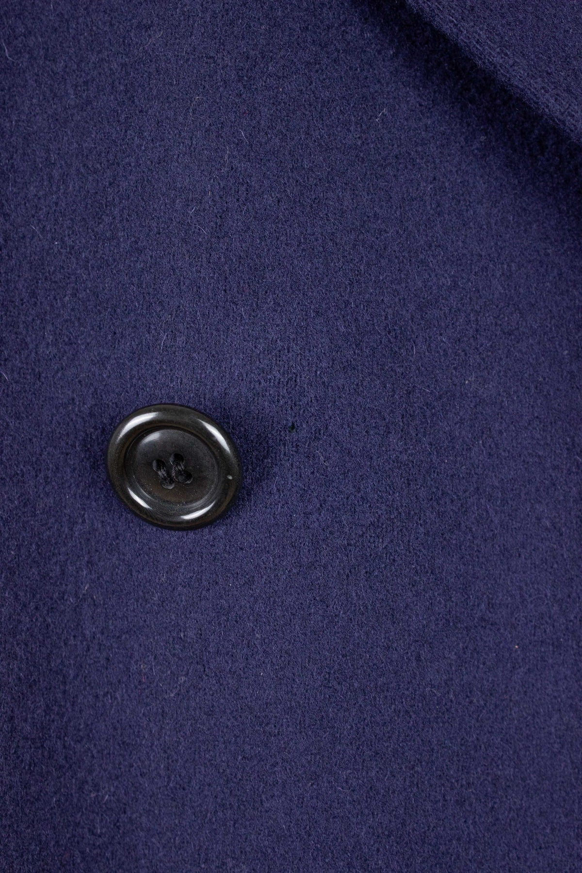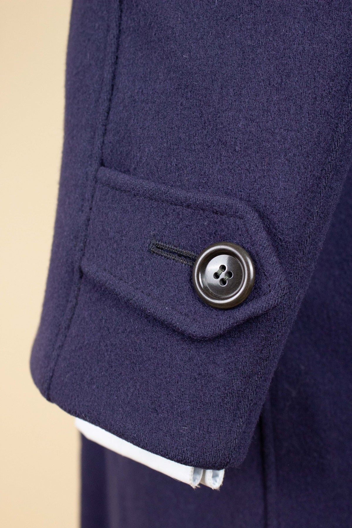 It is made from a heavy wool fabric in a distinctly navy blue tone – slightly more vivid than the more muted hues typically seen in coats from this era.
