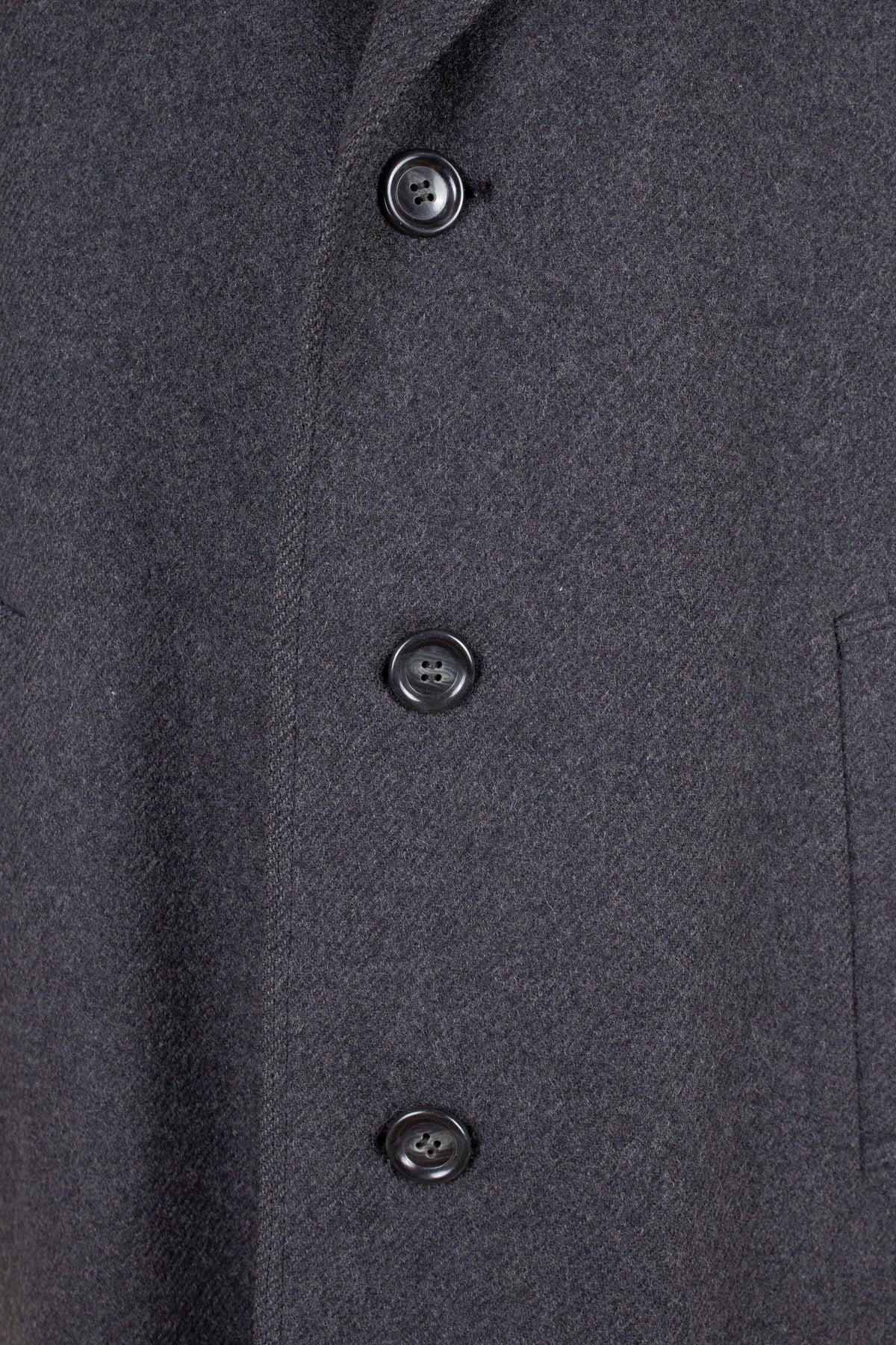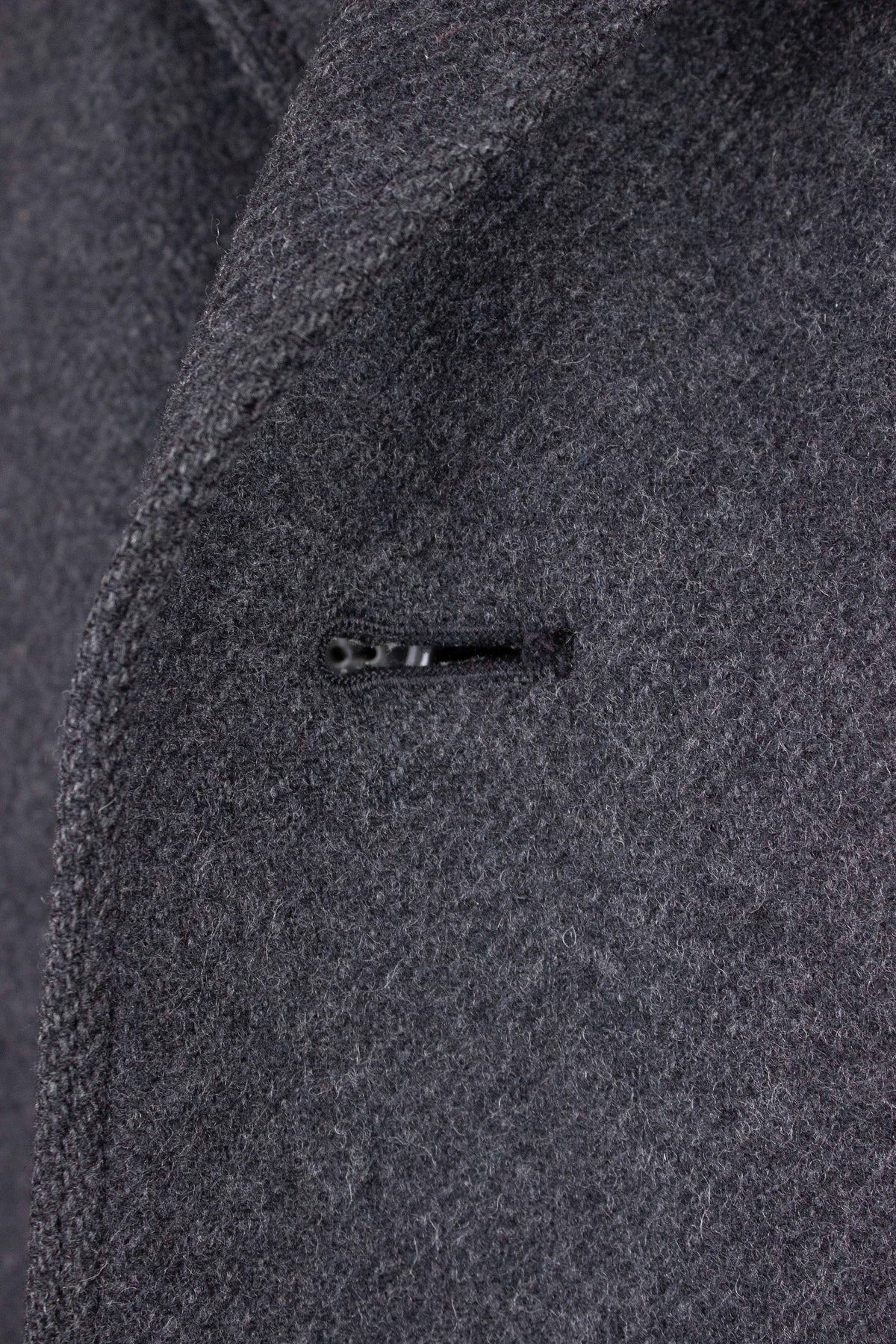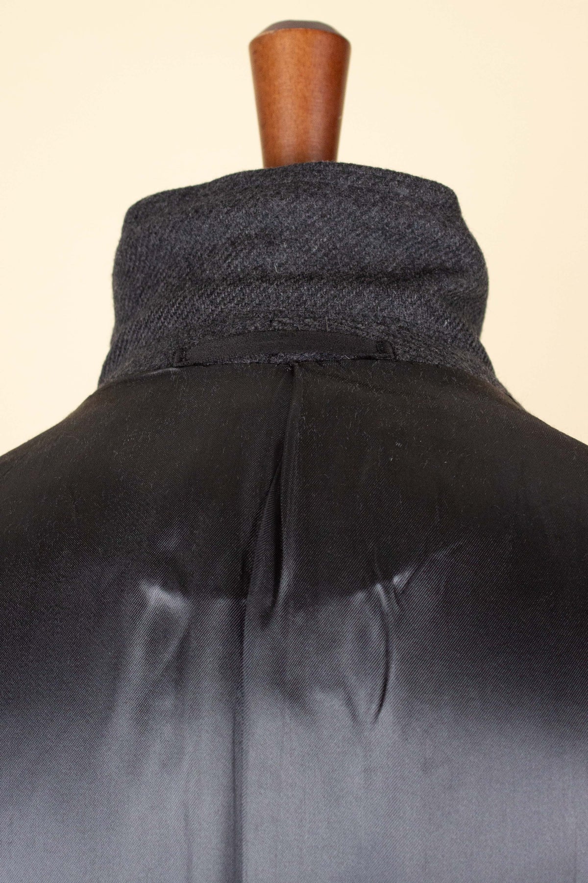 The coat is single-breasted with three buttons and features large vertical front pockets. There is a buttonhole on the left lapel. The back is straight with a vent. The interior is fully lined with grey silk and includes an inner pocket on the right side.