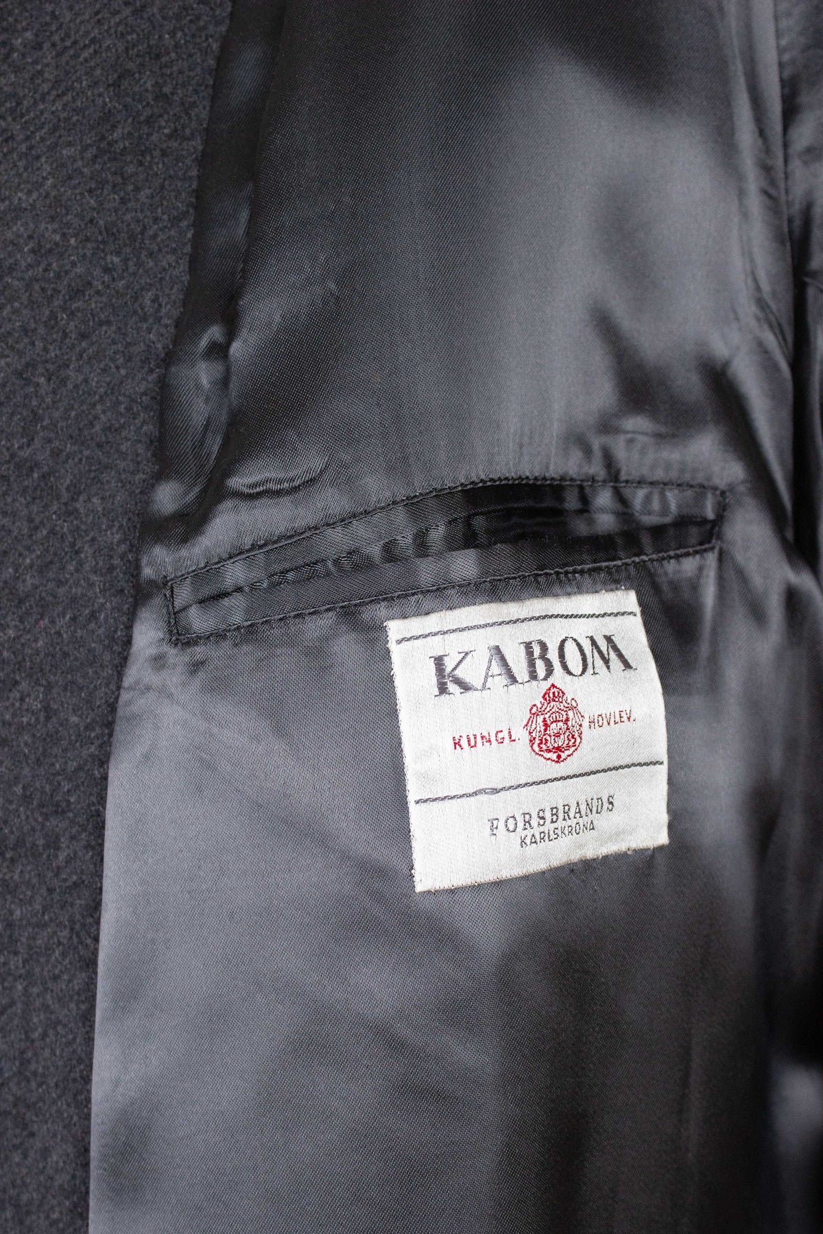 This coat is of Swedish origin, made by the brand Kabom and originally sold at Forsbrands in Karlskrona, southern Sweden. It is crafted from a solid grey wool fabric with a distinct twill texture.