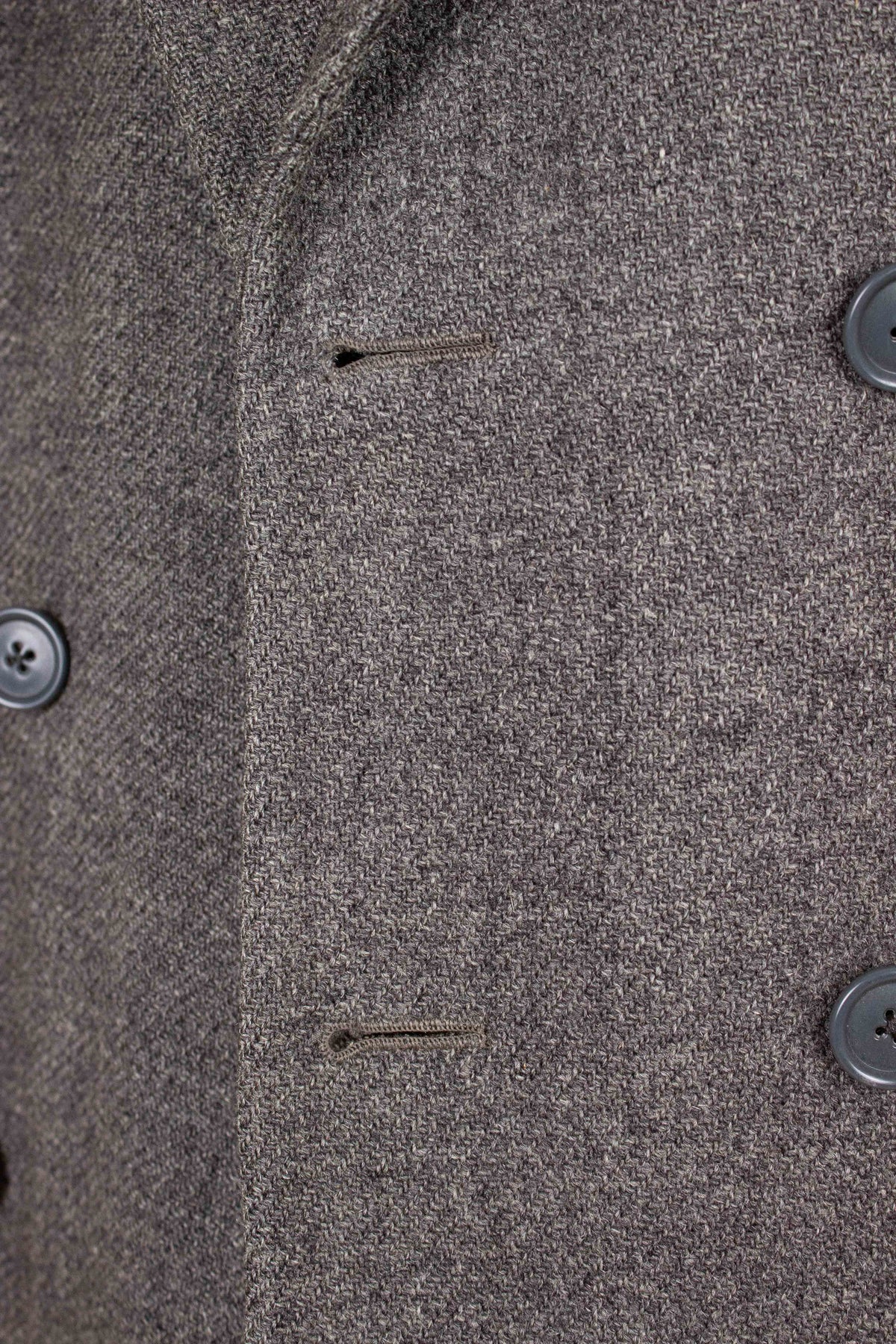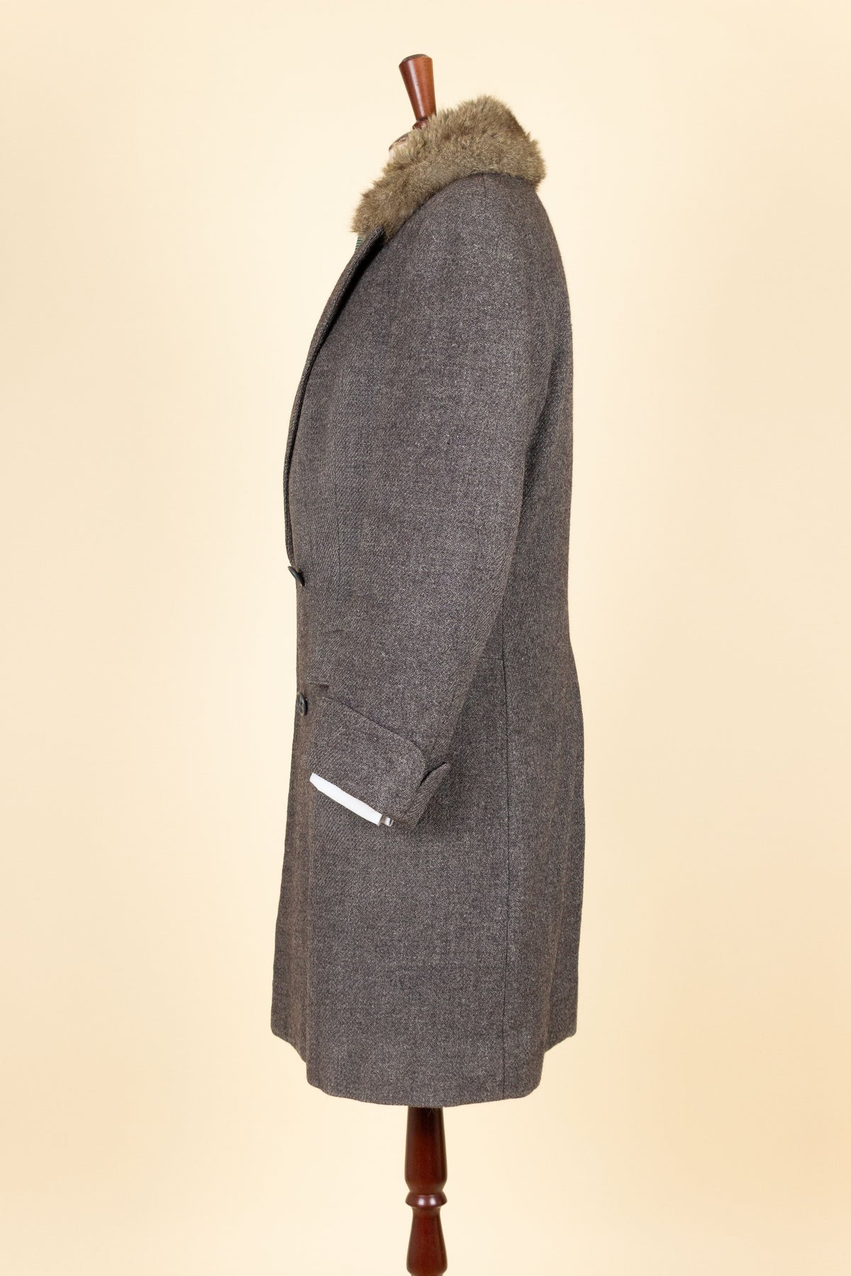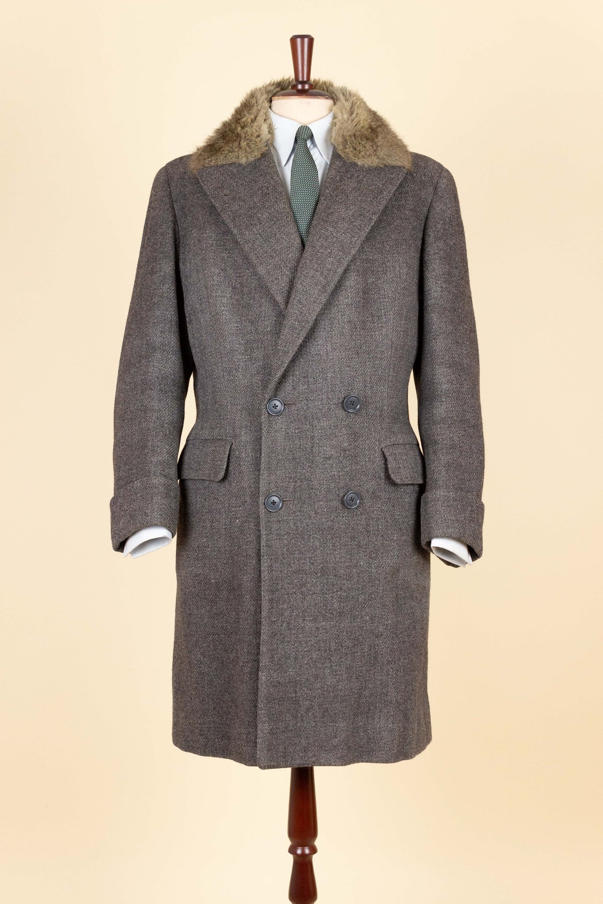 This coat is of Swedish origin and was made bespoke in November 1956 by D. Rein. Nordin in Stockholm. It has quite a distinctive look, featuring grey-melange Harris Tweed, a fur collar, and a fur lining. The collar is most likely silver fox, while the lining appears to be made of muskrat.