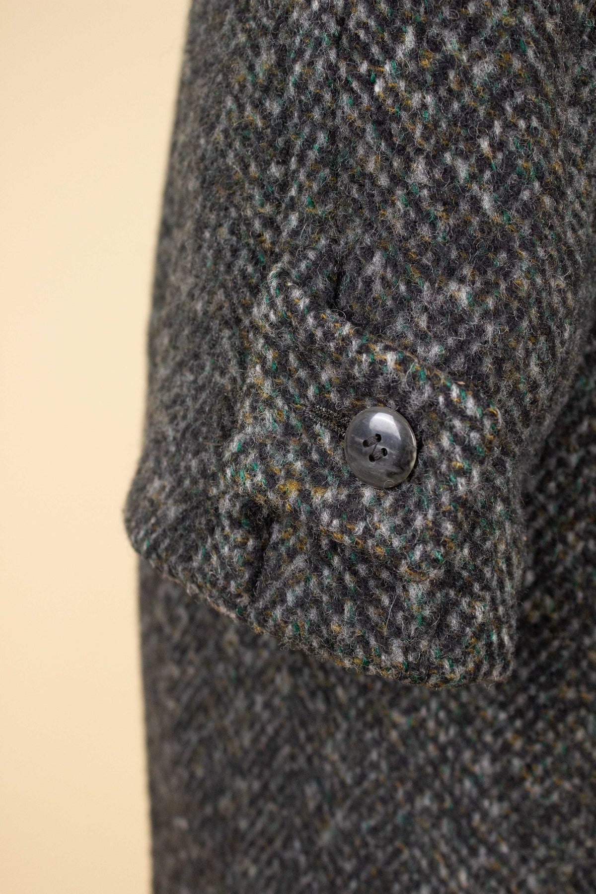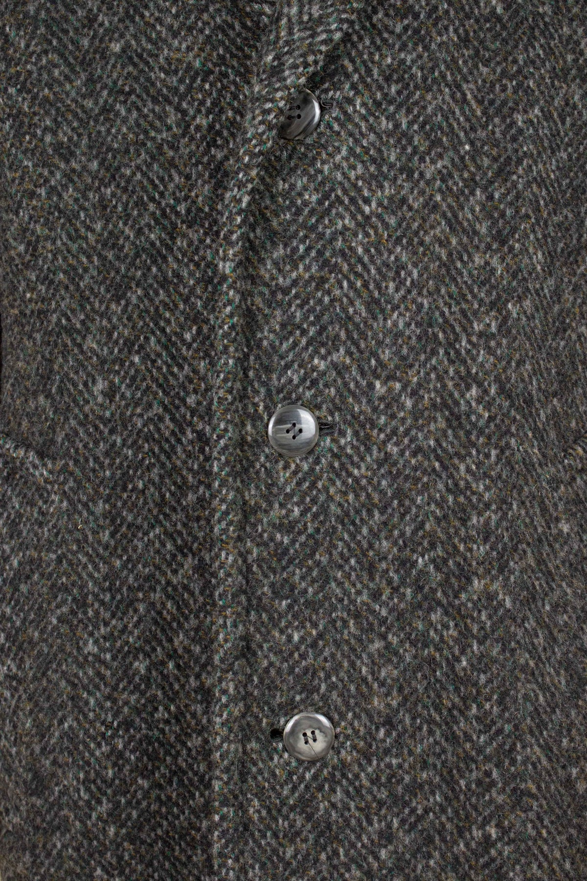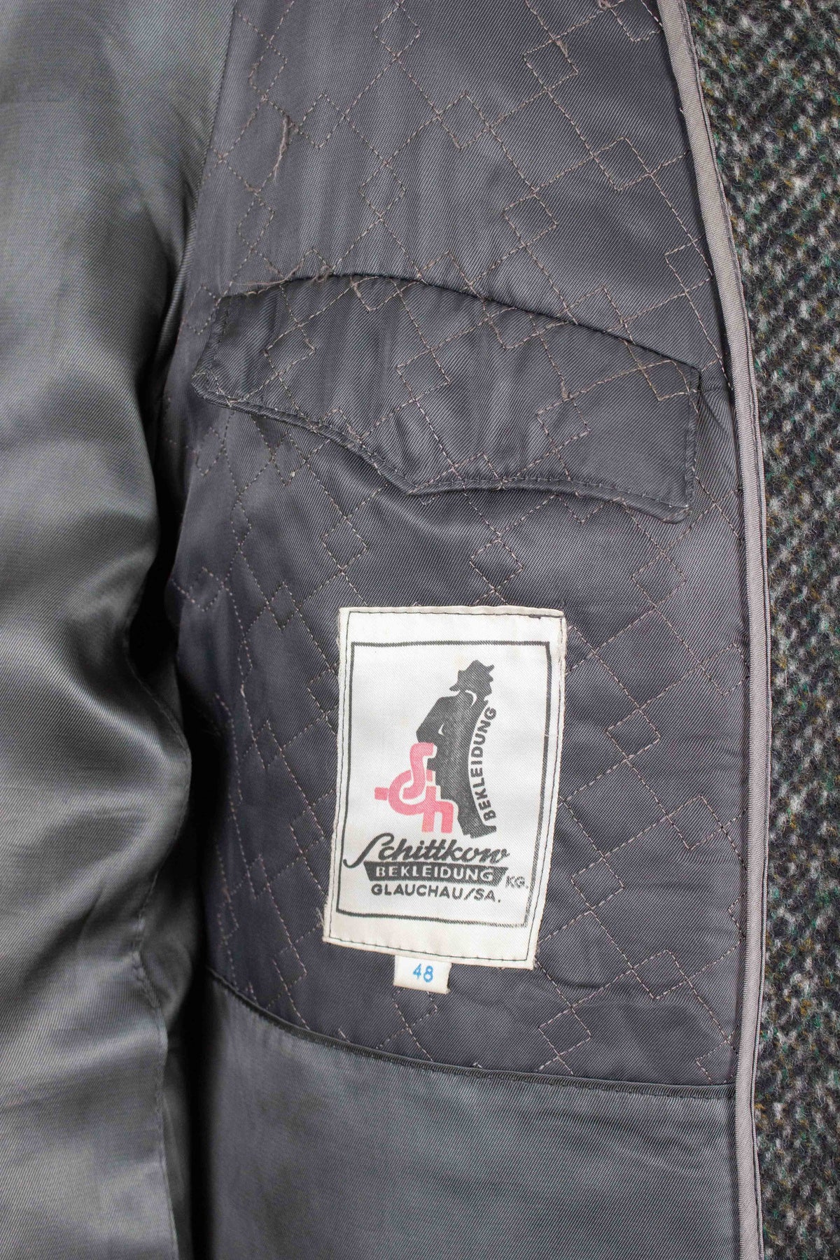This coat is of German origin. It is by the brand Schittkow Bekleidung and was most likely produced sometime during the 1950s or 1960s. It is made from a mottled grey tweed fabric with a subtle herringbone structure.