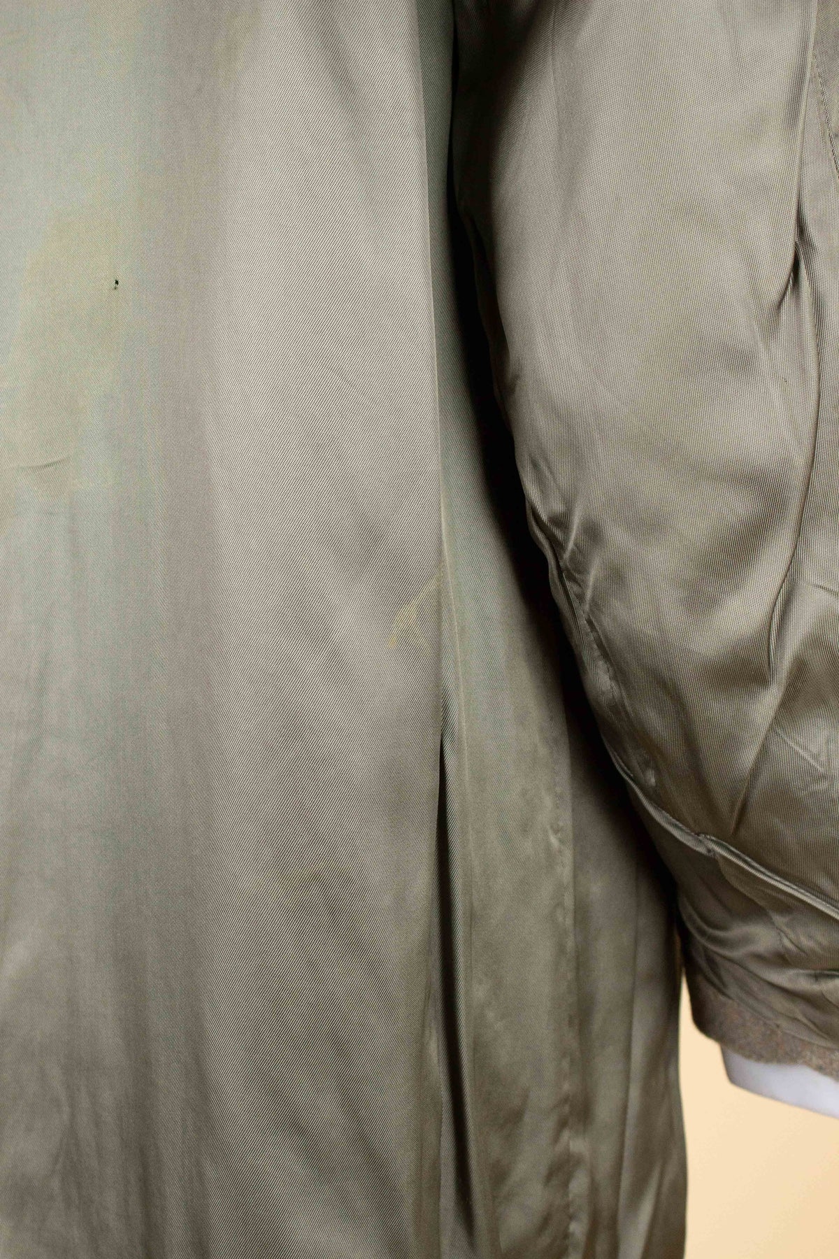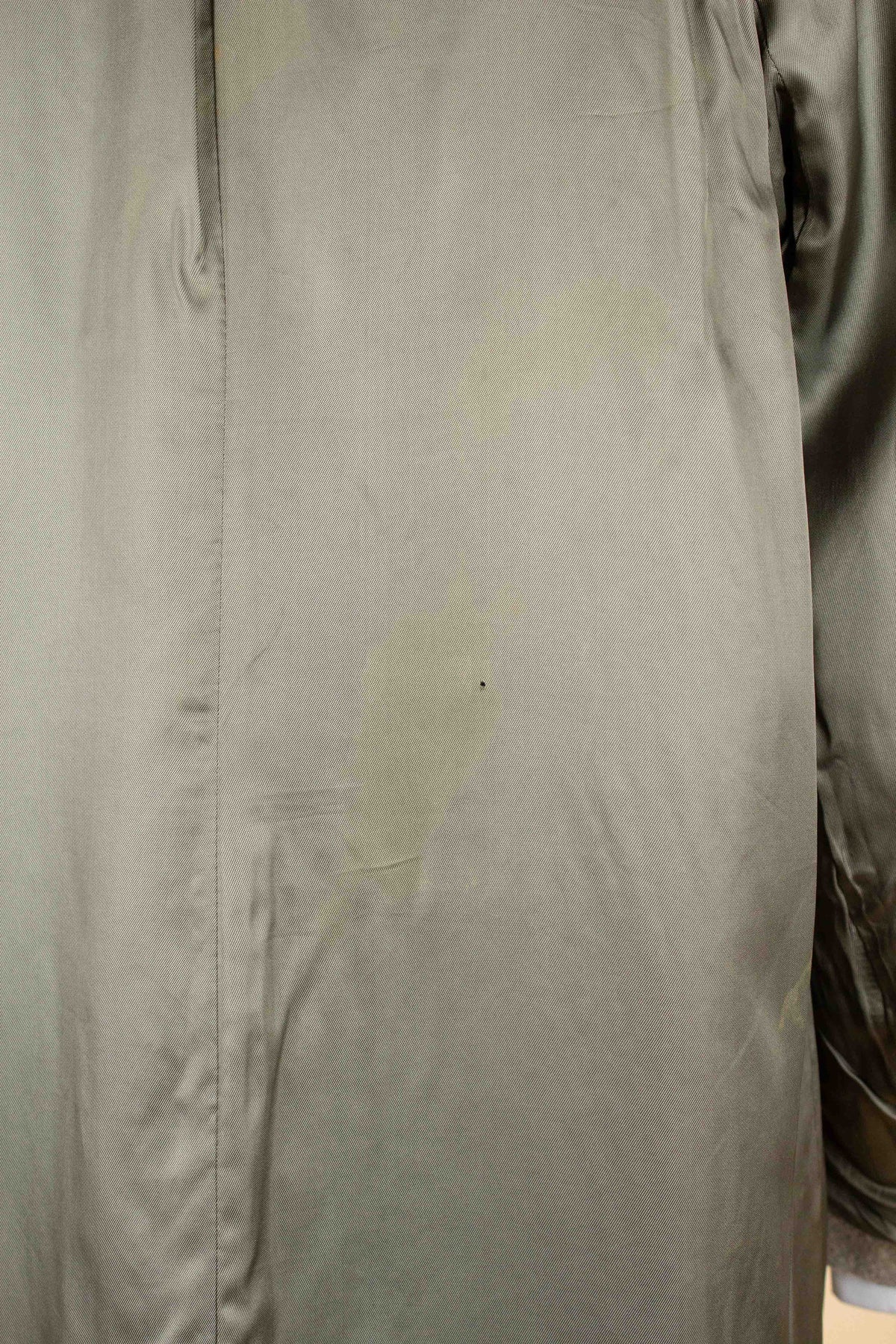 As for the condition, there are some points to note. There are a few damages to the fabric - including at the collar, at the lower front edge, and on the left sleeve. The lining shows some discolouration as well. Due to the coarse texture of the fabric, the flaws are somewhat less noticeable than they would be in a finer material. The coat is fully wearable in its current state, but the buyer should be aware of and consider these issues before purchase. Please study the photos carefully to form your own opinion of its condition.