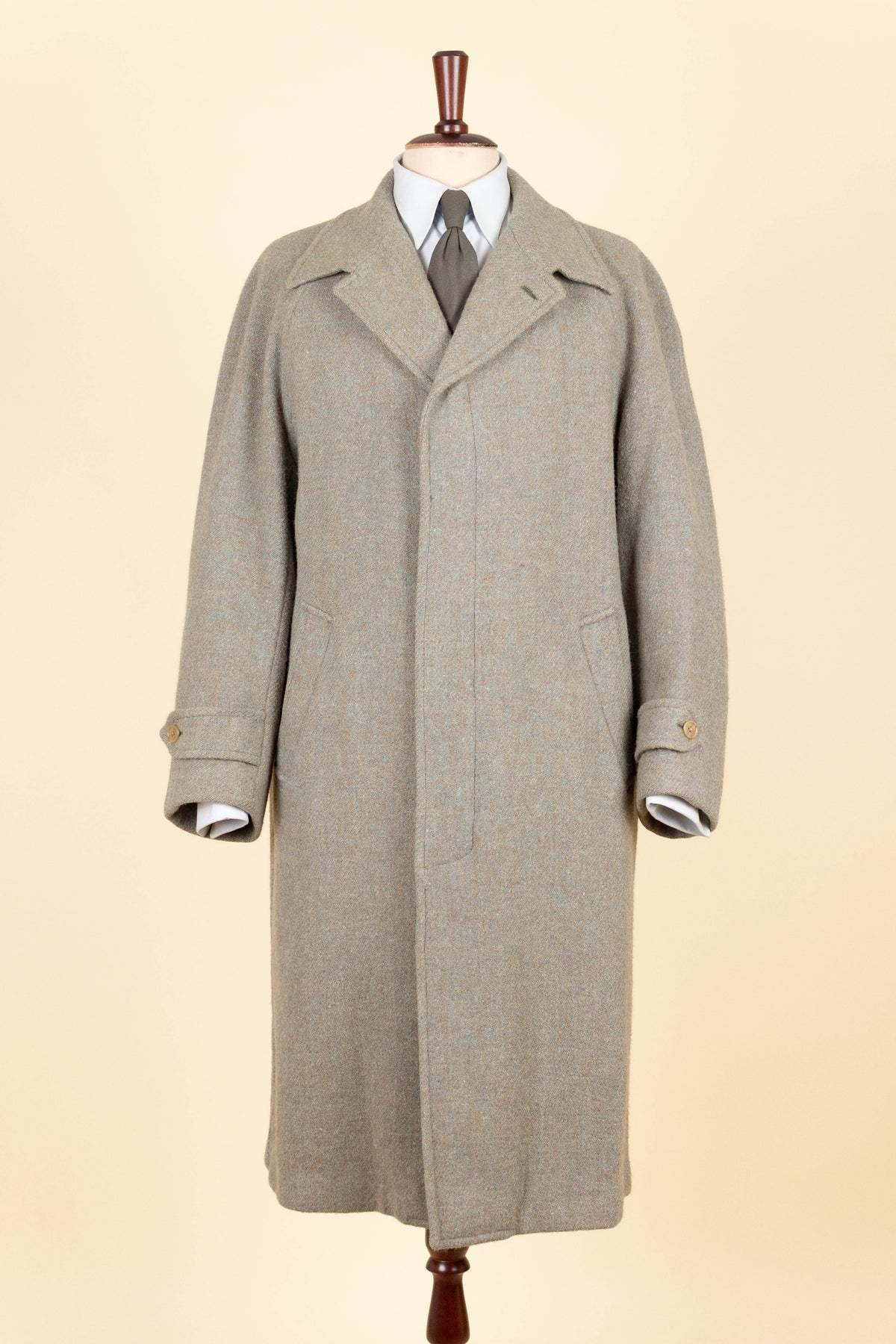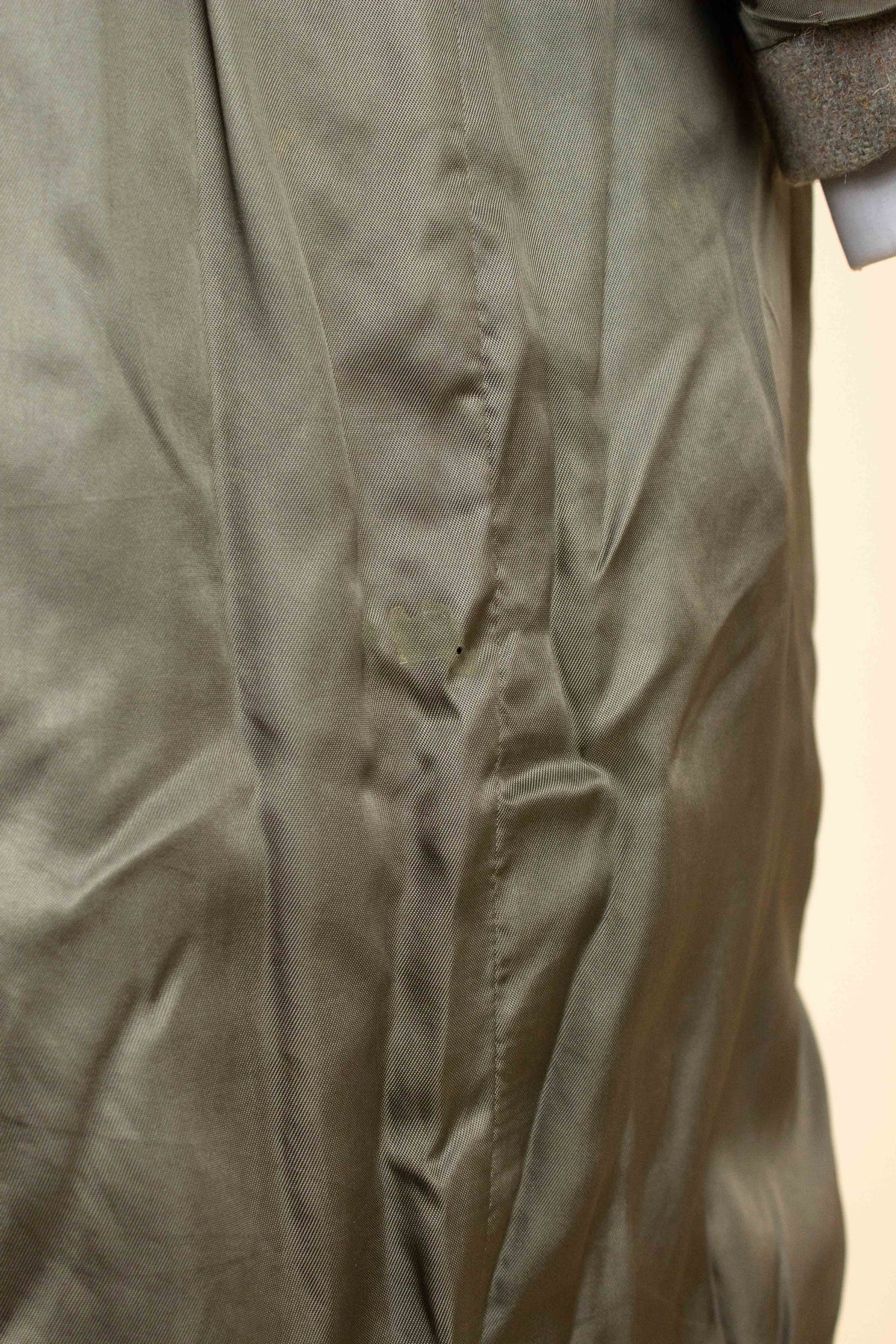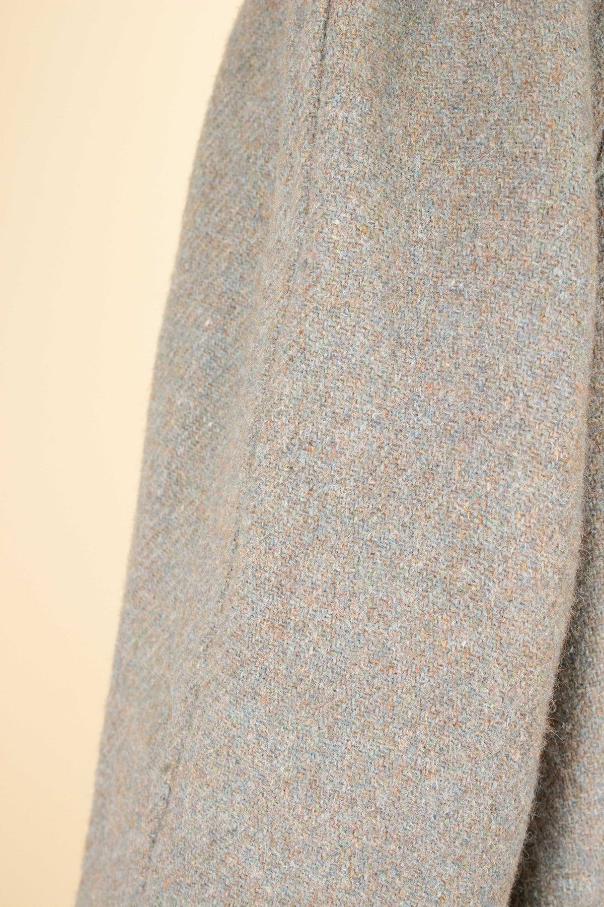 This coat is of British origin and was made sometime during the 1940s or 1950s. It is by the brand Trent and was originally sold at a shop called Chart & Lawrence in Horsham, southern England. It is crafted from a greenish-grey Harris Tweed fabric with subtle hints of brown and blue that become visible when viewed up close.