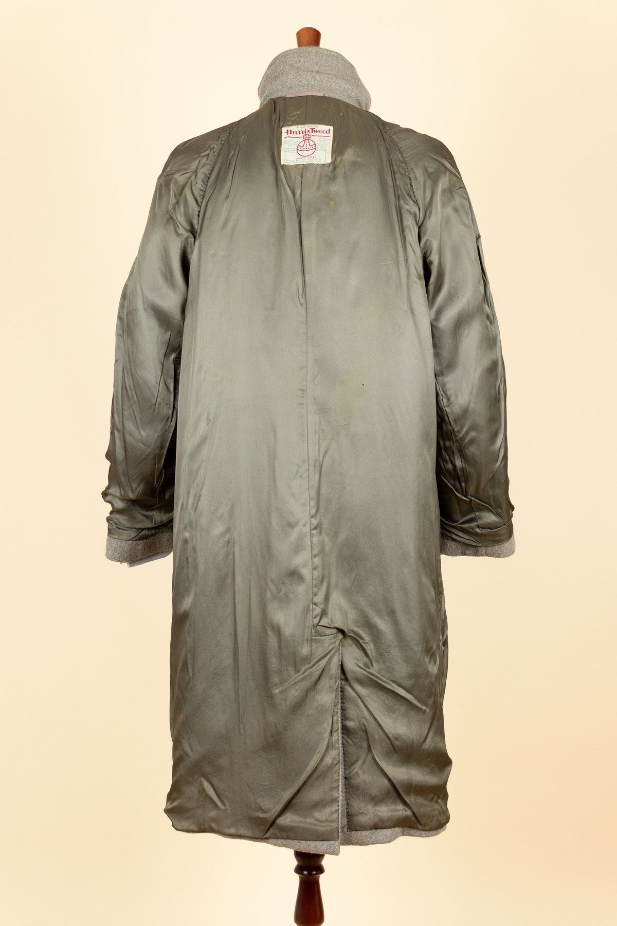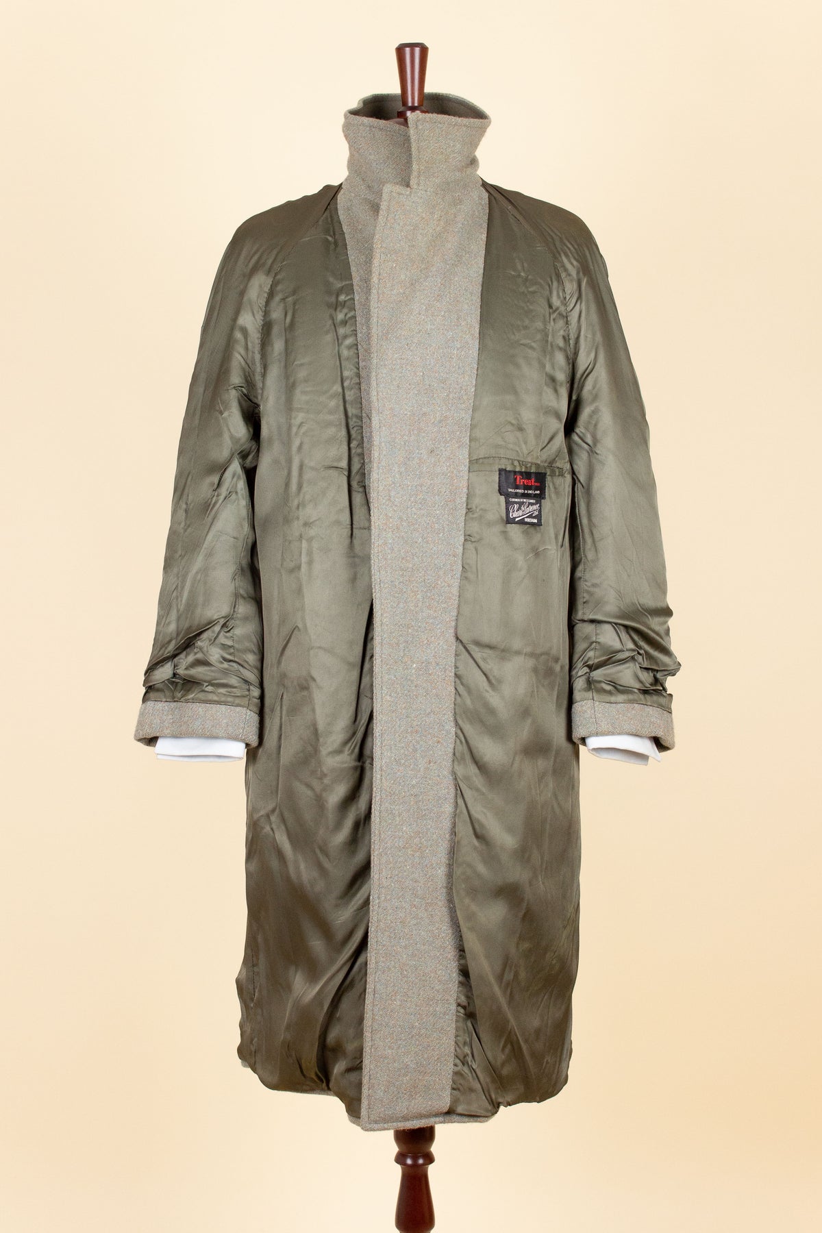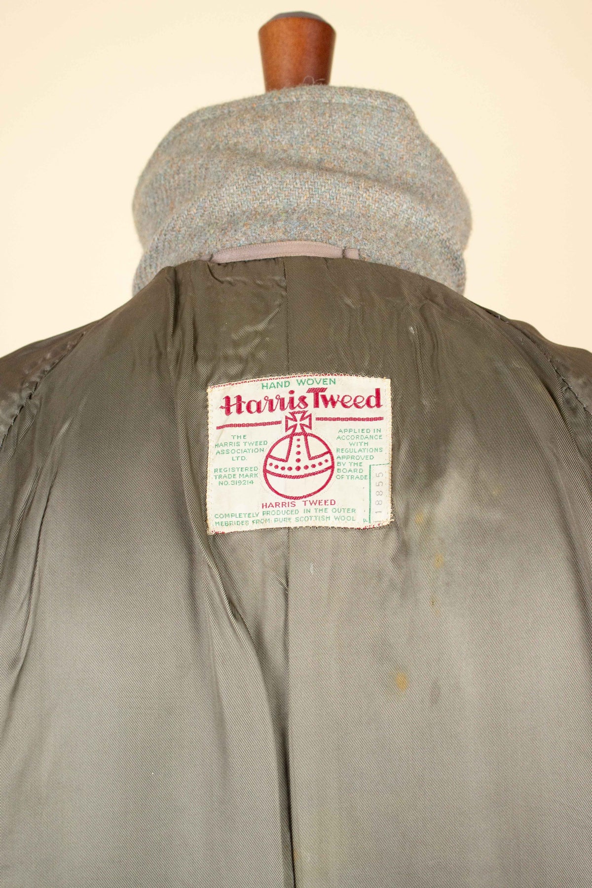 This coat is of British origin and was made sometime during the 1940s or 1950s. It is by the brand Trent and was originally sold at a shop called Chart & Lawrence in Horsham, southern England. It is crafted from a greenish-grey Harris Tweed fabric with subtle hints of brown and blue that become visible when viewed up close.