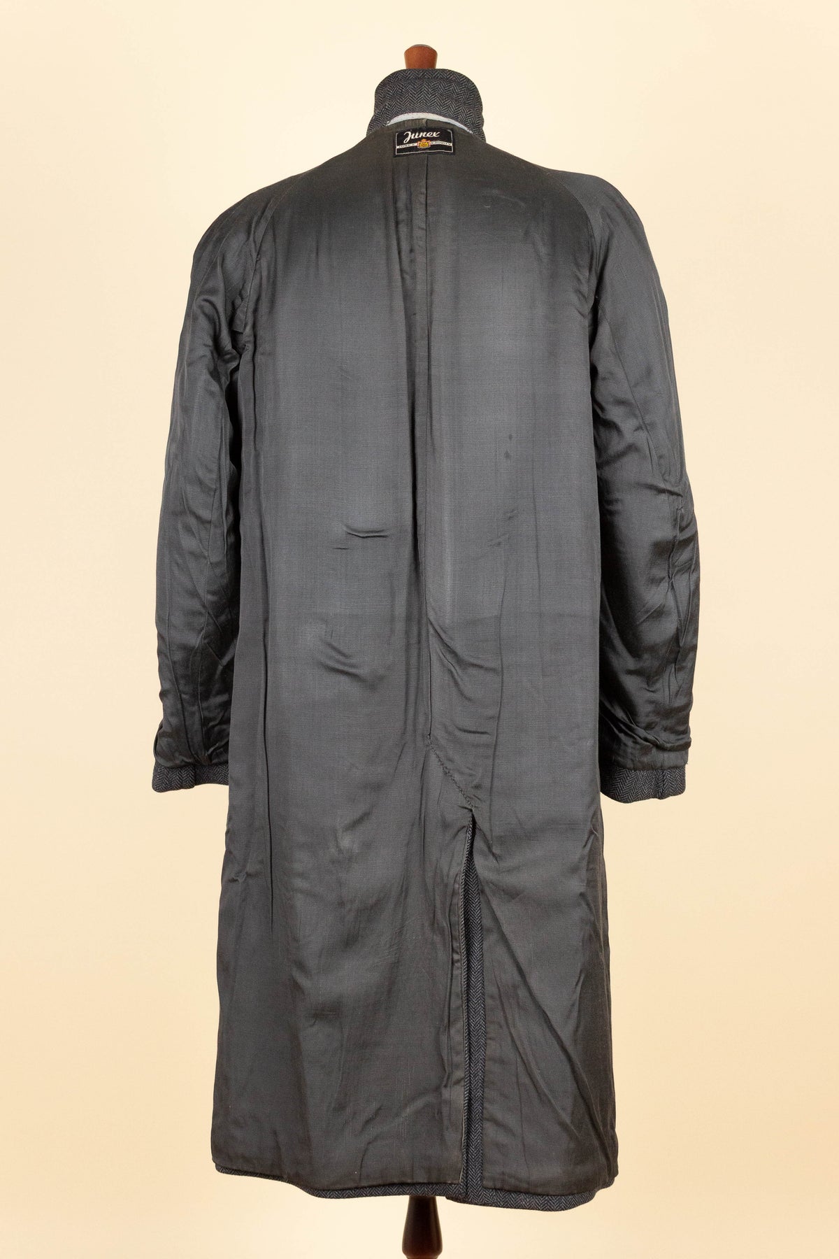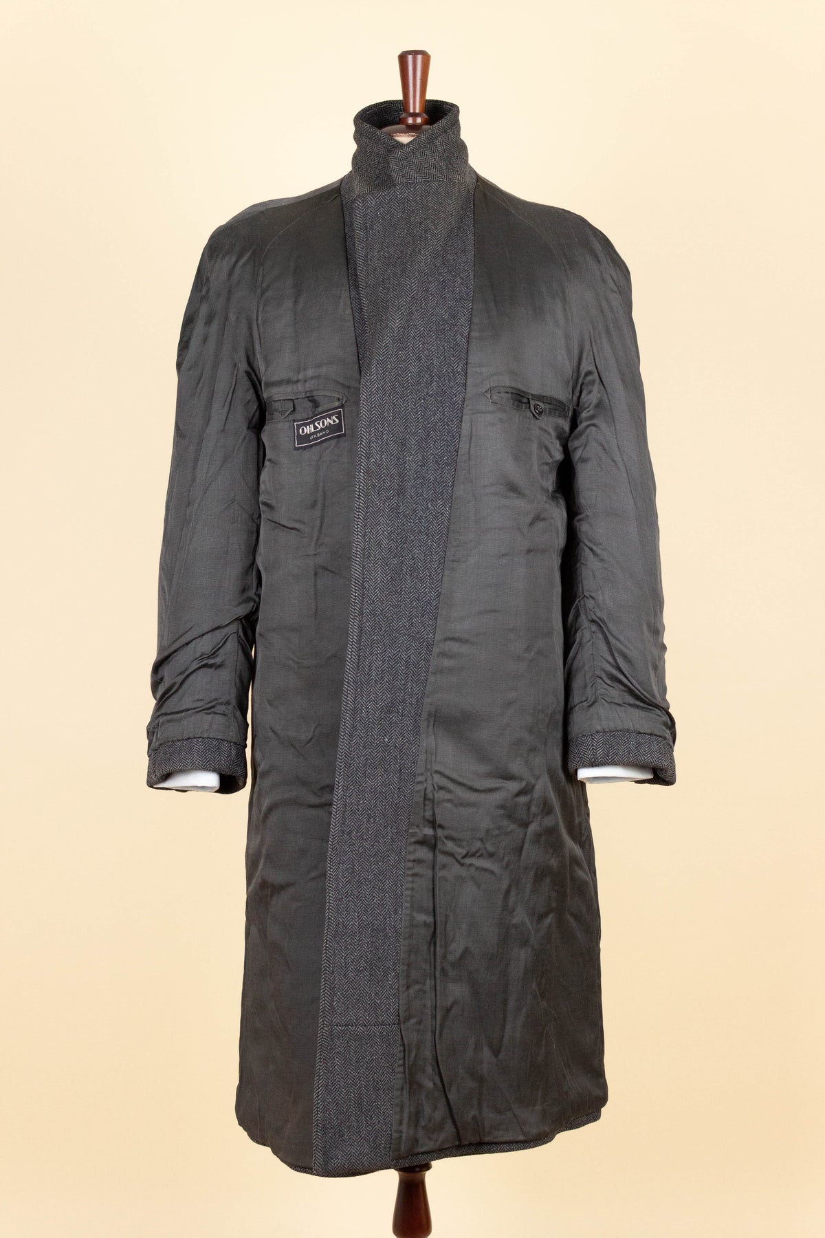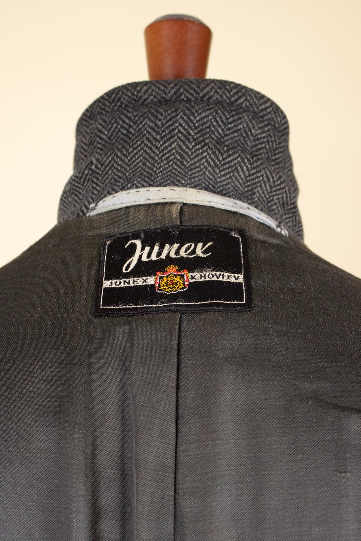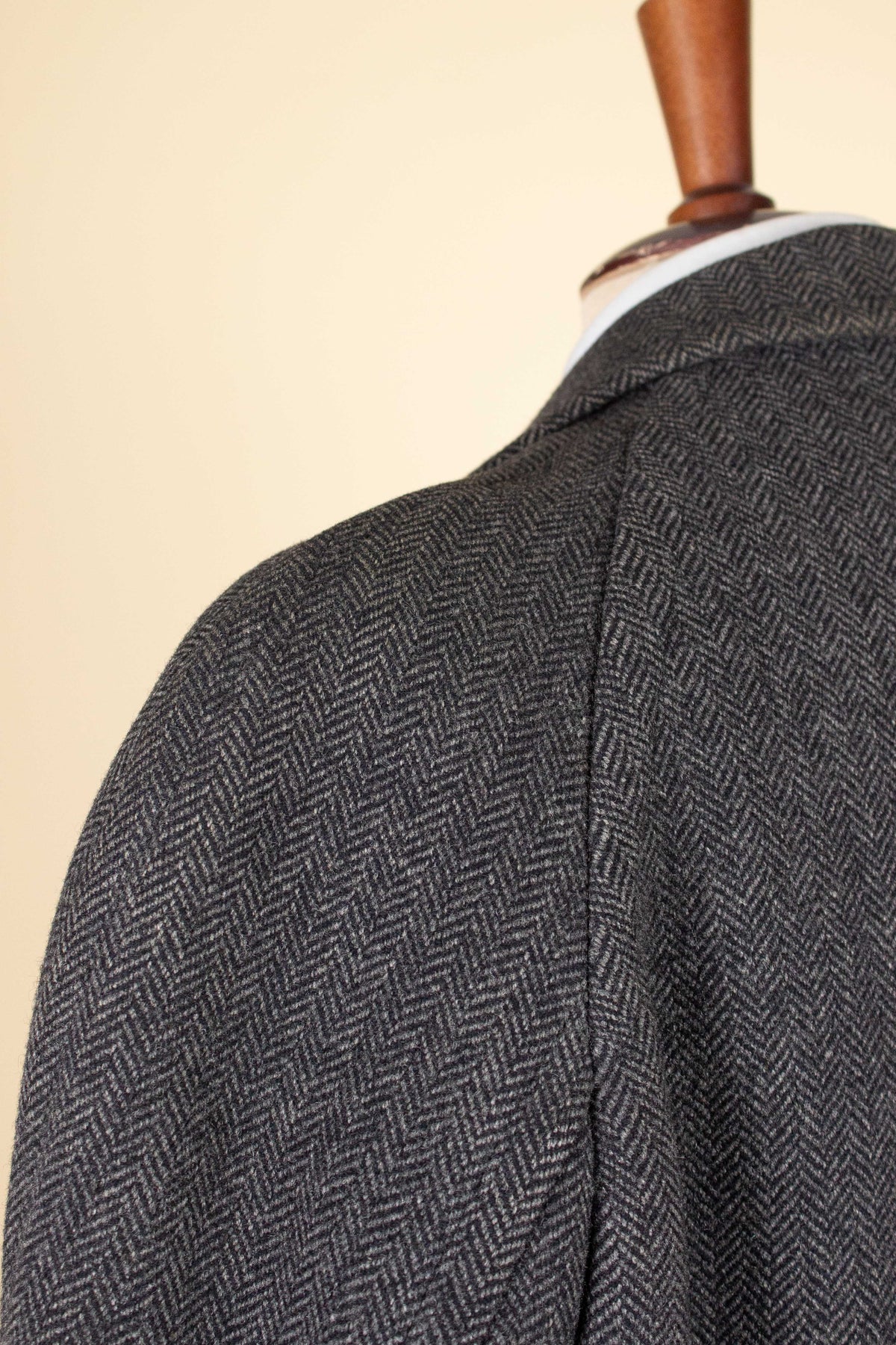 This raglan coat is of Swedish origin. It was made sometime during the 1940s, or possibly the early 1950s. The brand is Junex, and it was originally sold at Ohlsons in Leksand, Dalarna - a shop that, in fact, still exists today. It is made from a heavy grey wool fabric with a distinctly pronounced herringbone structure.