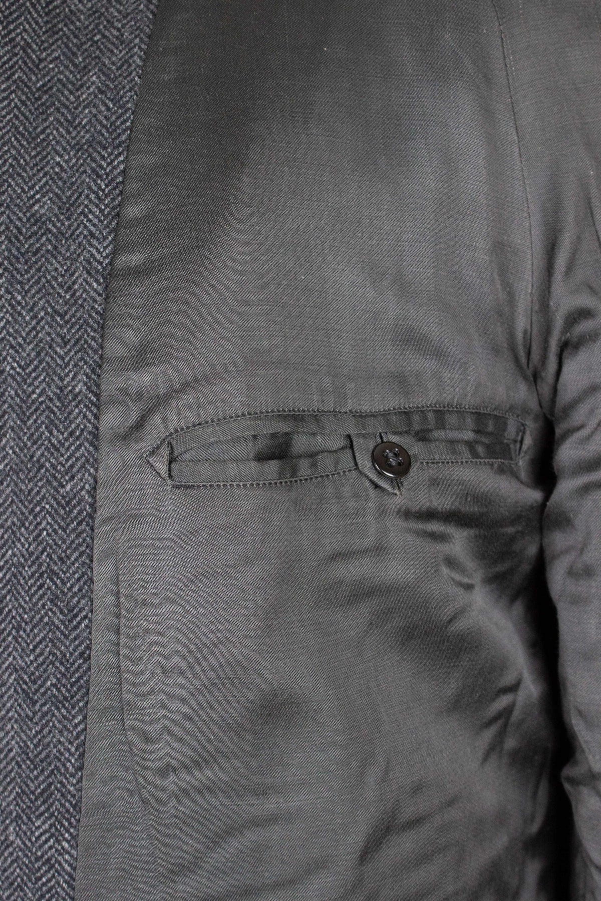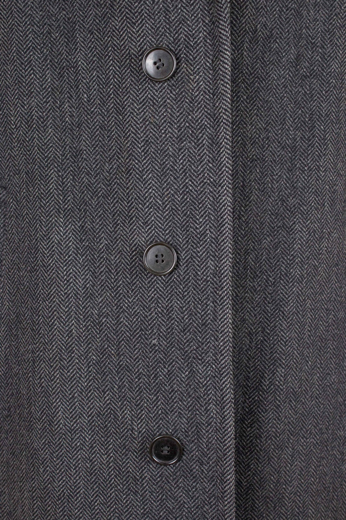 The coat is single-breasted with a concealed fastening. It fastens with three buttons. It has horizontal front pockets. There is a buttonhole on the left lapel. The back is straight with a vent. The interior is fully lined and features two inside pockets with button closures - one on each side.