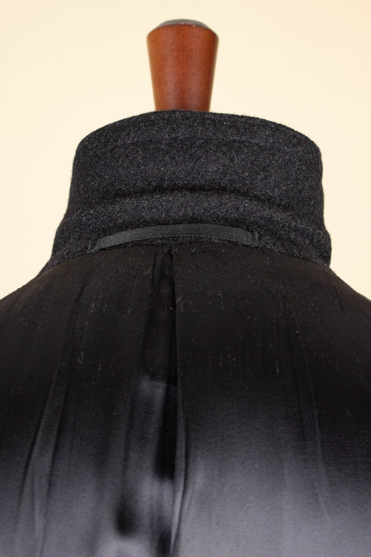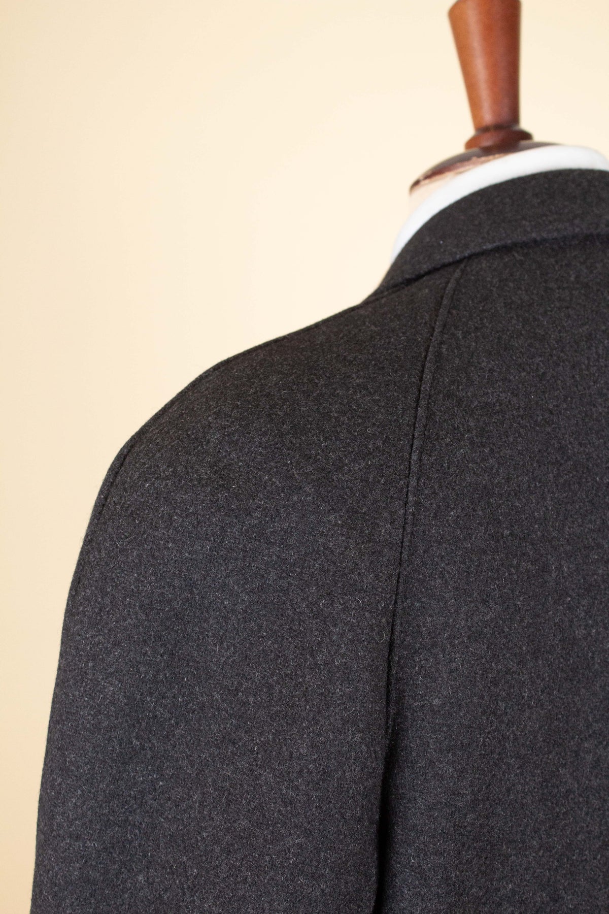 This coat is of Swedish origin and was produced by Dress sometime during the 1950s, a ready-to-wear manufacturer based in Gothenburg. According to the label inside, however, the fabric itself is British and guaranteed to be 100% wool. The cloth is grey in colour and, when examined closely, you can see that it actually has a subtle herringbone pattern.