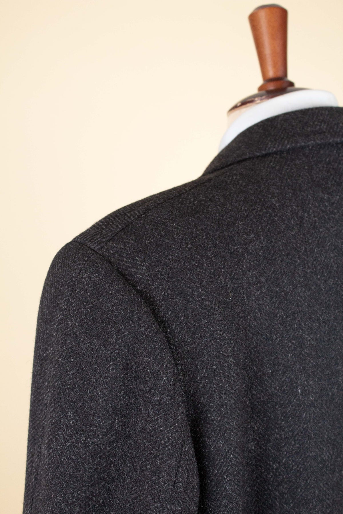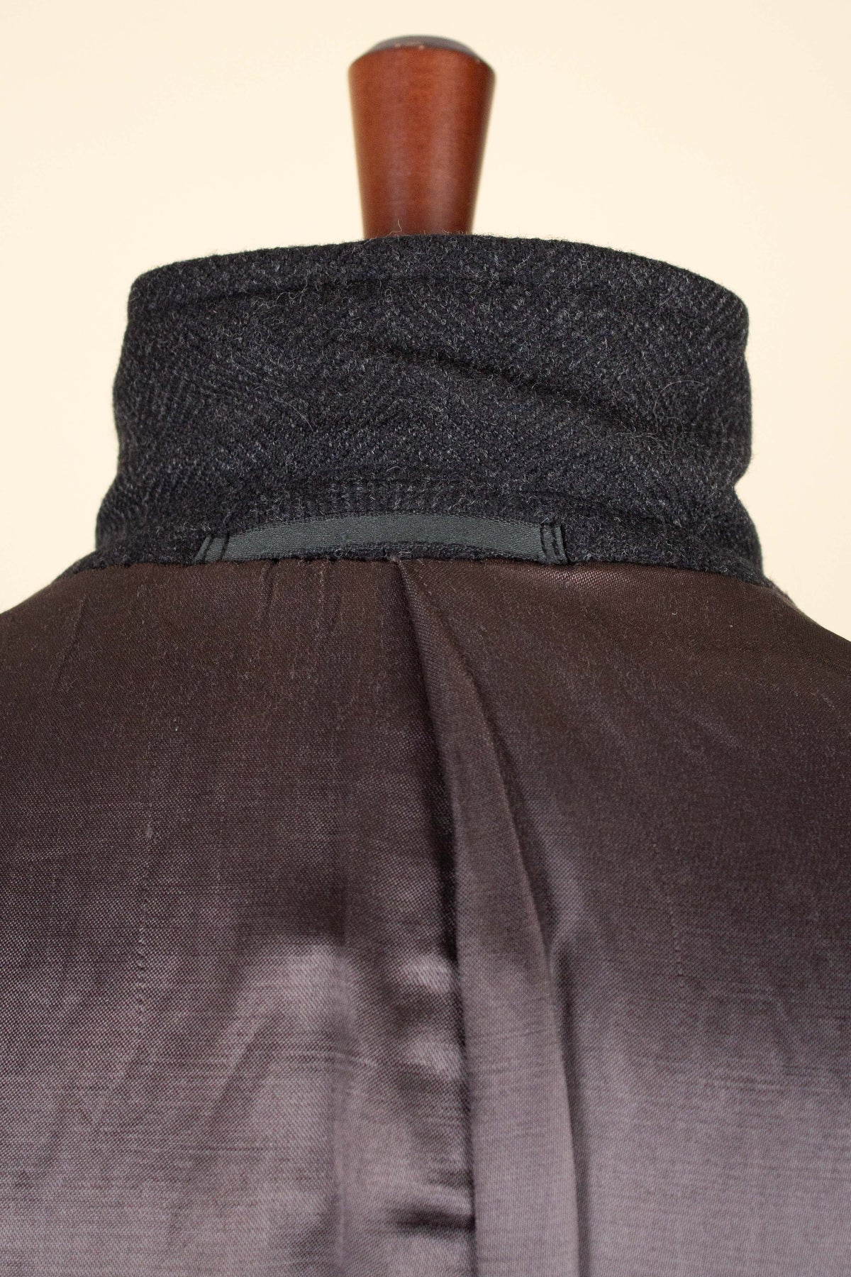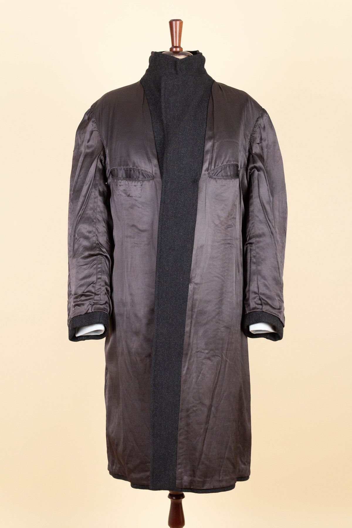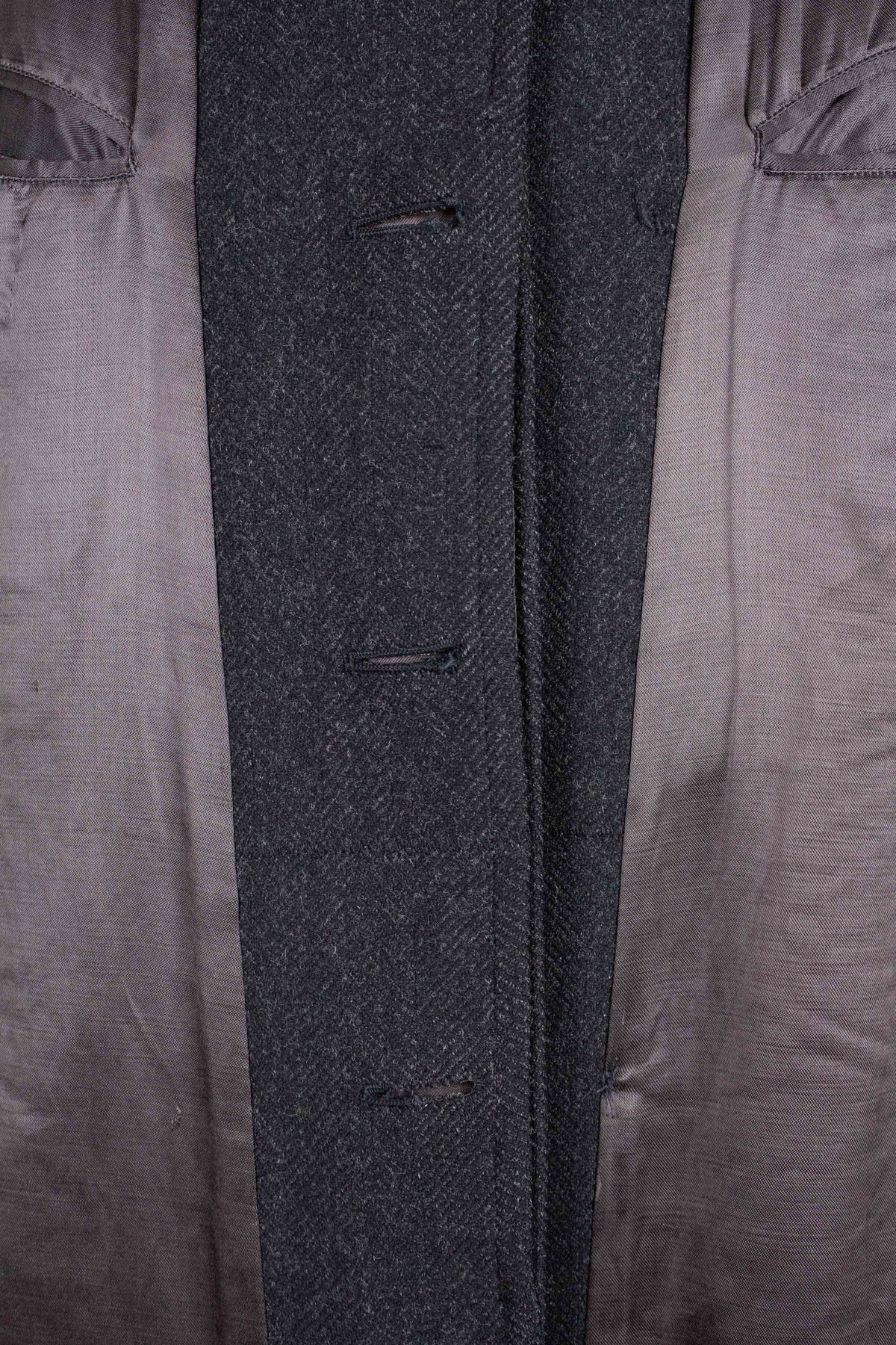 This coat has no labels, so it is not possible to say with certainty exactly who produced it. However, a number of conclusions can still be drawn from studying the garment. It is in all likelihood of Swedish origin and was produced sometime during the 1940s. It is made from a heavy dark grey wool cloth with a subtle herringbone pattern.
