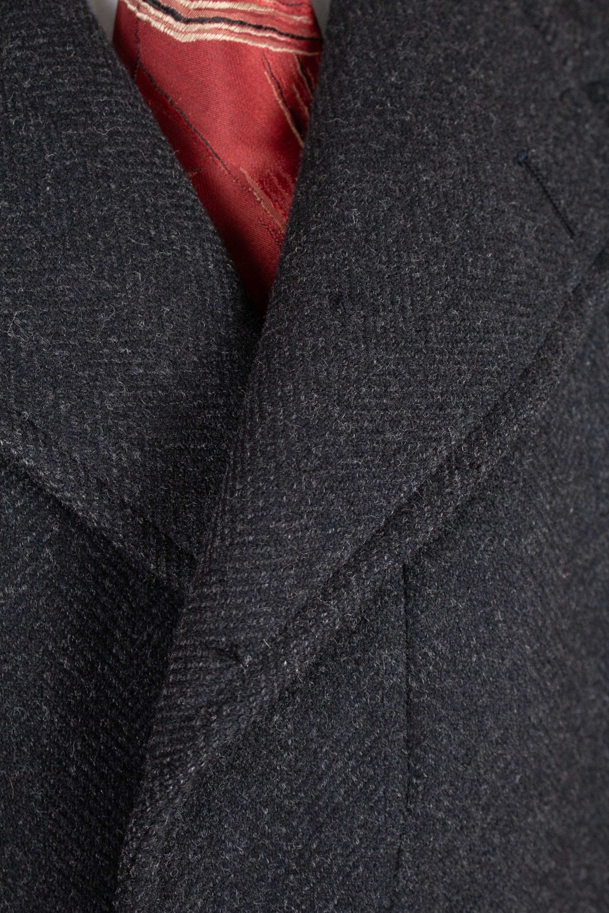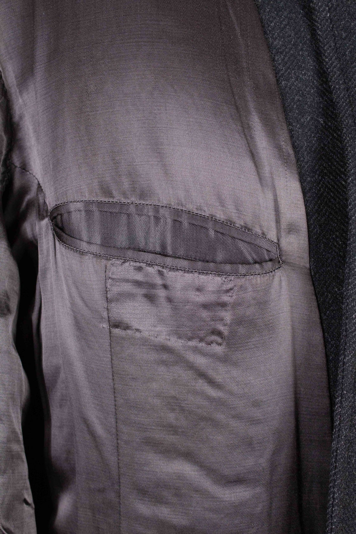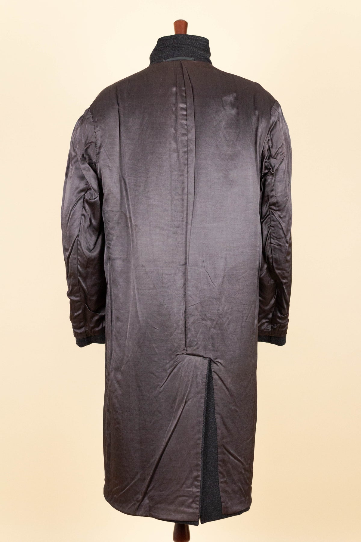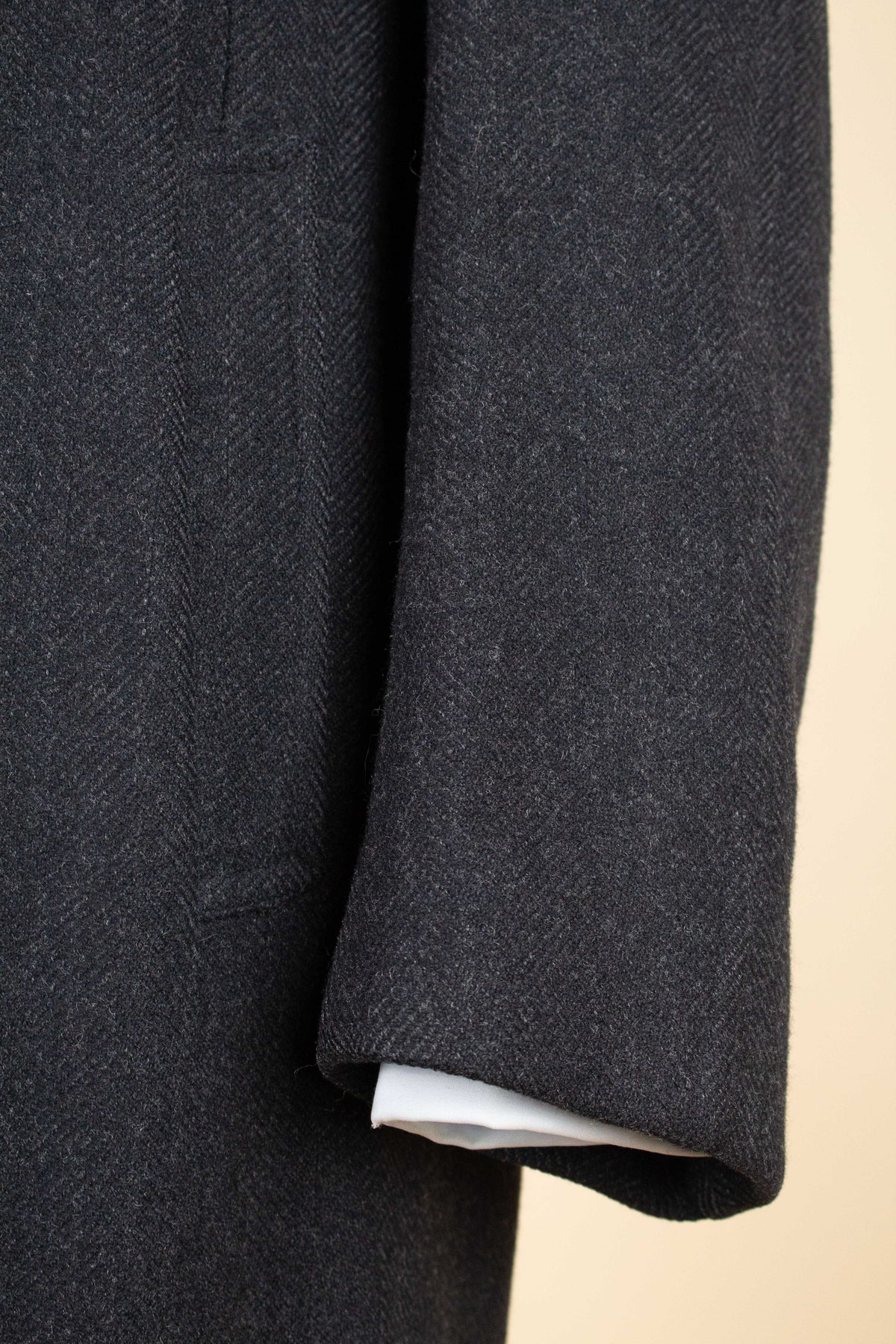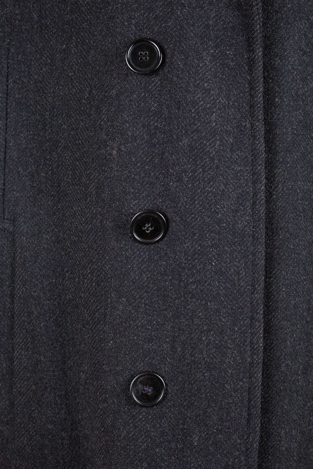 This coat has no labels, so it is not possible to say with certainty exactly who produced it. However, a number of conclusions can still be drawn from studying the garment. It is in all likelihood of Swedish origin and was produced sometime during the 1940s. It is made from a heavy dark grey wool cloth with a subtle herringbone pattern.