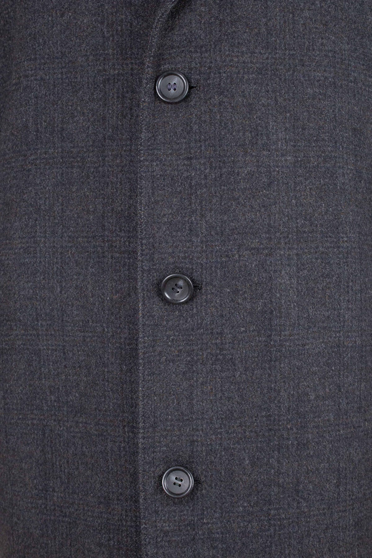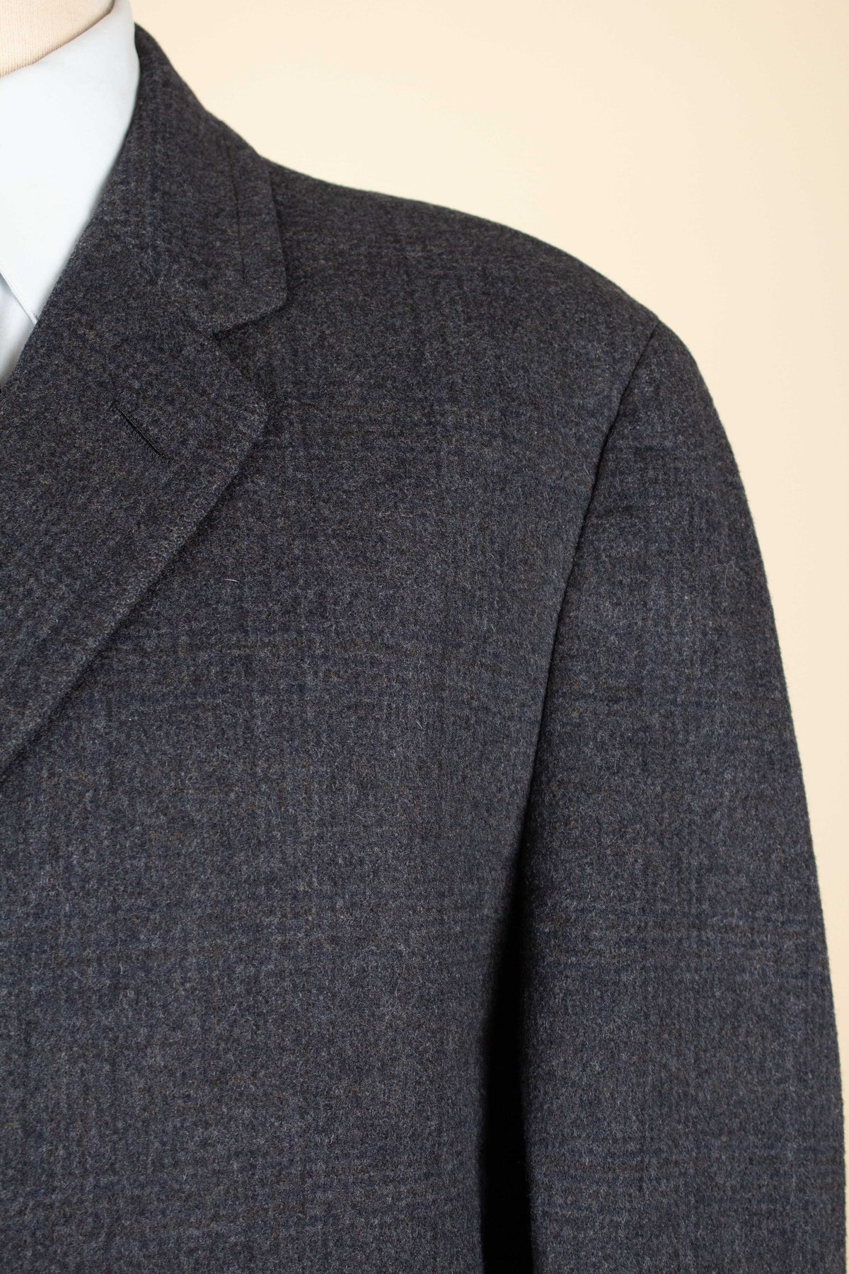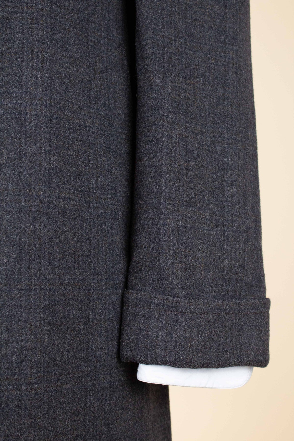 The coat is single-breasted and fastens with three buttons. It has slightly slanted front pockets and a buttonhole on the left lapel. The sleeve cuffs feature decorative turn-ups. The back is straight and has a vent. Inside, it is traditionally half-lined. It has a vertical jetted inner pocket on the left-hand side. Overall, the interior construction is very well executed.