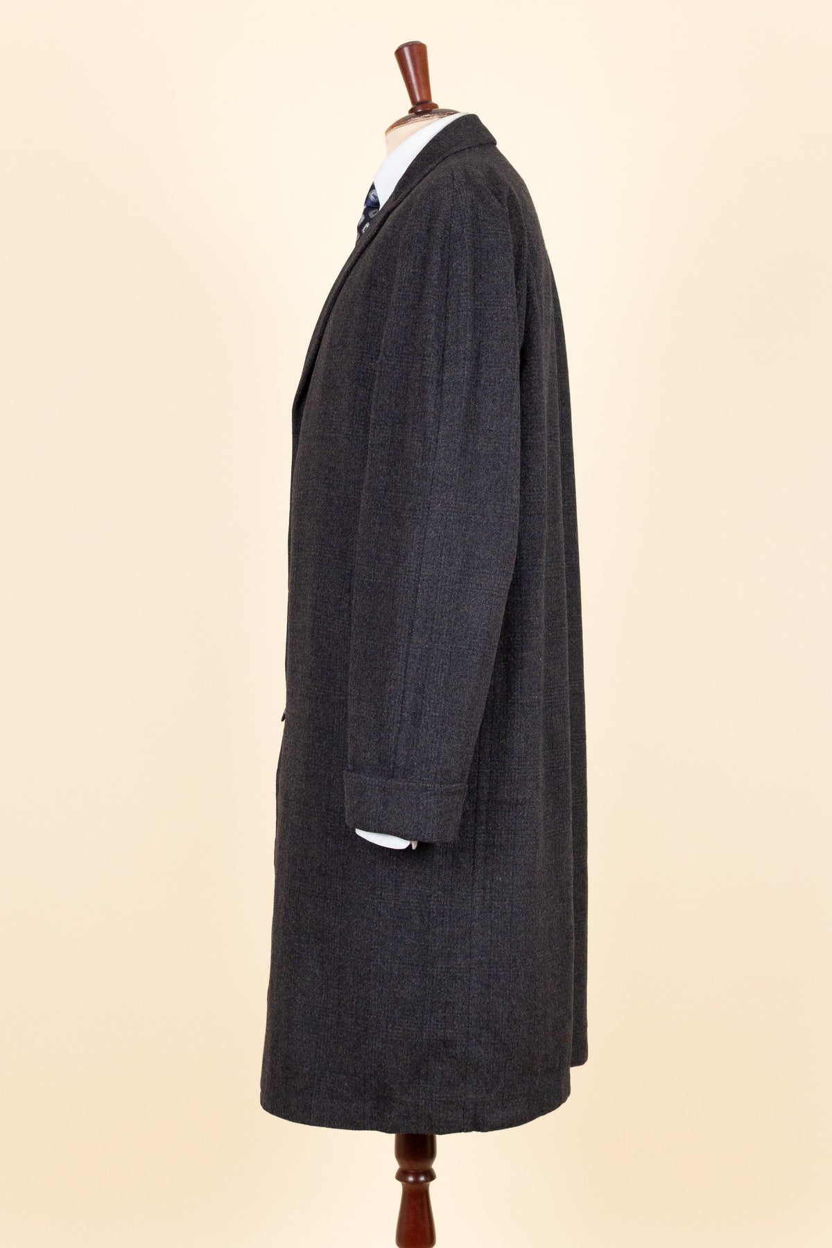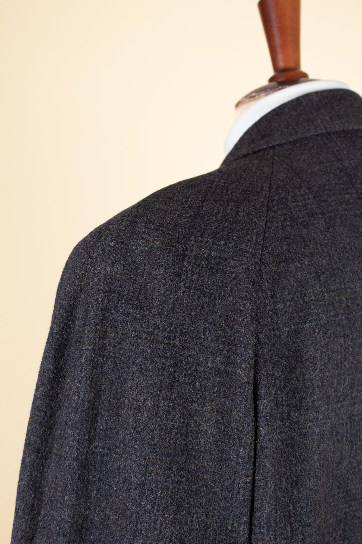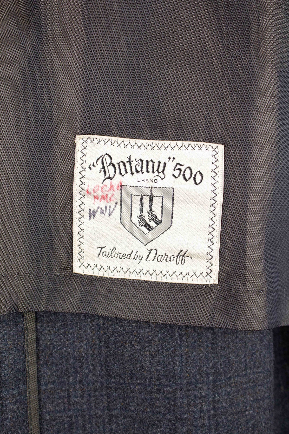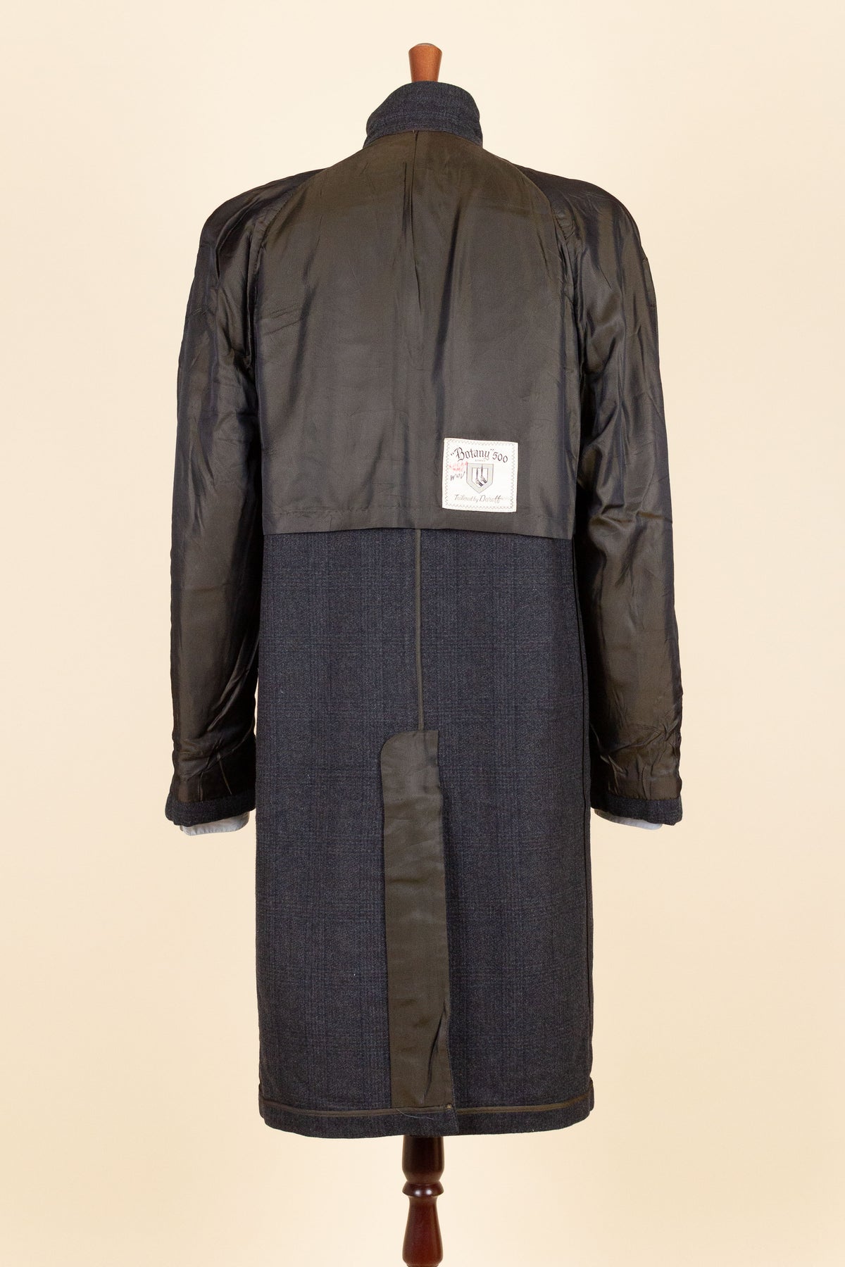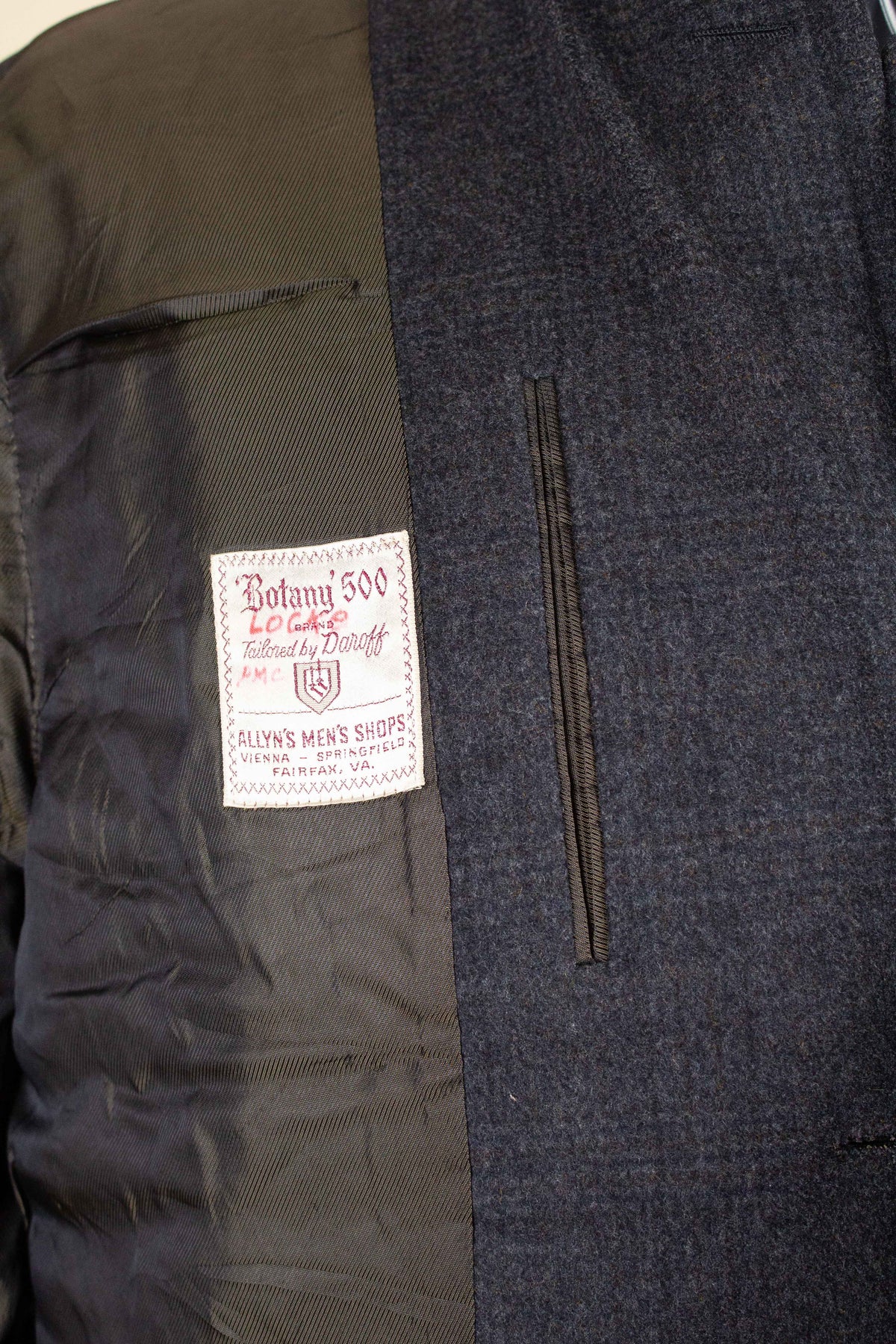 This coat is of American origin. It was produced by Daroff, most likely in the late 1950s, and was originally sold new by a store called Allyn’s Mens Shop in Springfield, Virginia. It is tailored from a dark grey wool cloth with a subtle Glen check pattern.