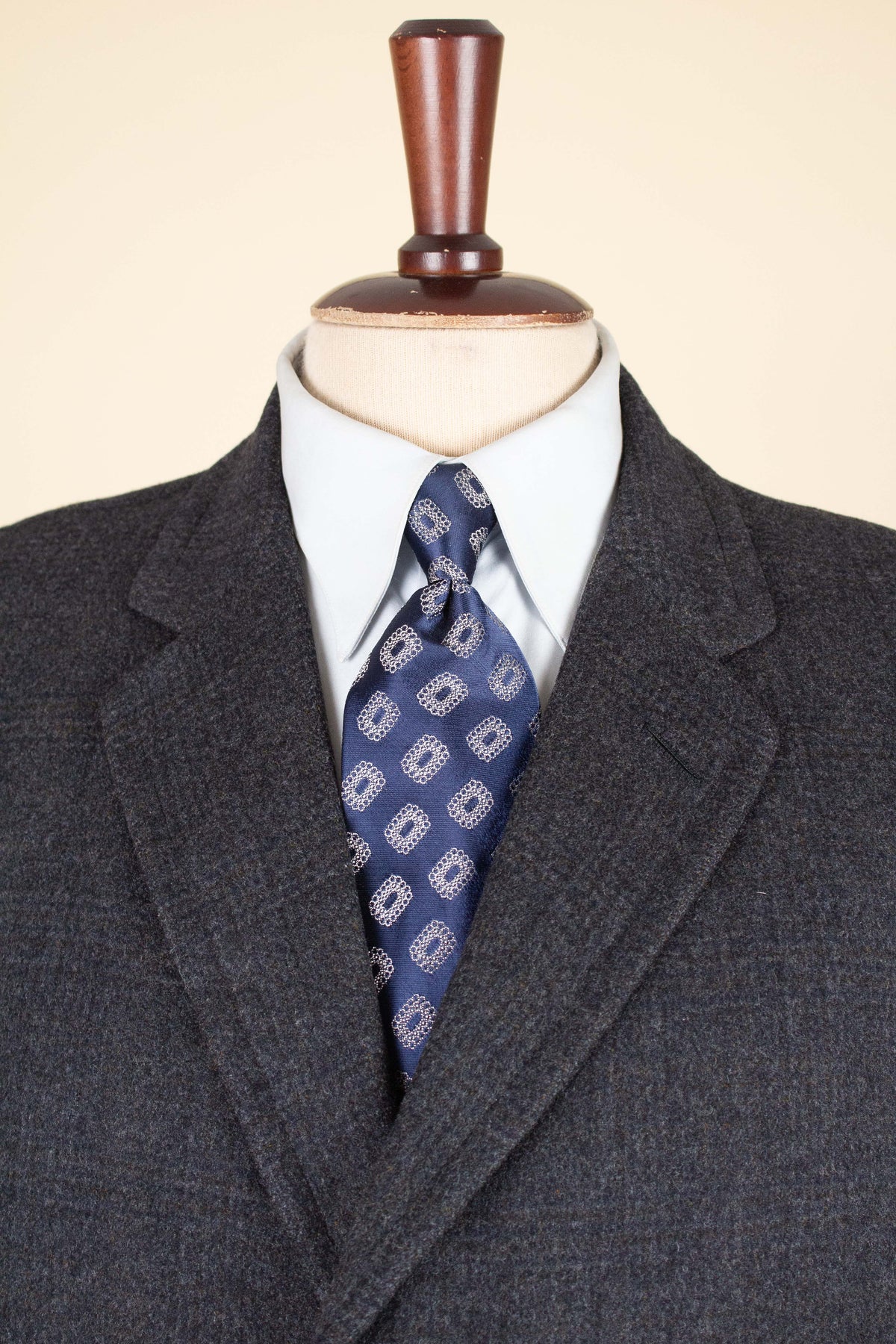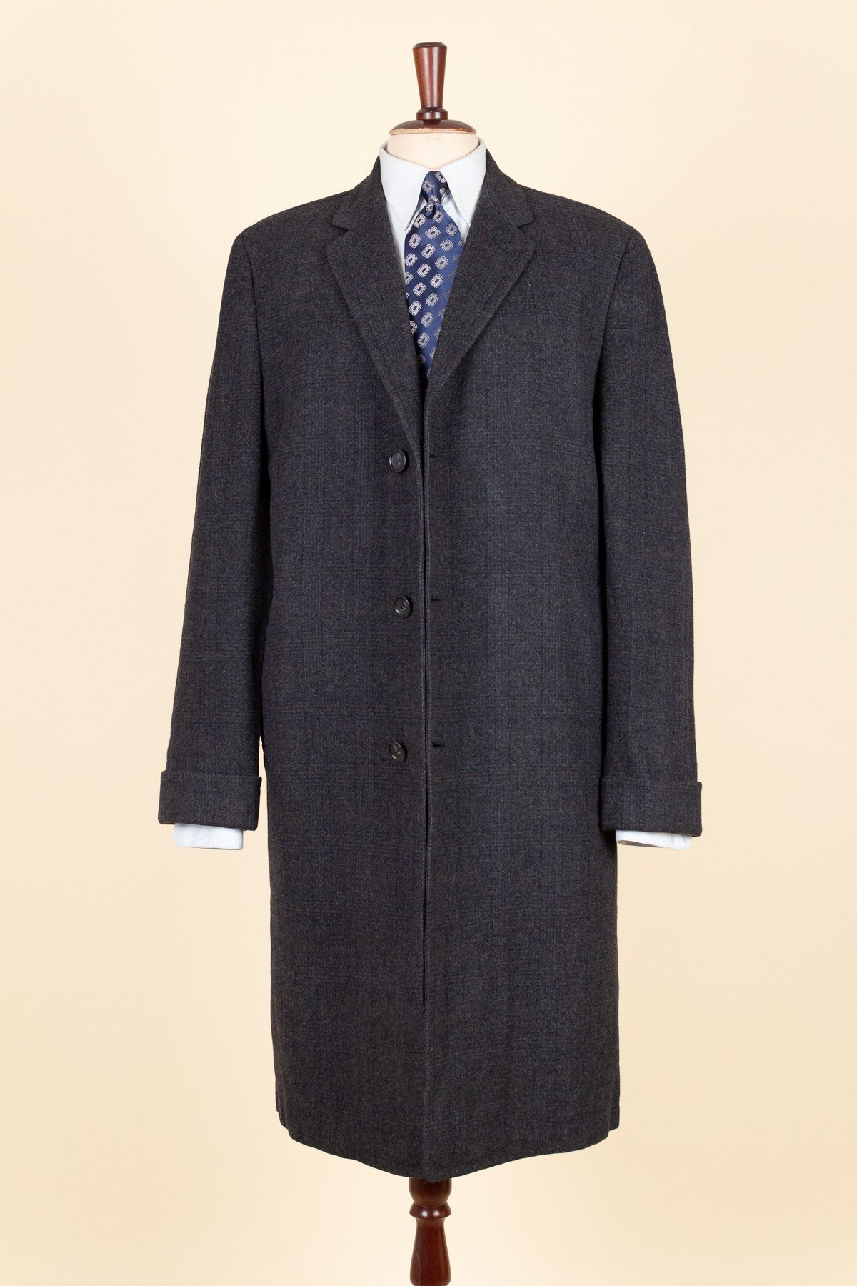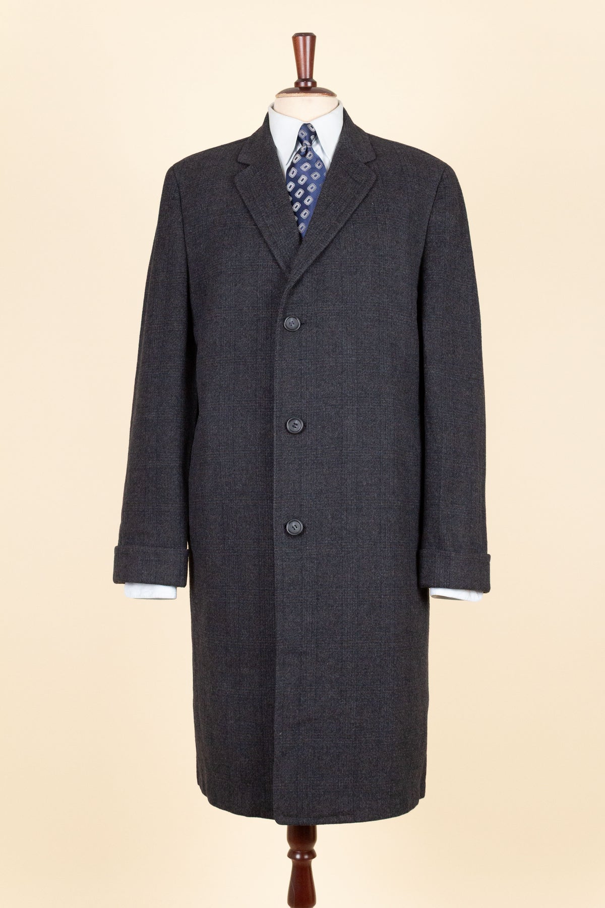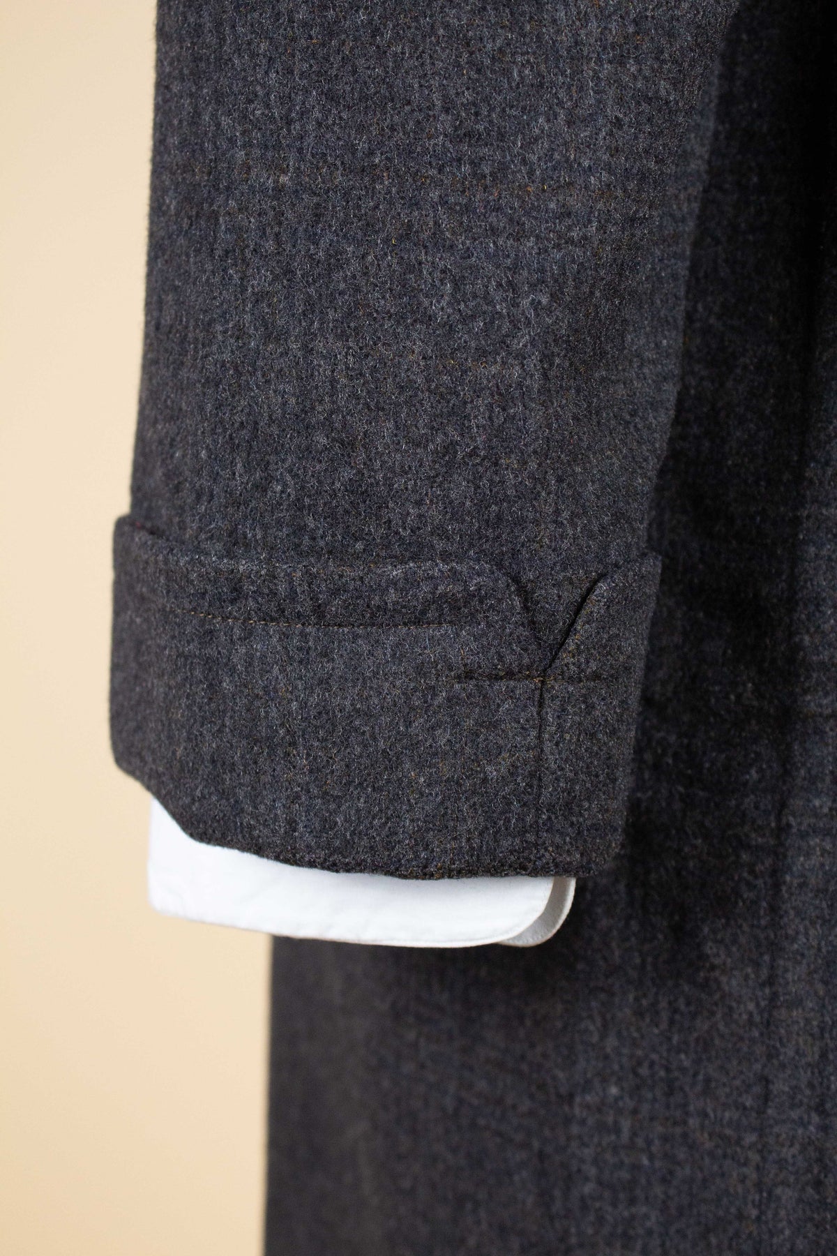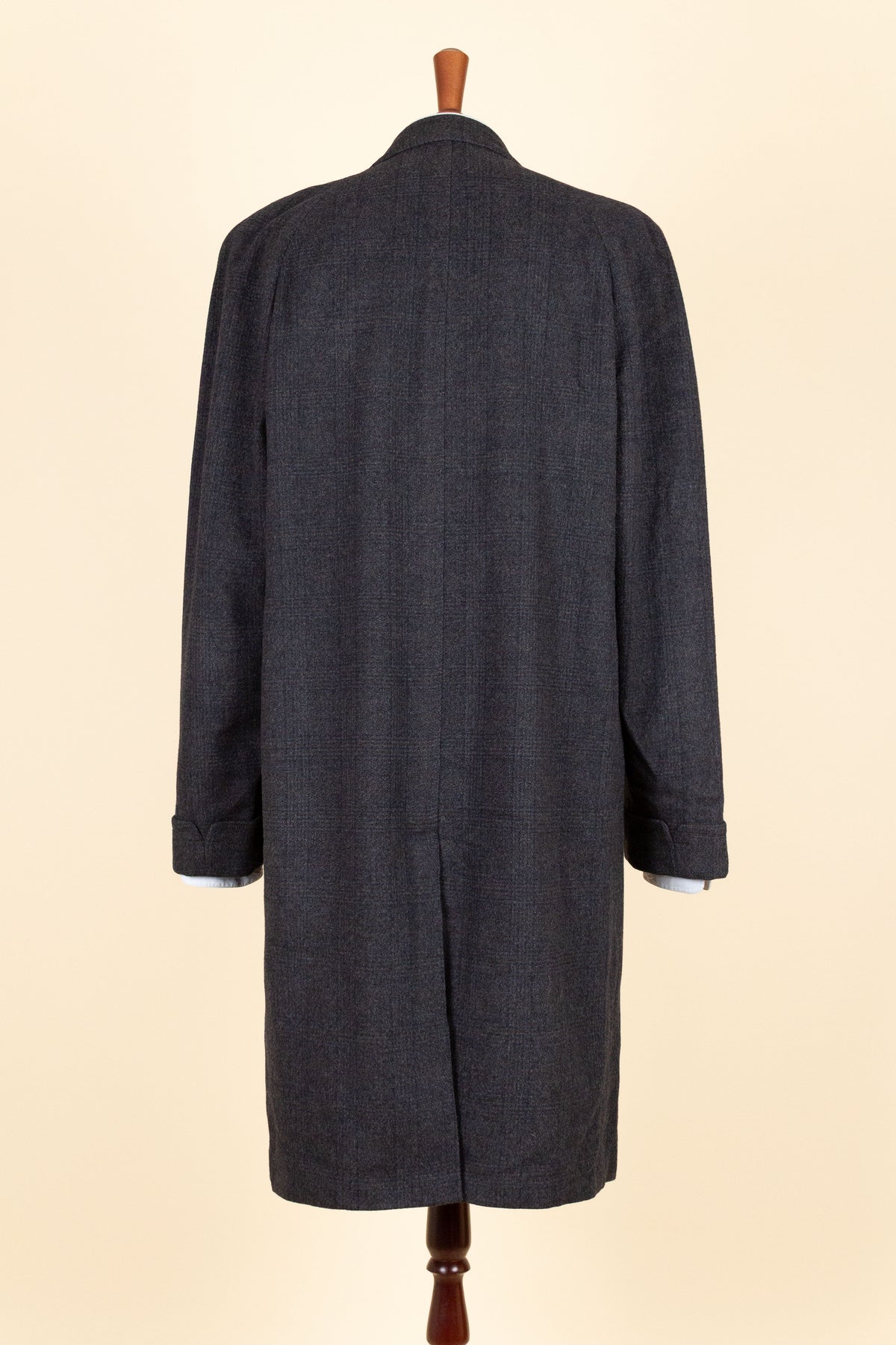 This coat is of American origin. It was produced by Daroff, most likely in the late 1950s, and was originally sold new by a store called Allyn’s Mens Shop in Springfield, Virginia. It is tailored from a dark grey wool cloth with a subtle Glen check pattern.