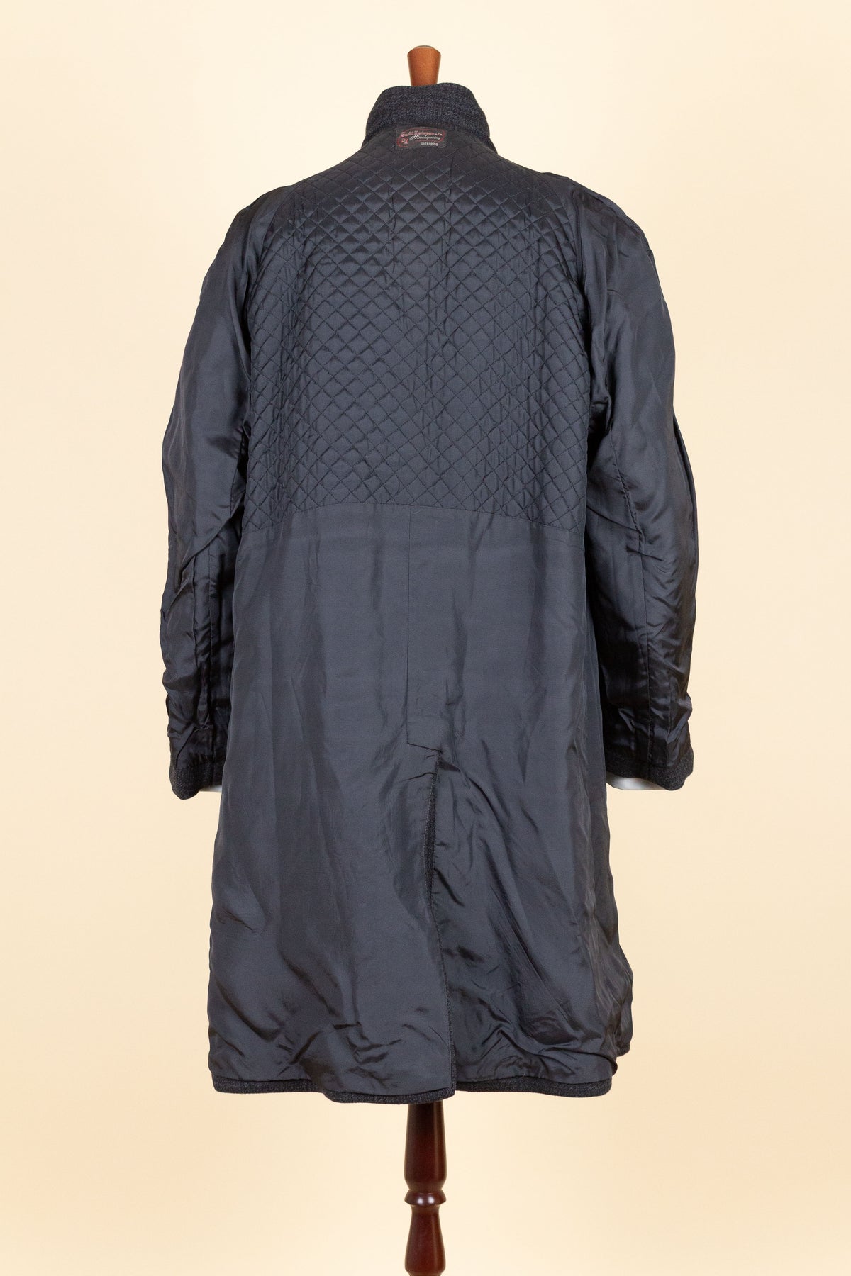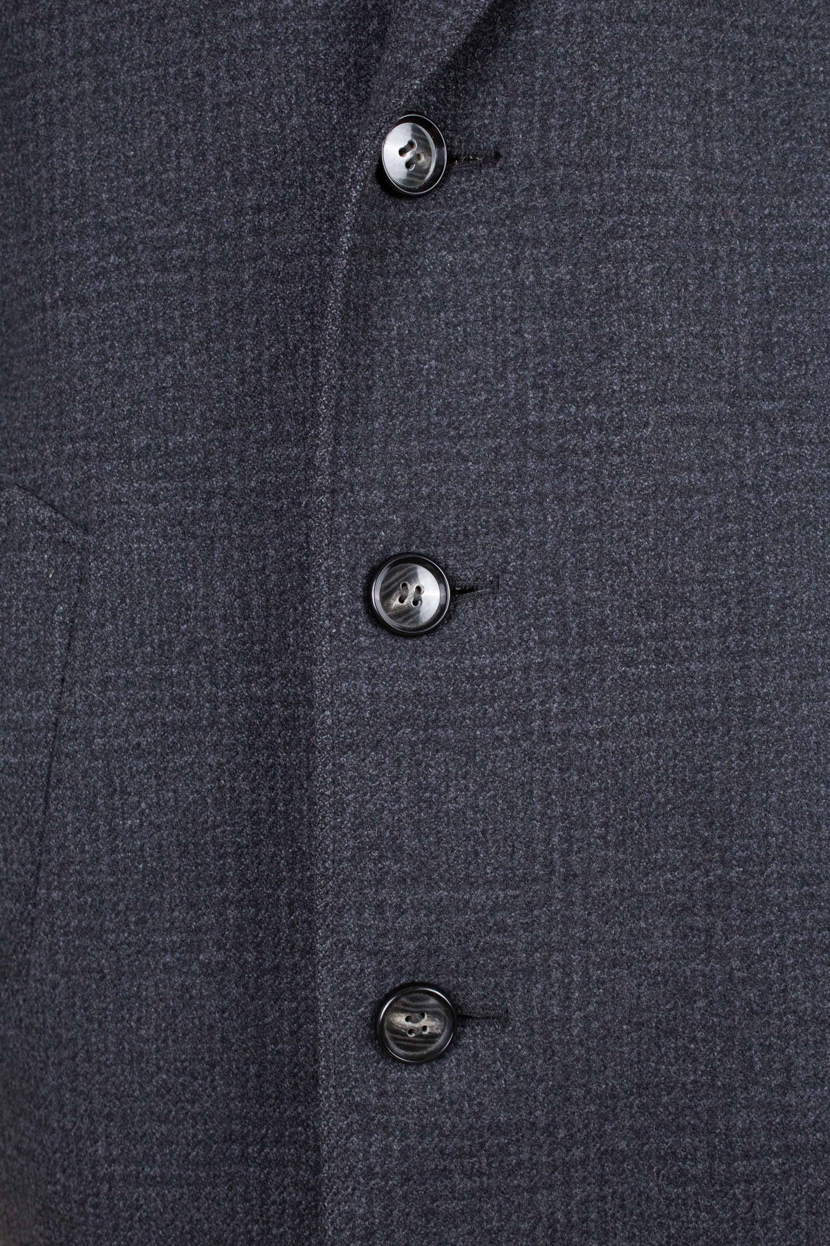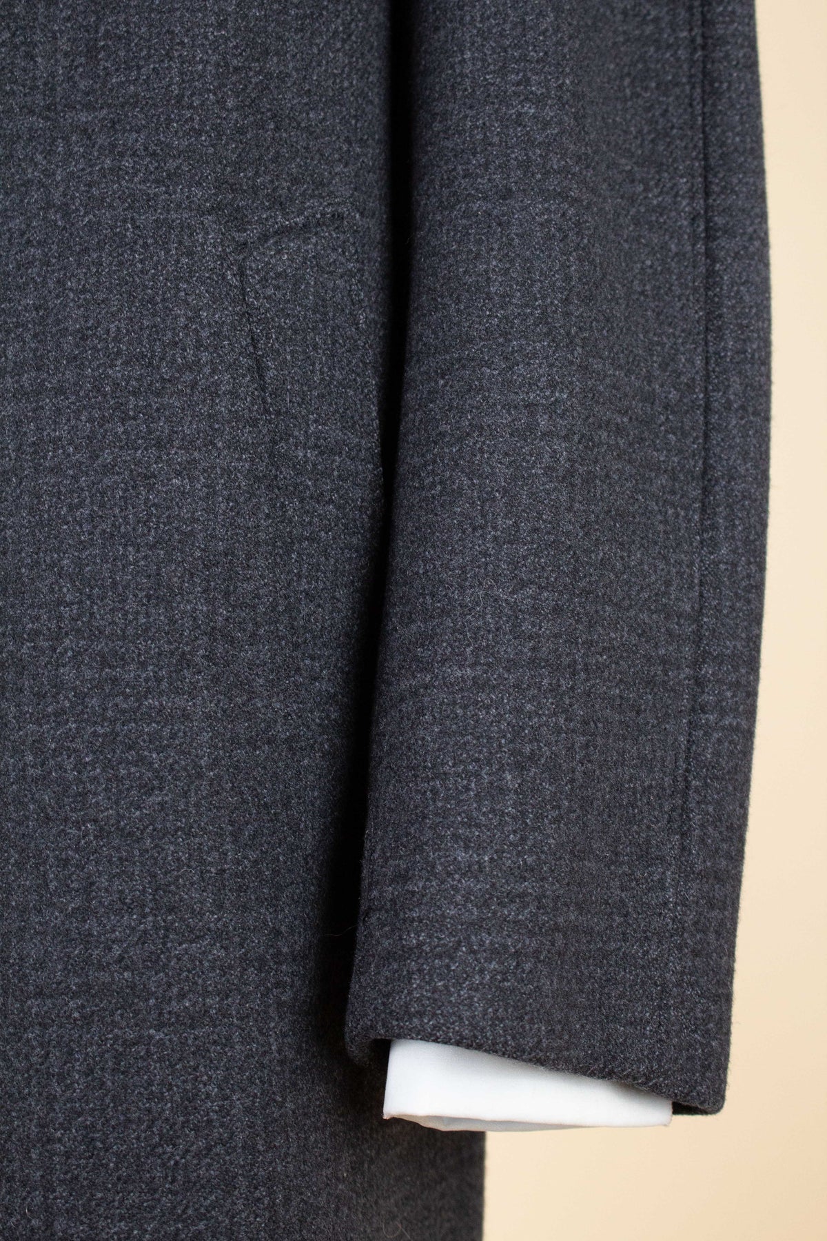 The coat is single-breasted and fastens with three buttons. It features slightly slanted front pockets and has a buttonhole on the left lapel. The back is straight with a vent. Inside, it is fully lined and has a partially quilted lining. On the left-hand side there is a vertical internal pocket with piping.