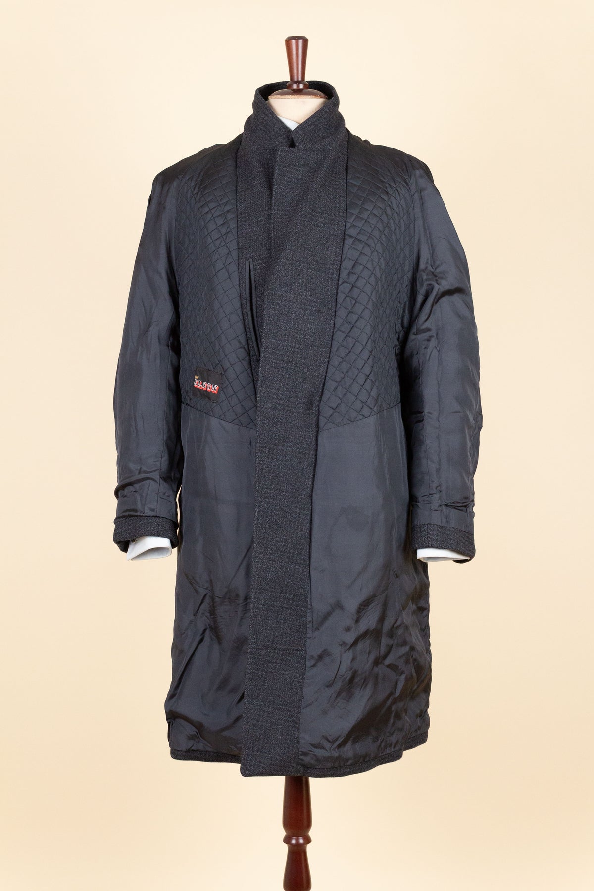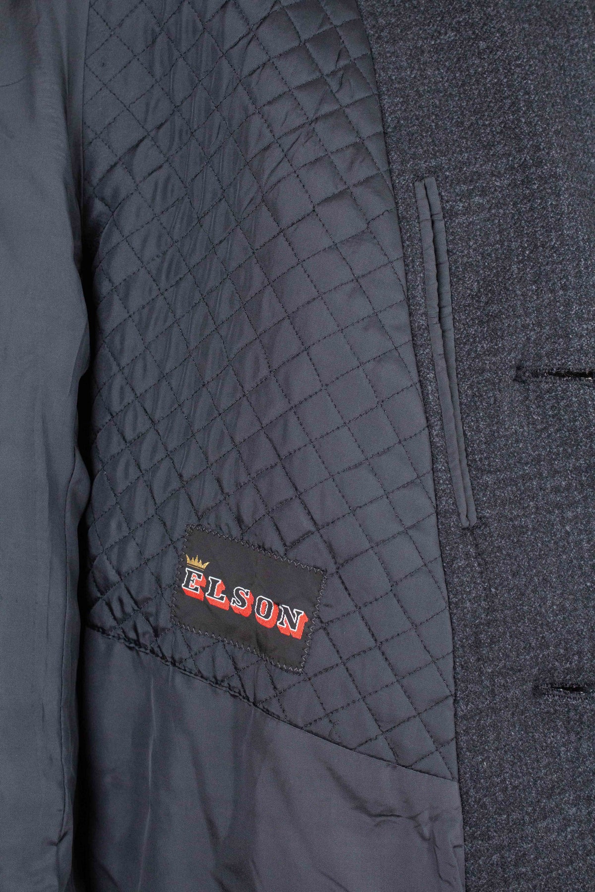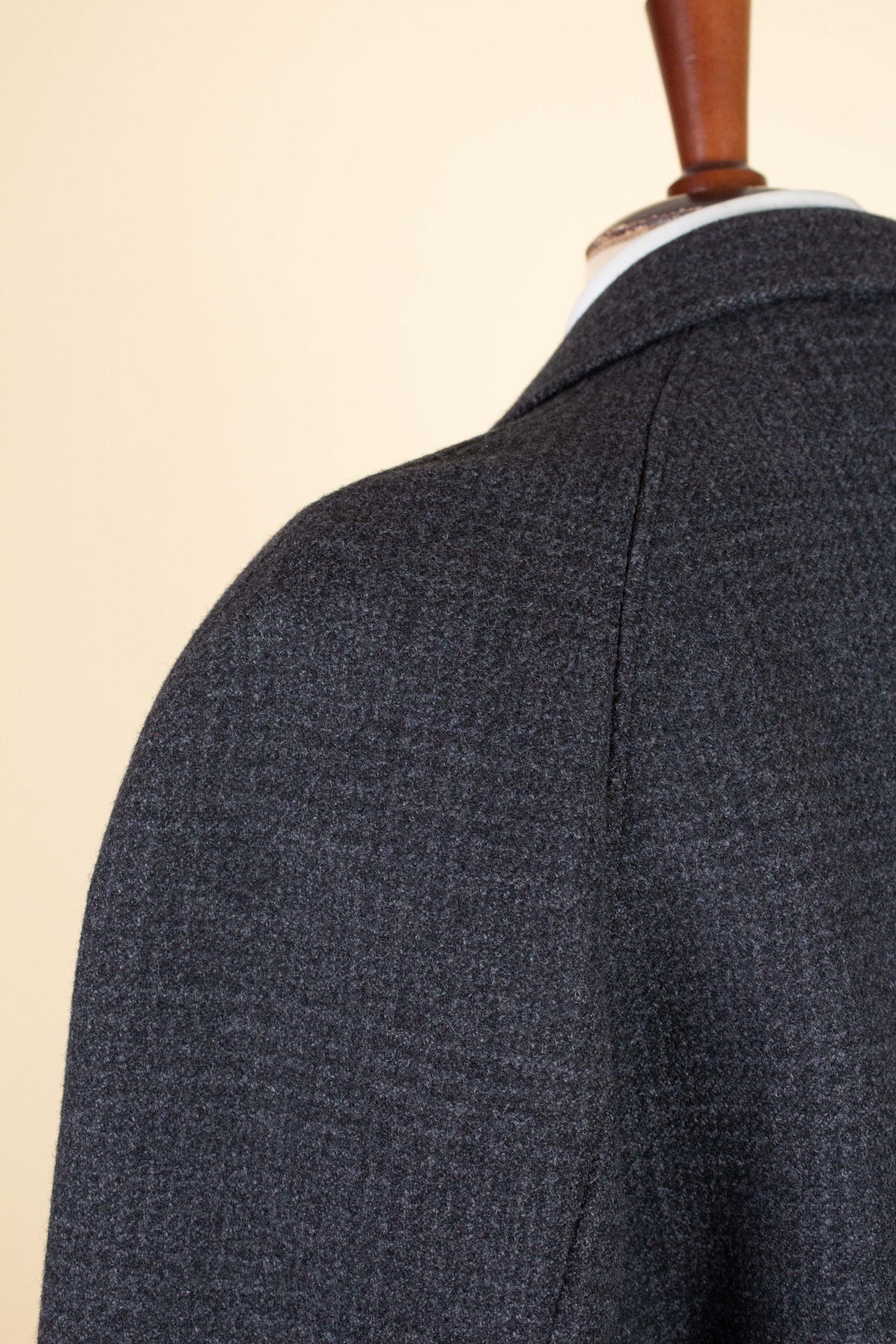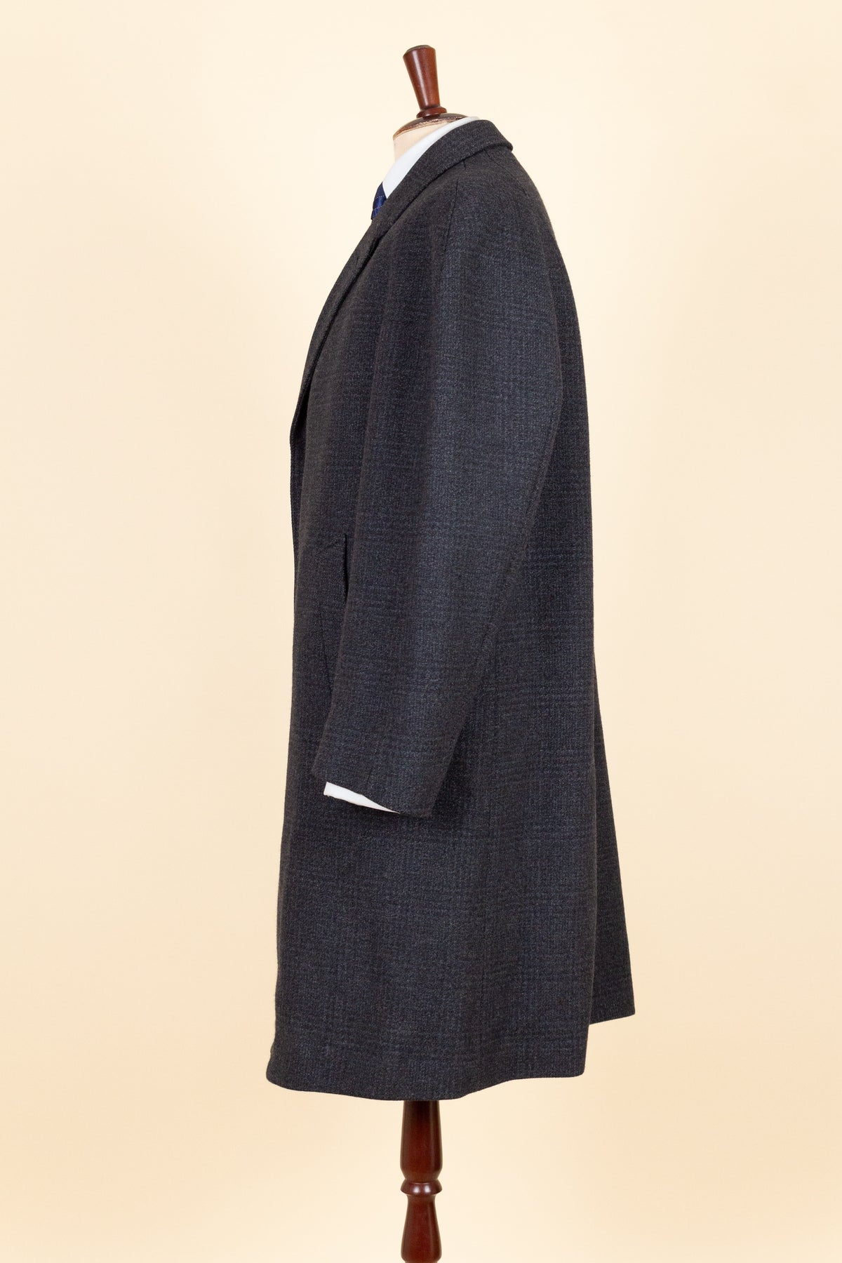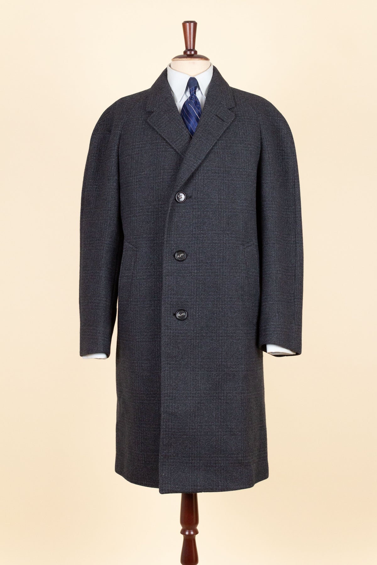 This raglan coat is of Swedish origin. It is by the brand Elson and was most likely produced in the late 1950s or possibly the early 1960s. It is made from a grey wool fabric with a subtle Glen check pattern.