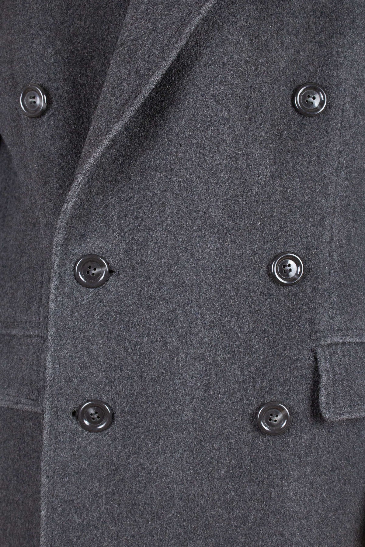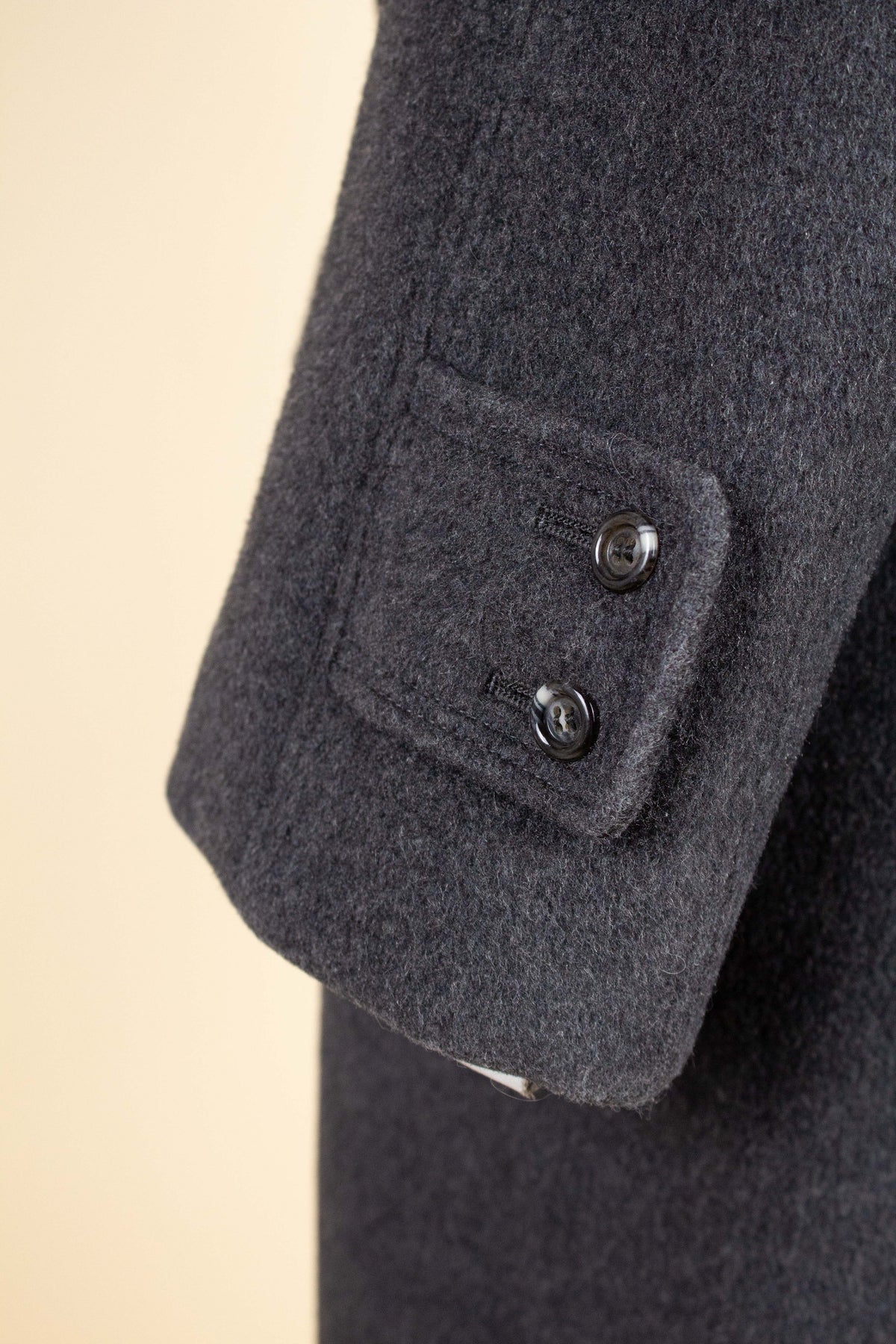 The coat is double-breasted with three rows of buttons, two of which are functional. It features horizontal front pockets with flaps. Each lapel has a buttonhole.At the cuffs, there are decorative buttoned tabs. The back is straight and includes a centre vent. Internally, the coat is fully lined and has an inside pocket on the left-hand side.