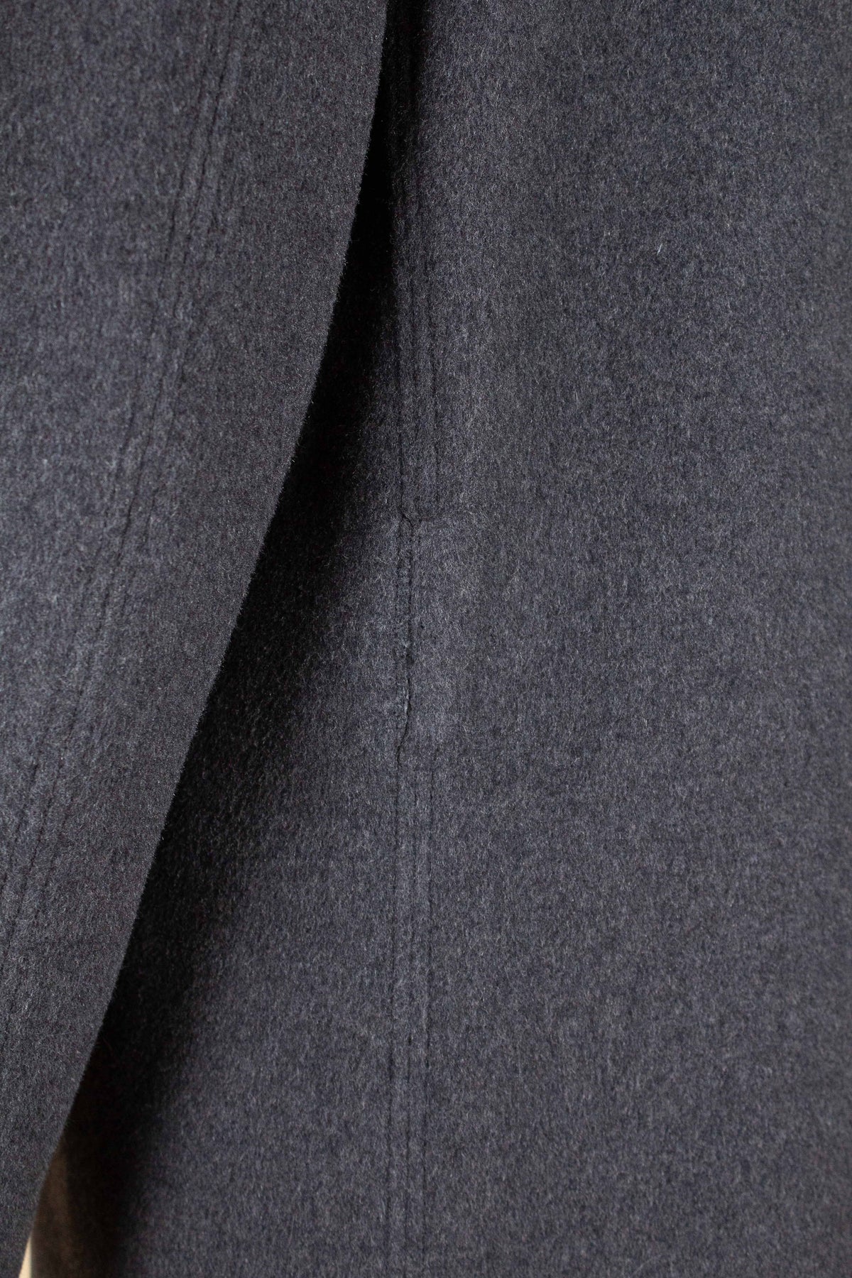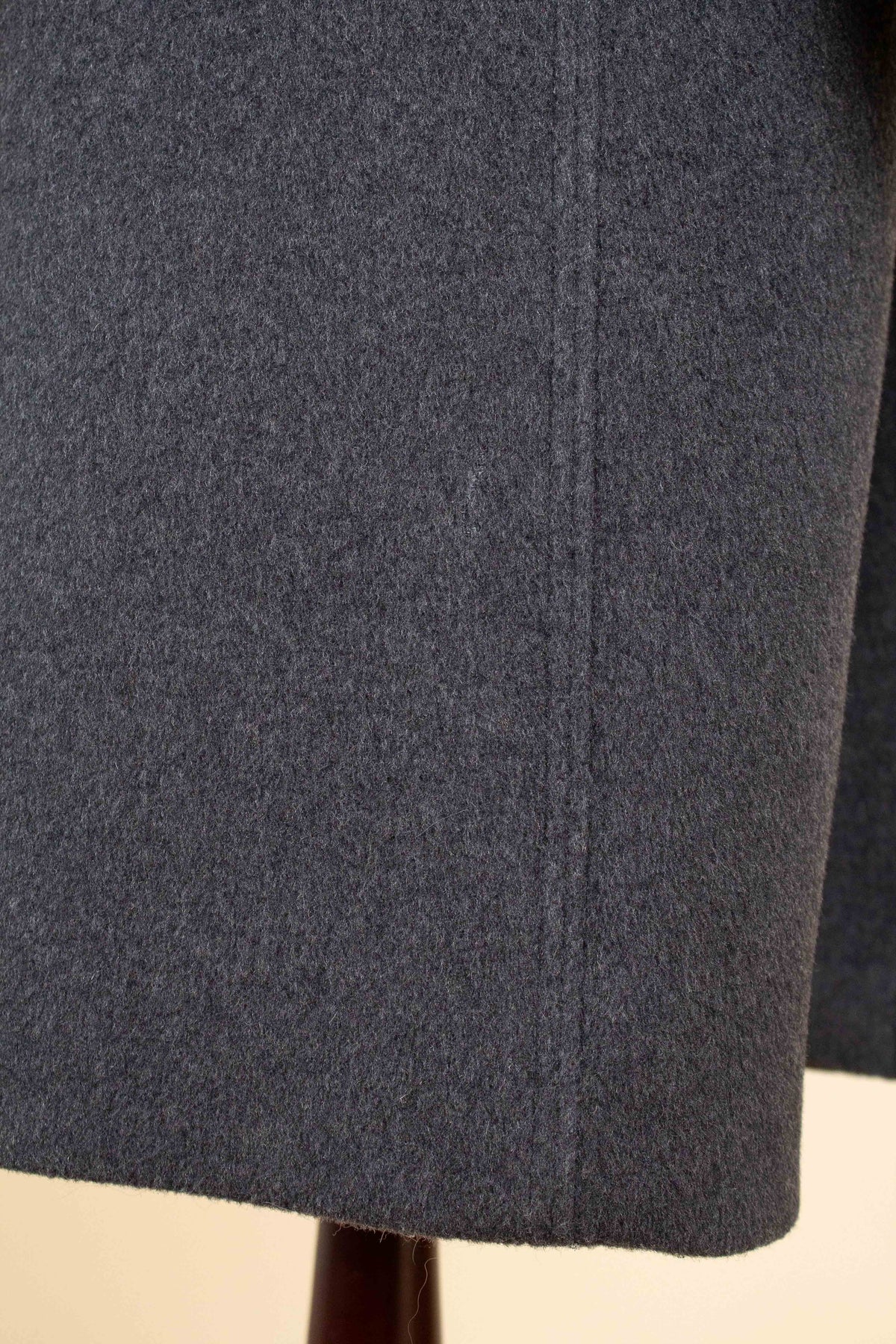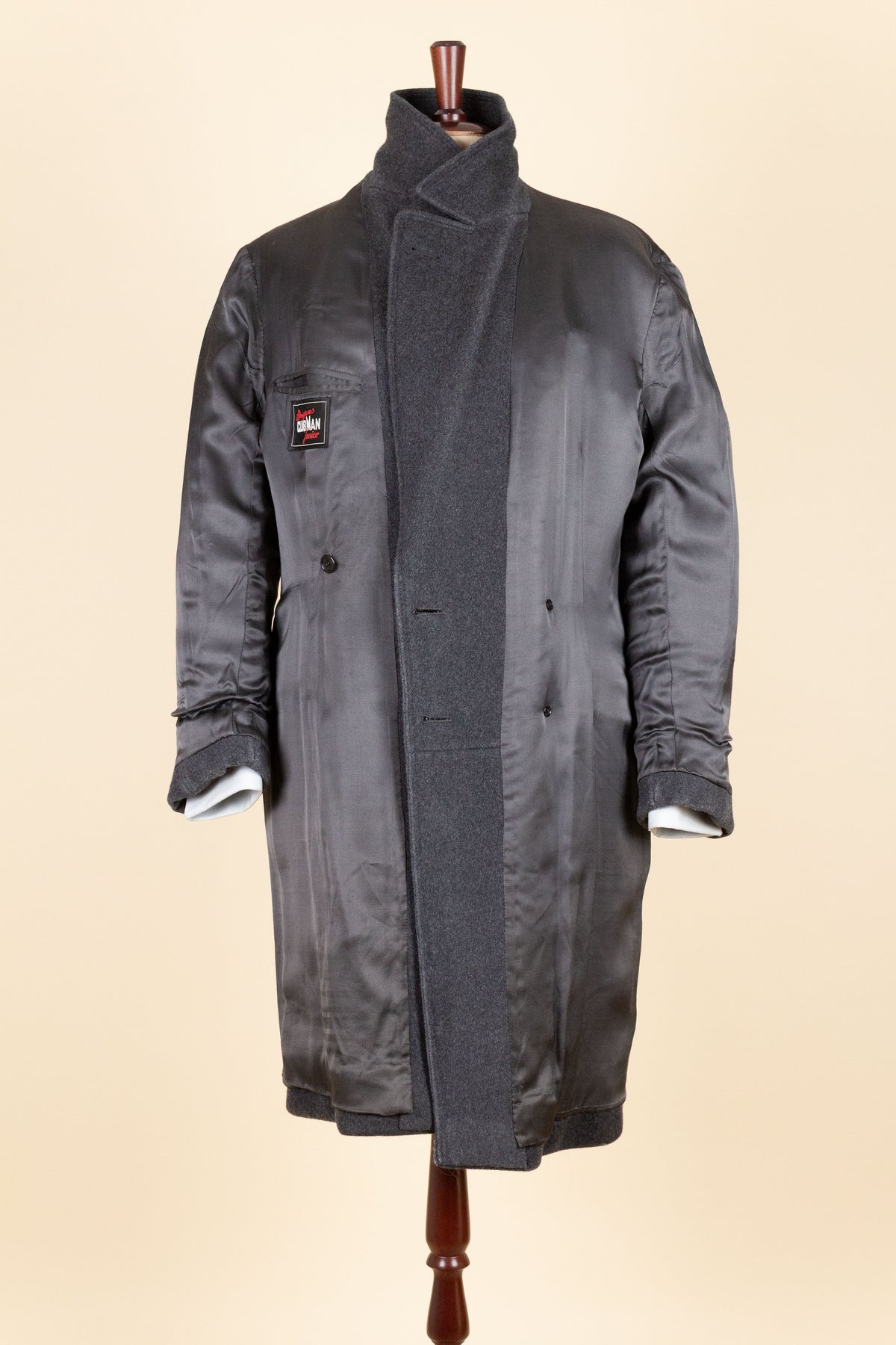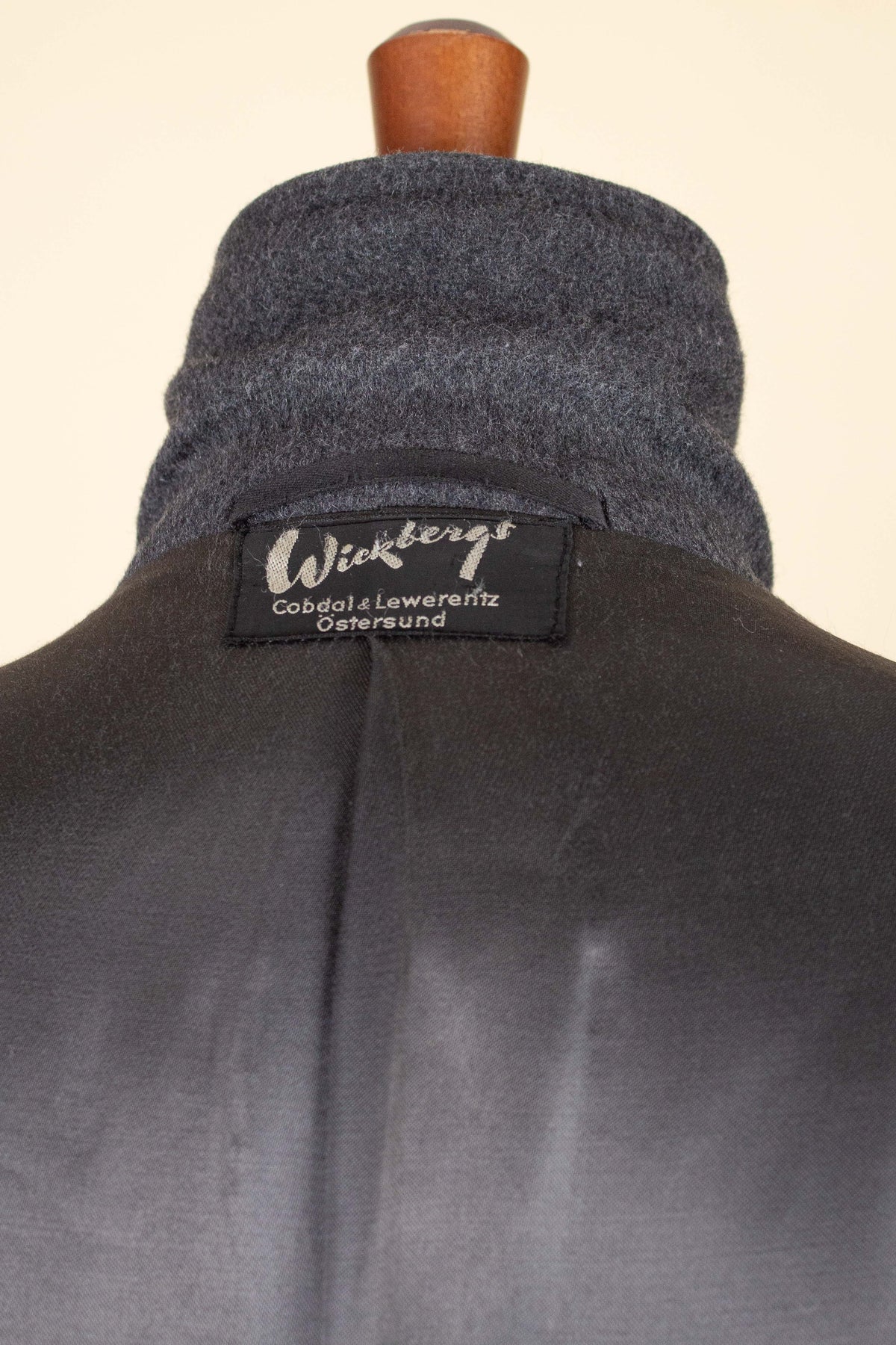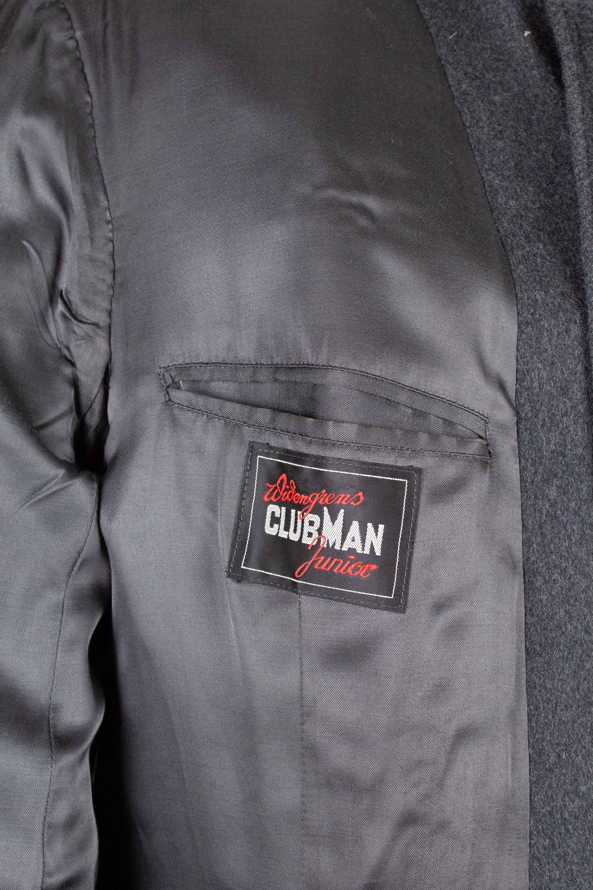 This coat is of Swedish origin. It was produced sometime during the 1940s or 1950s and is by the brand Clubman, a label manufactured by Widengrens, a well-known Swedish clothing company. It was originally sold new in a shop called Wickbergs in Östersund, in central Sweden. The coat is made from a soft grey wool fabric.