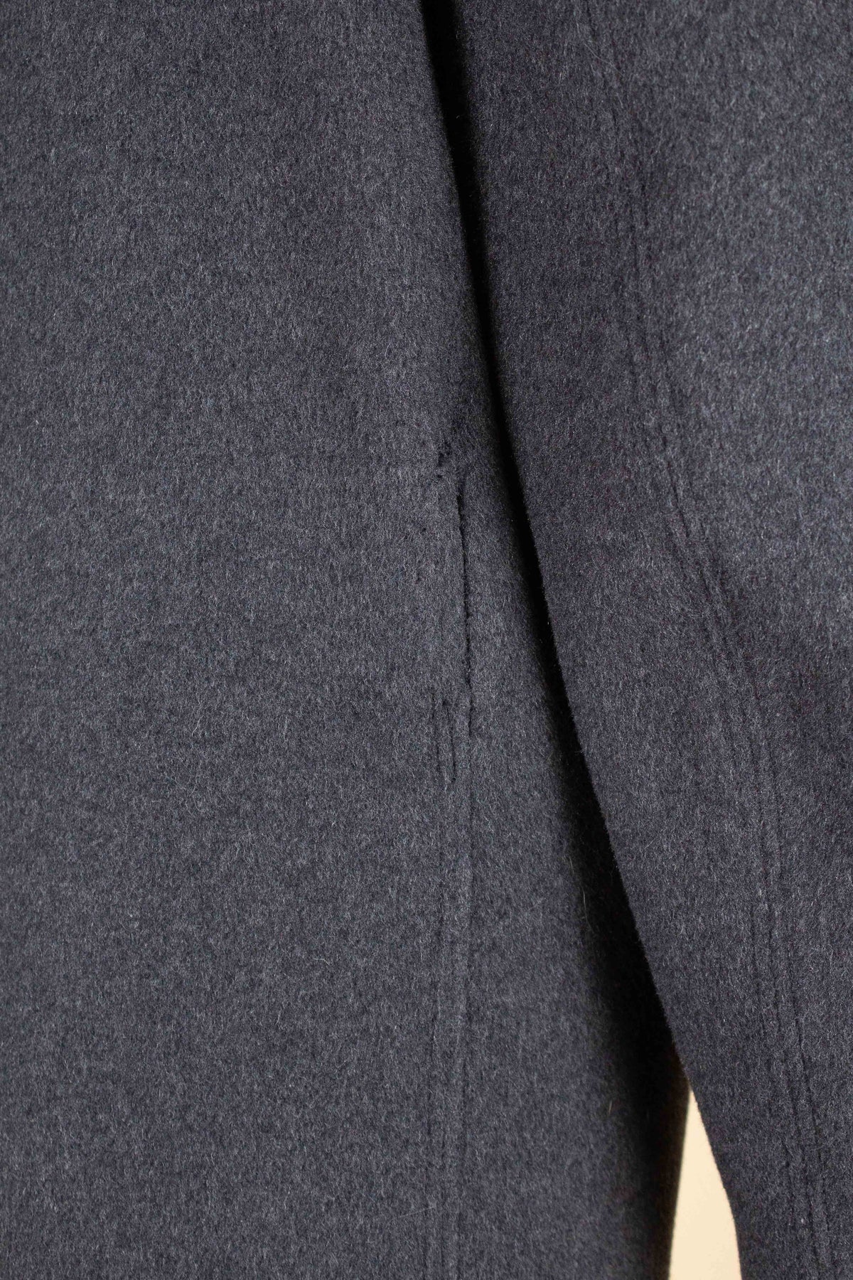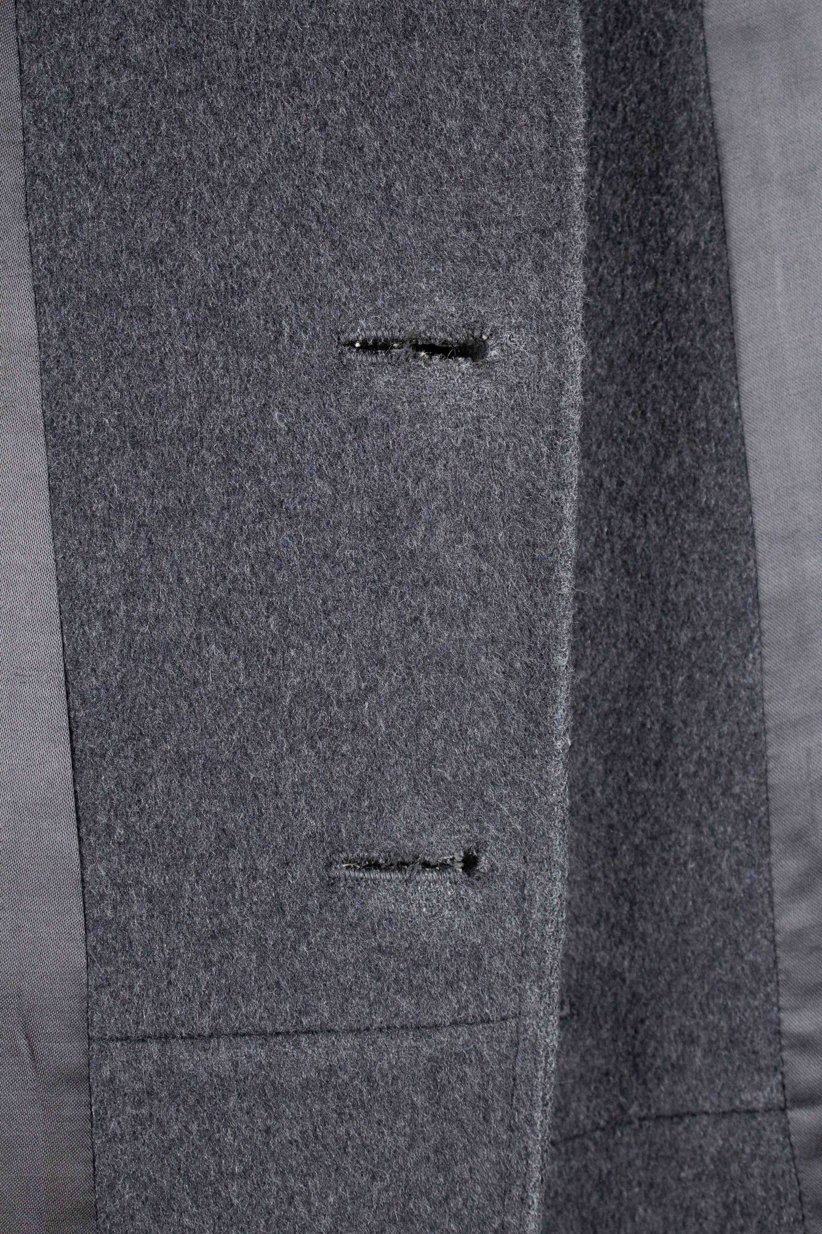 Regarding condition, there are a few points to note. Overall, the condition is good. There is some minor wear to the buttonholes, and there is a small moth hole on the side of the coat; however, this does not affect the overall appearance when worn. On close inspection of the back, it is possible to see in the side seams that the coat originally had a belt (see photos). This is not immediately noticeable, and the coat functions perfectly well without a belt, but it is still something worth mentioning. Please study the photographs carefully and form your own opinion of the condition.