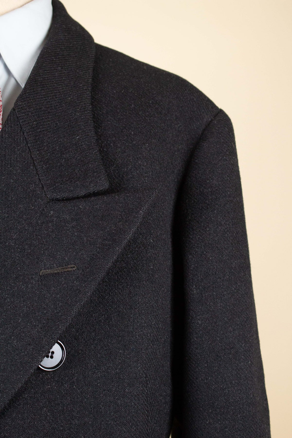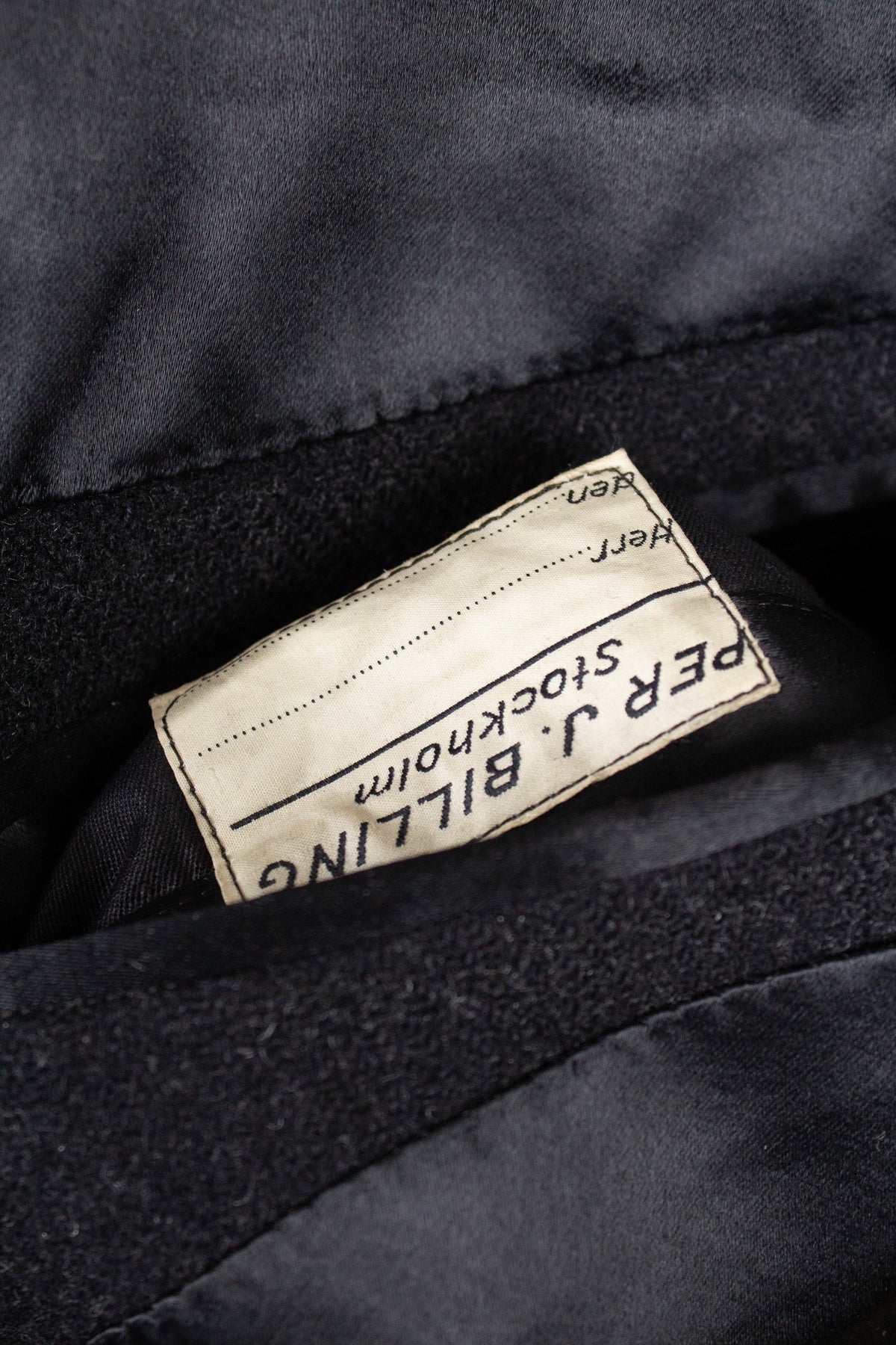 This coat is of Swedish origin and was made by the tailor Per J. Billing. We are not familiar with this atelier, but according to the label it was based in Stockholm. Unfortunately, the name and date fields on the label have been left blank, but the coat was most likely made around 1950. It is crafted from a black wool fabric with a subtle twill texture.