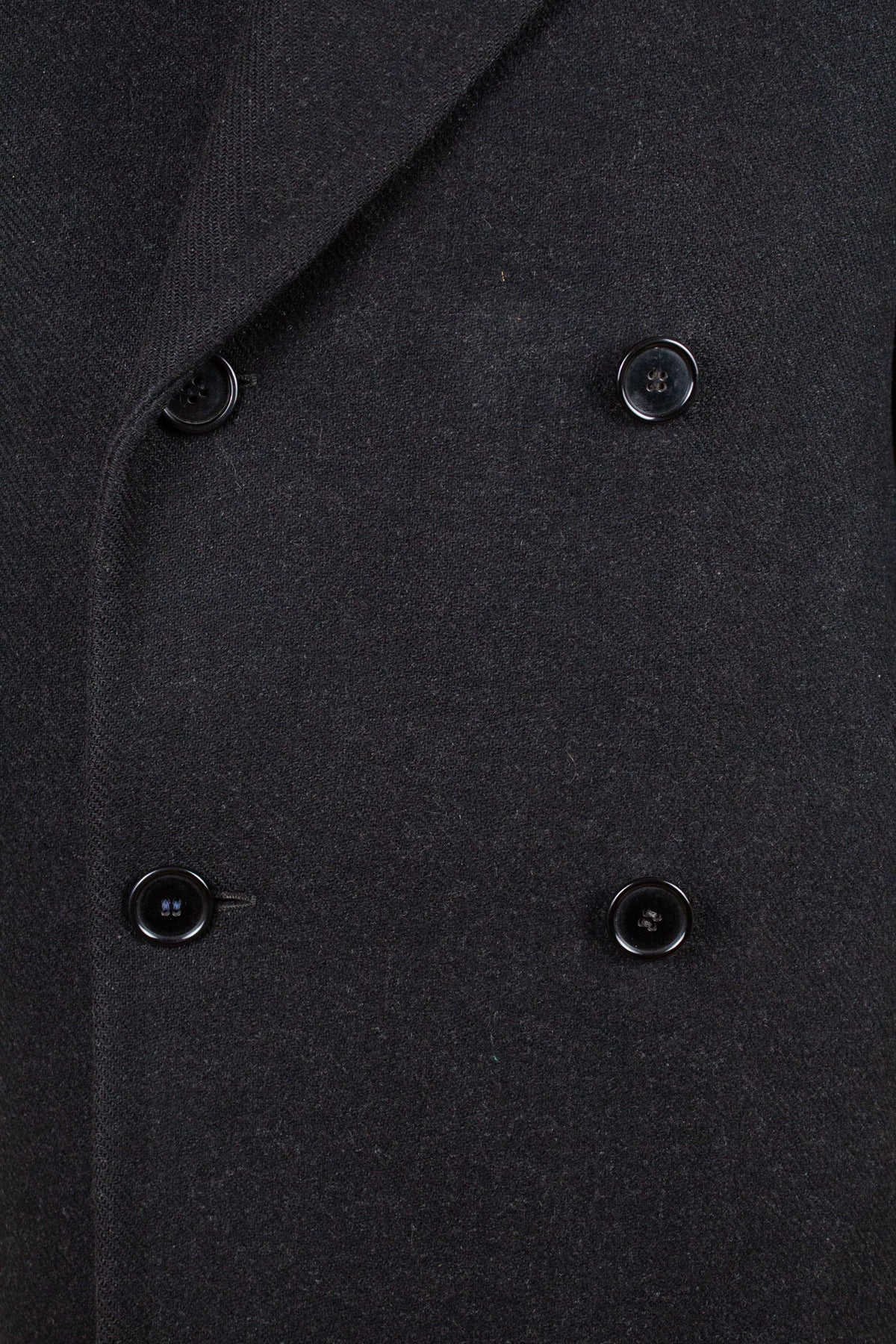 The coat is double-breasted with three rows of buttons. It features horizontal front pockets with flaps and a buttonhole on each lapel. The back is straight with a single vent. The interior is fully lined and has two inner pockets – one on each side.